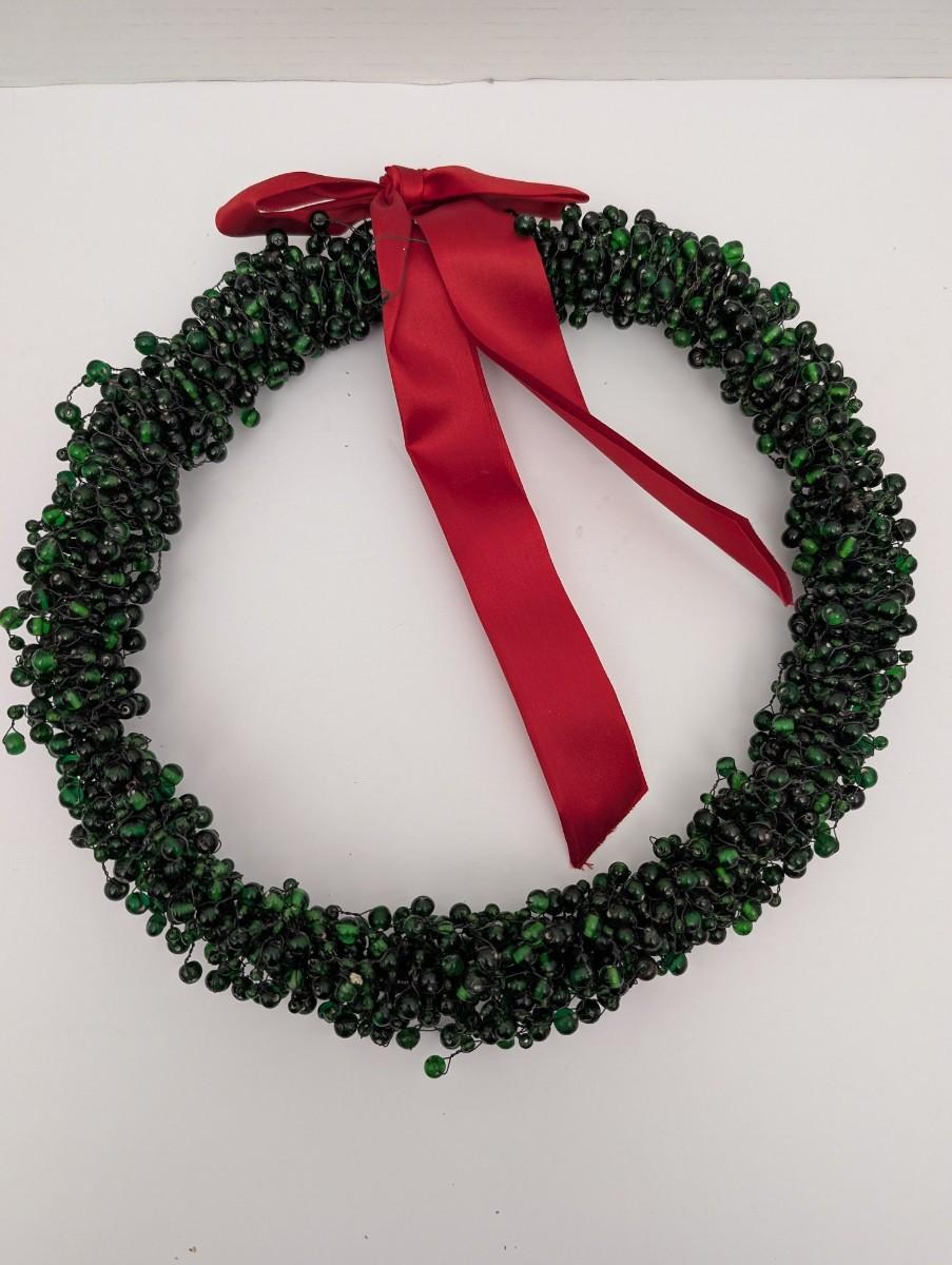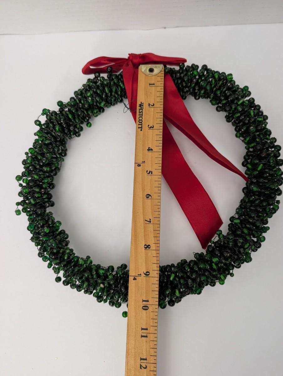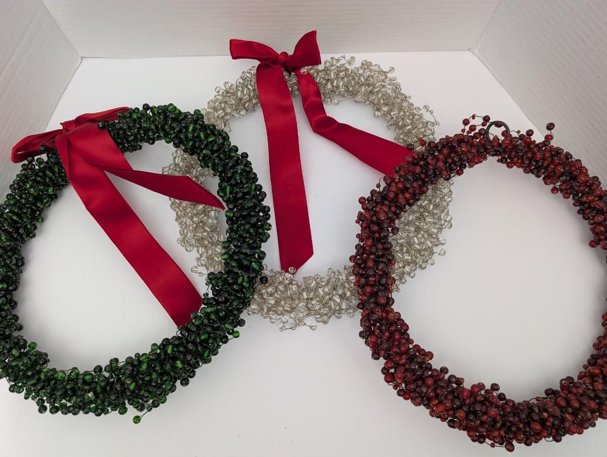 Set Of 3 Beaded Holiday Wreaths With Red Ribbon Bows Green Clear Red
