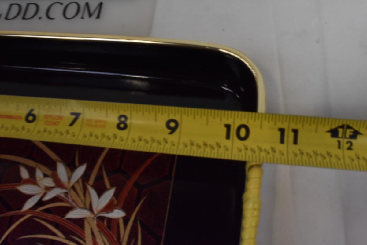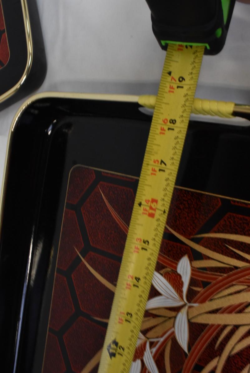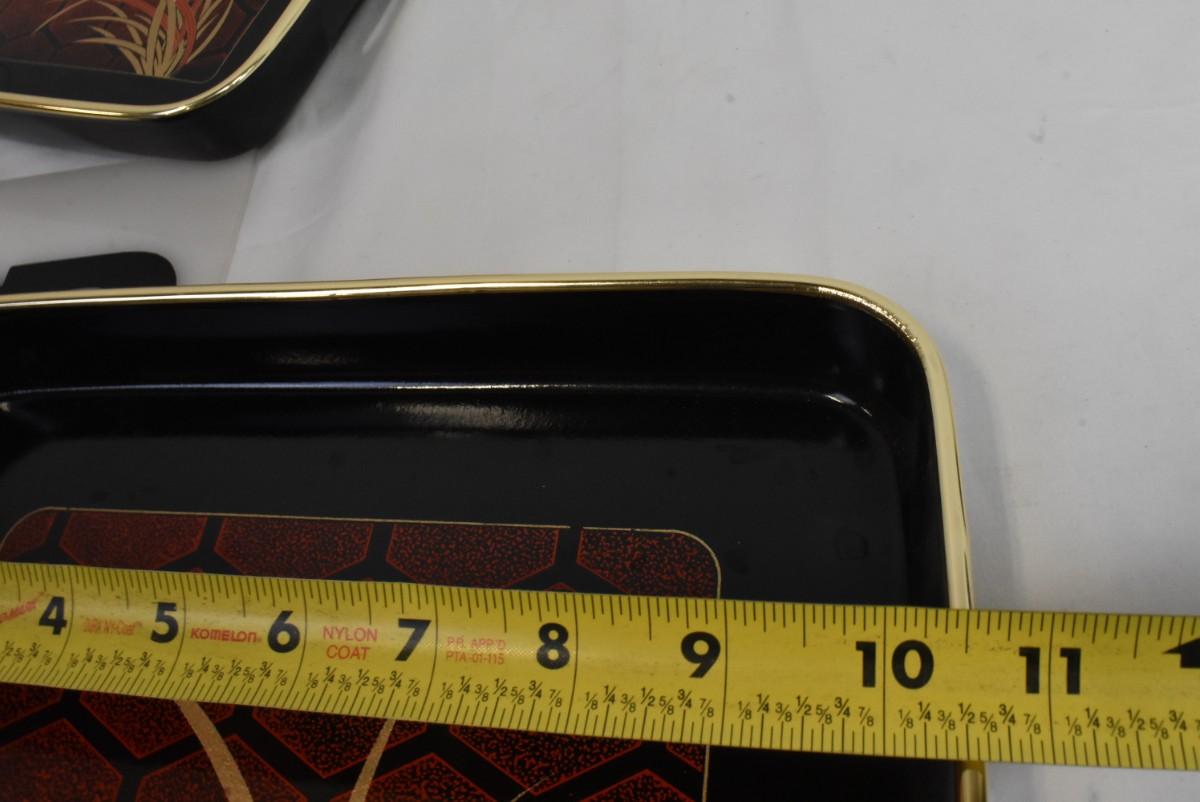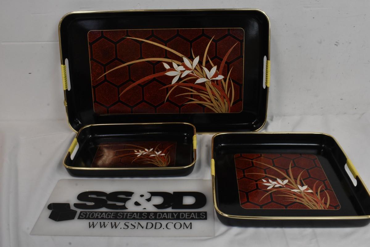 Set of 3 Black Serving trays w/ gold trim, lacquered look with Oriental design