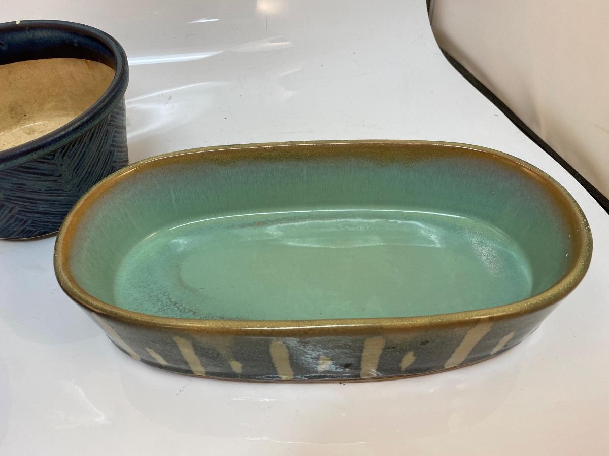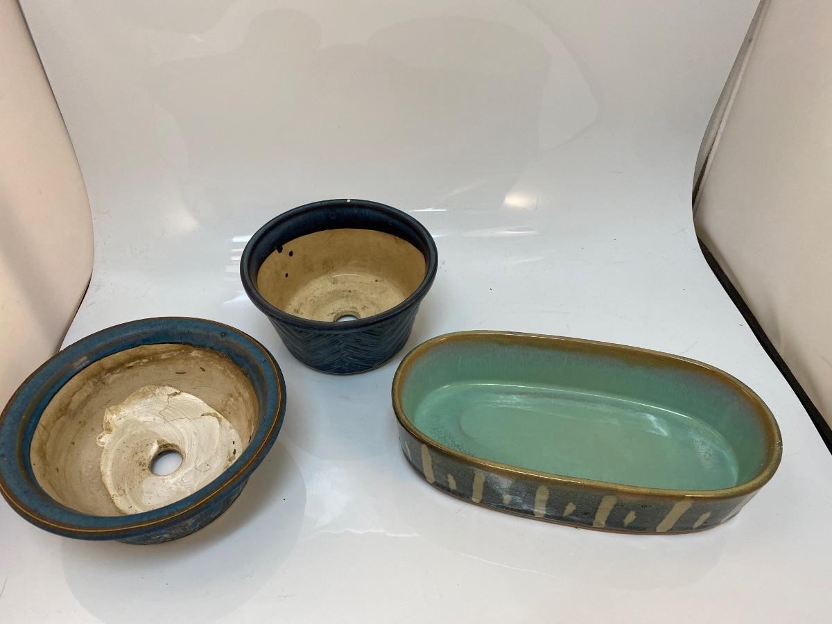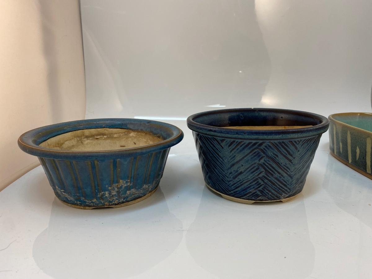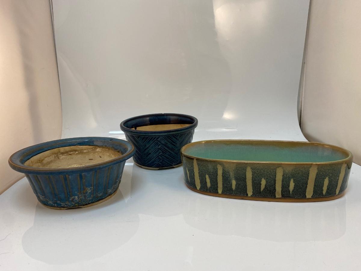 Set of 3 Blue Glaze Planter Pots Stamped. The two round look to be made by same artist. The oblong one has what looks like an Asian stamp. All are in good condition no chips. One round has water deposits around it, may come clean with a soak in vinegar, but not sure.