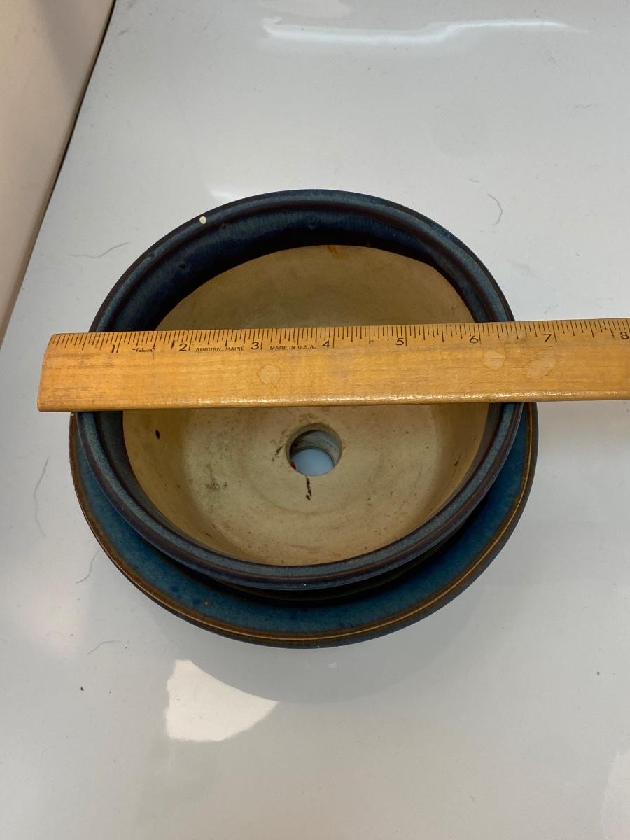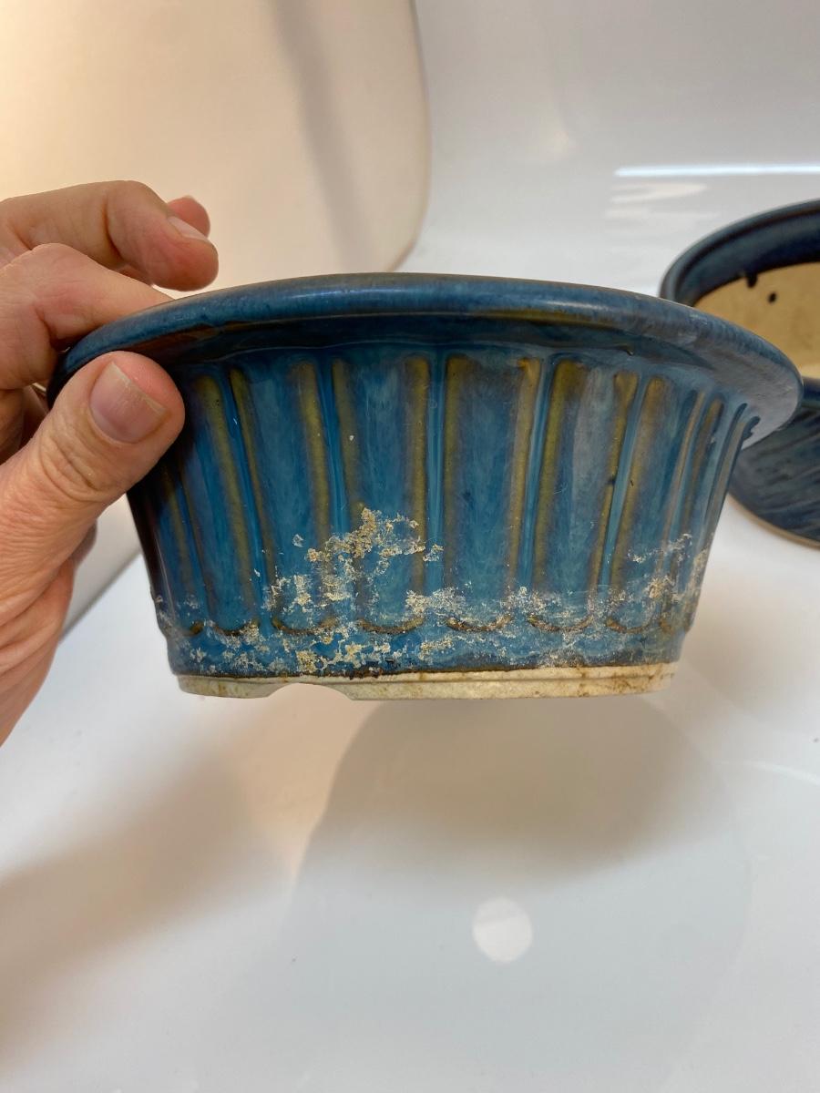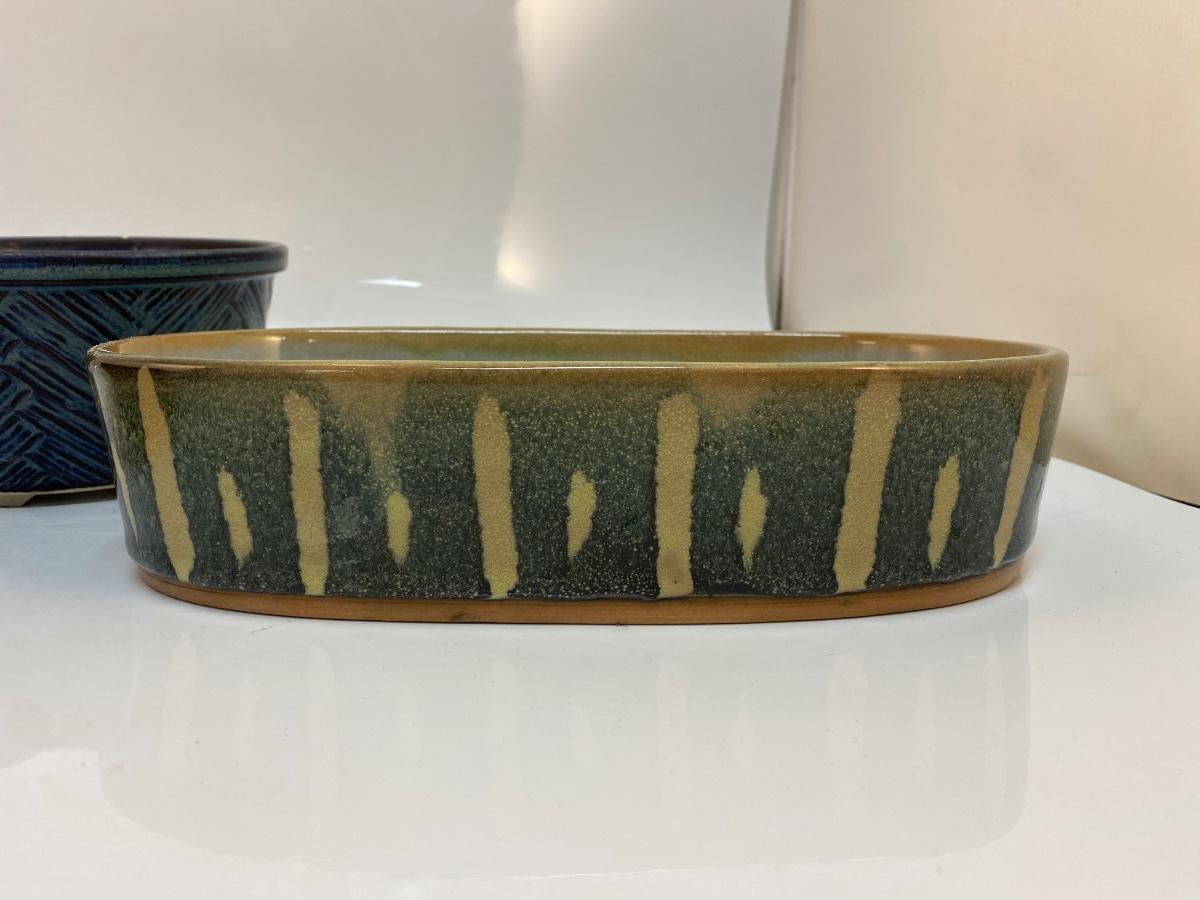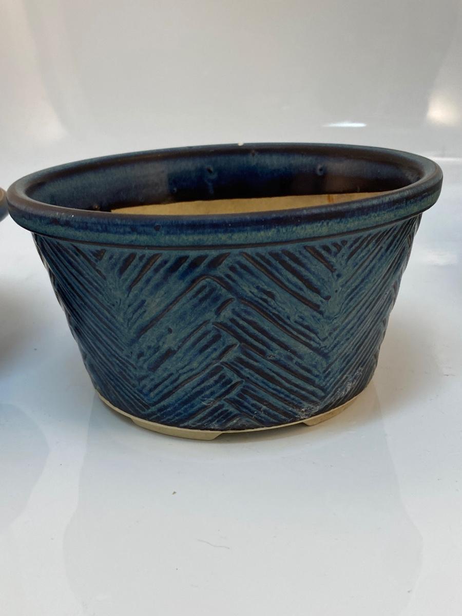 Set of 3 Blue Glaze Planter Pots Stamped. The two round look to be made by same artist. The oblong one has what looks like an Asian stamp. All are in good condition no chips. One round has water deposits around it, may come clean with a soak in vinegar, but not sure.