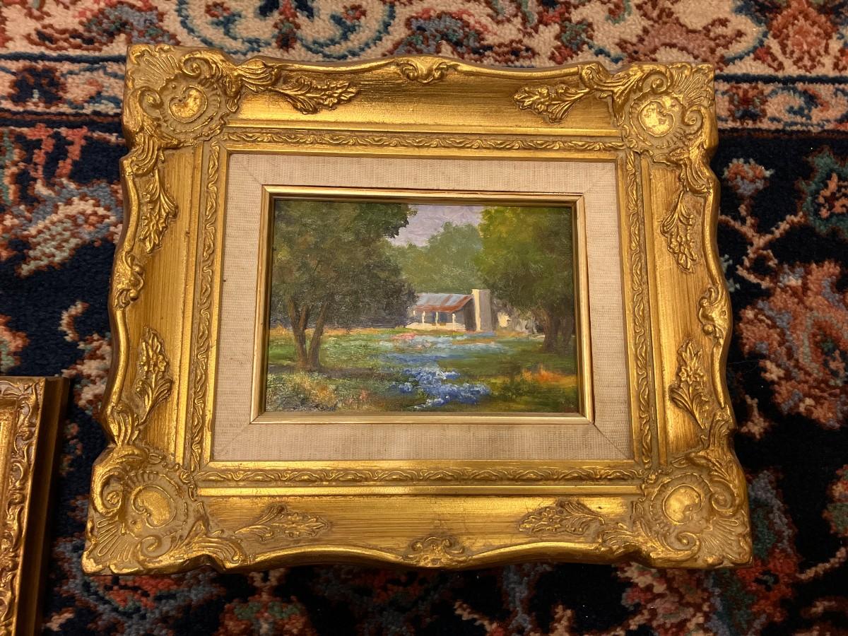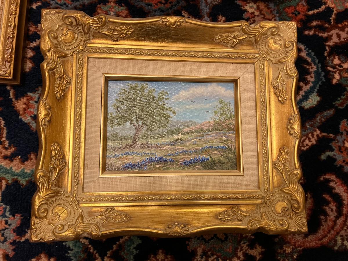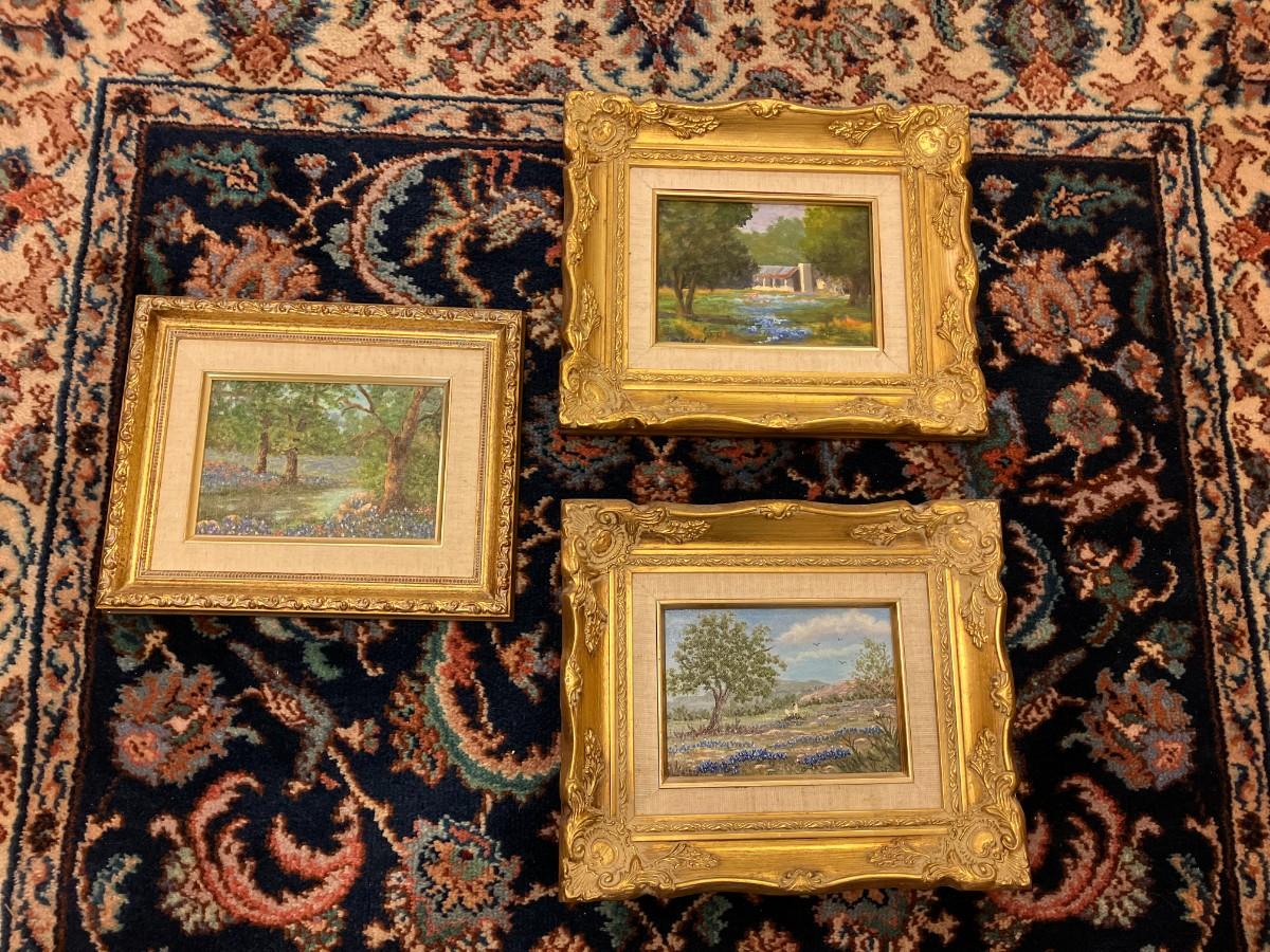 Set of 3 10" x 12" framed bluebonnet oil on canvas paintings, varied artists