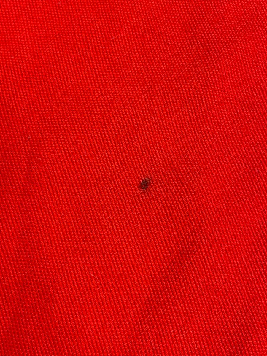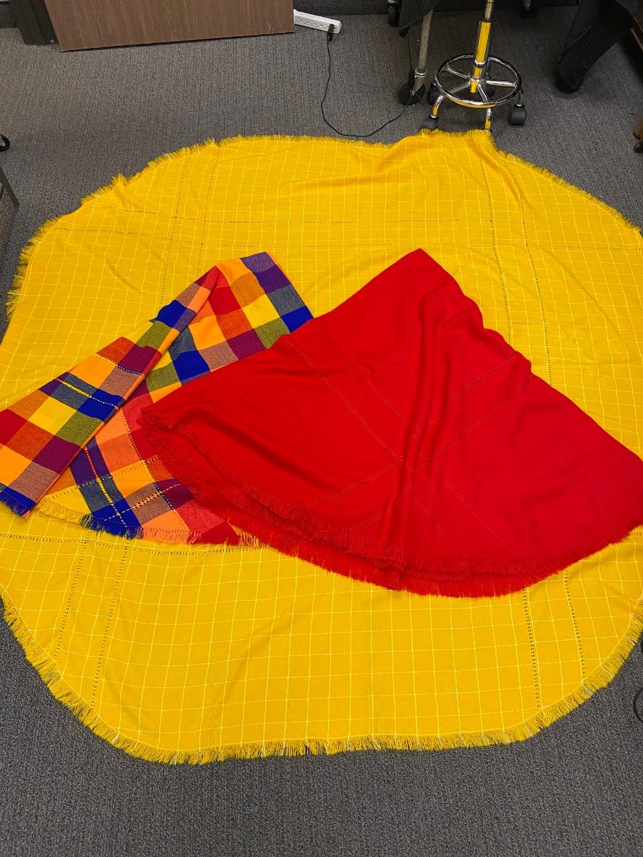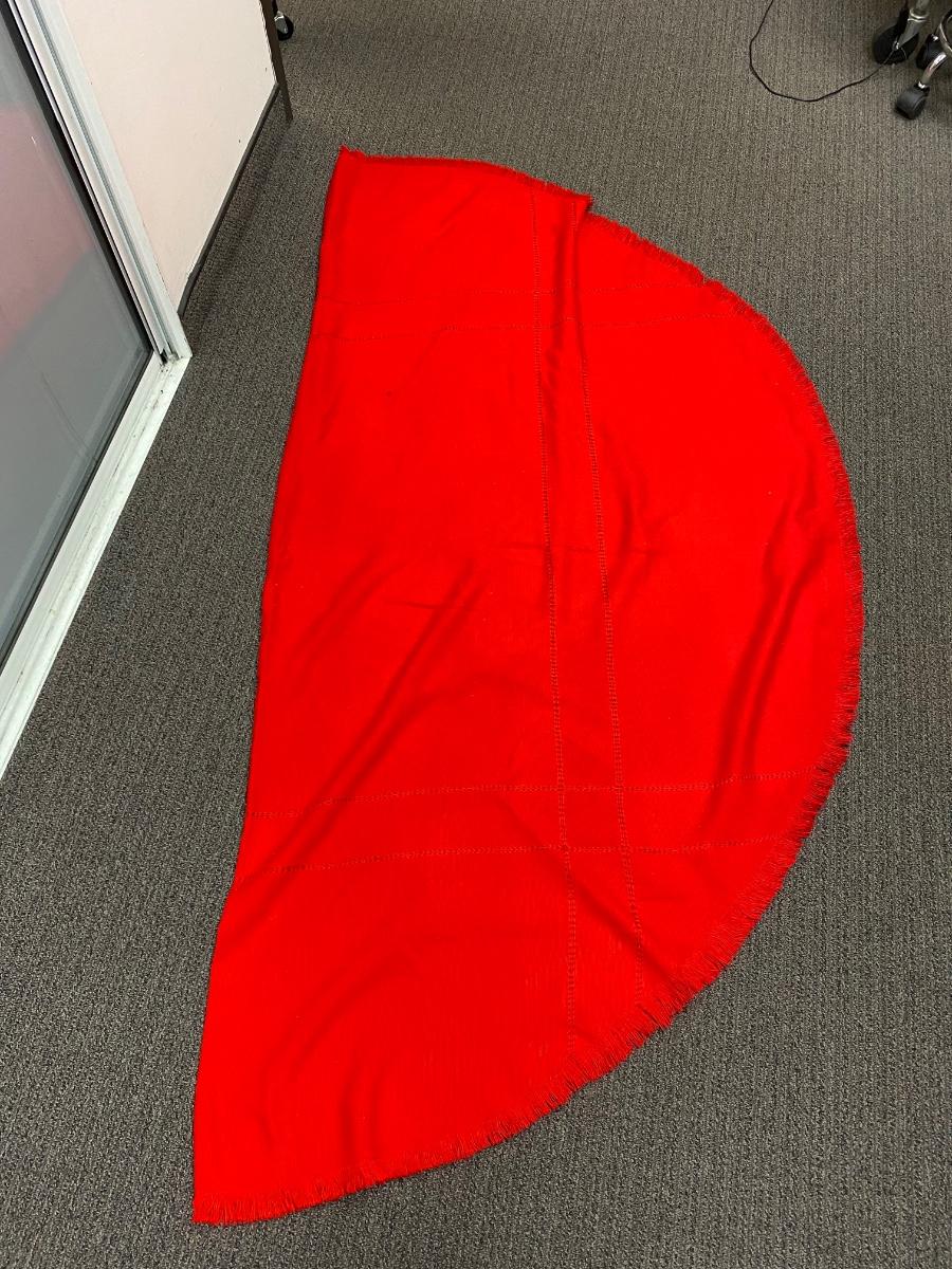 Set of three brightly colored round tablecloths. About 6' diameter. All are in good condition, the red one does have one dark spot. Fringed edge.
