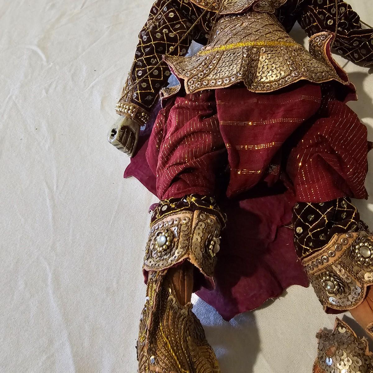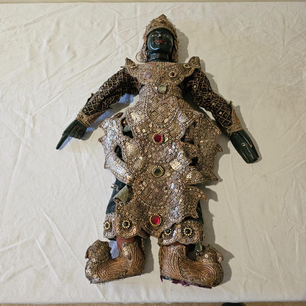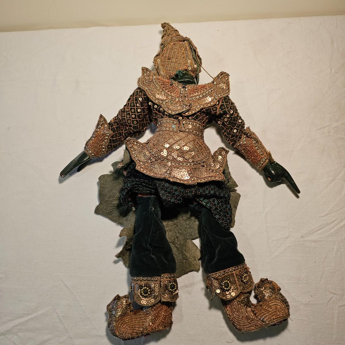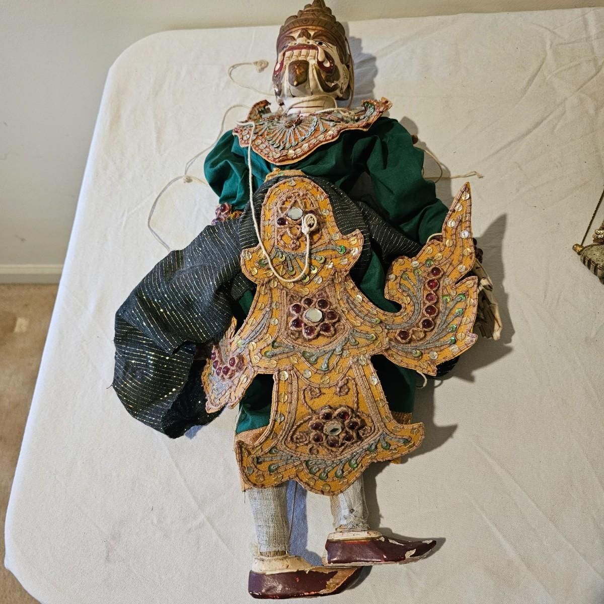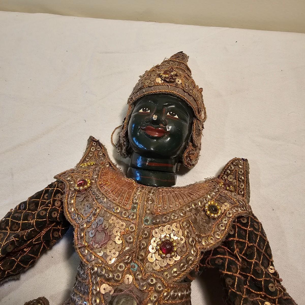 A trio of vintage marionette puppets most likely from Burma. Highly detailed costumes with beads and sequins, jewels, etc. One traditional style figure and two with monkey god features. Two have strings attached and paddles for movement. All pieces are approximately 10" x 20" H. Costumes and limbs show some wear. See photos for details. Shipping available.
