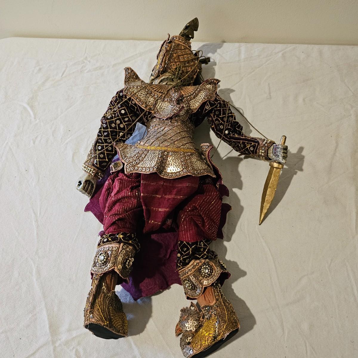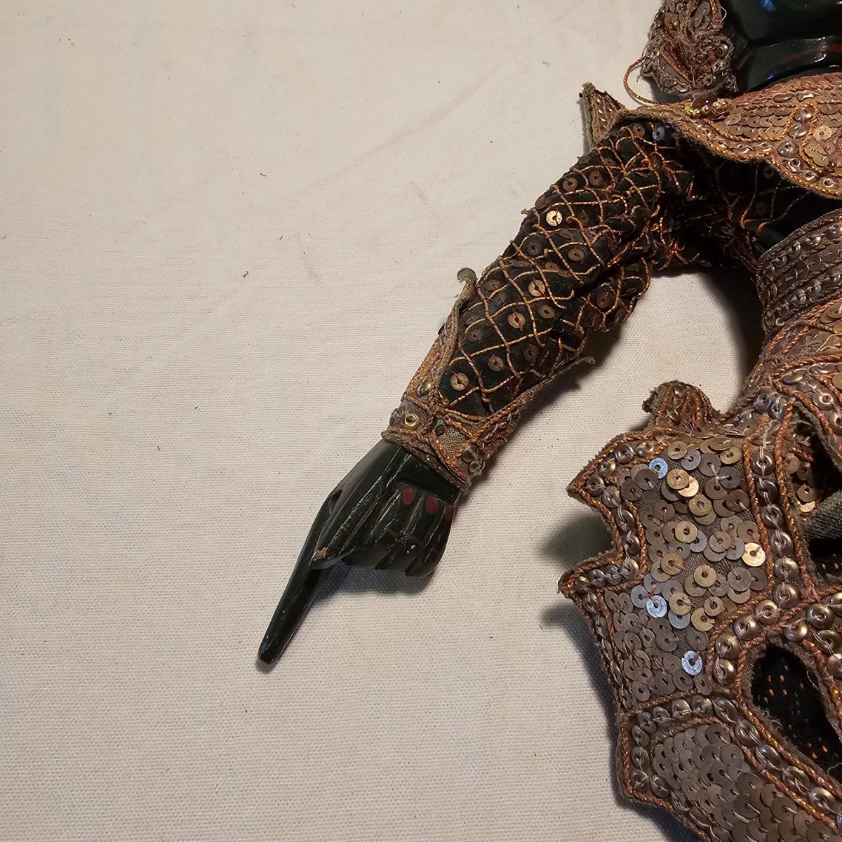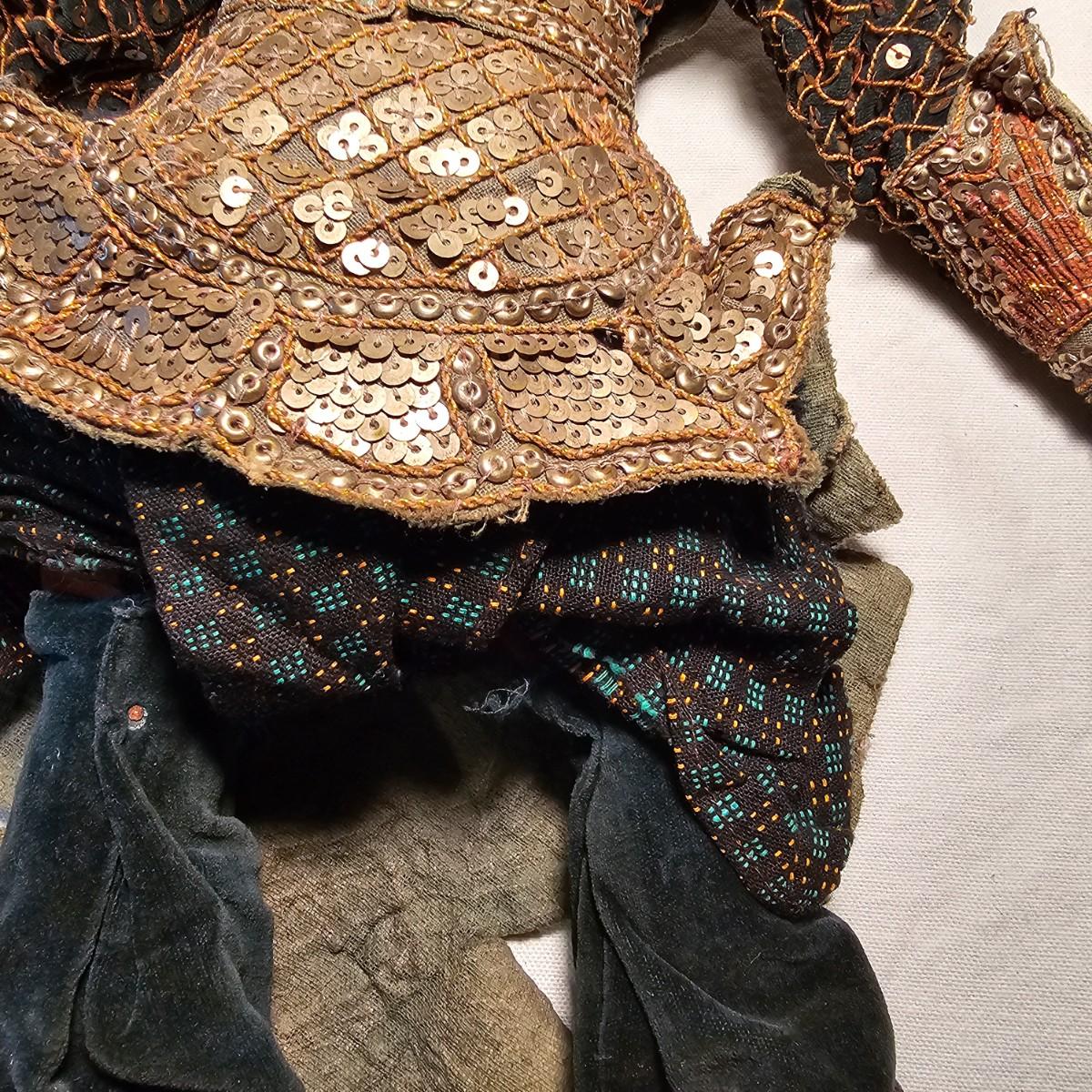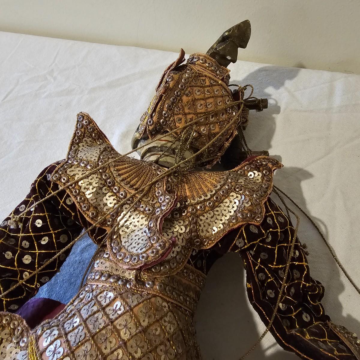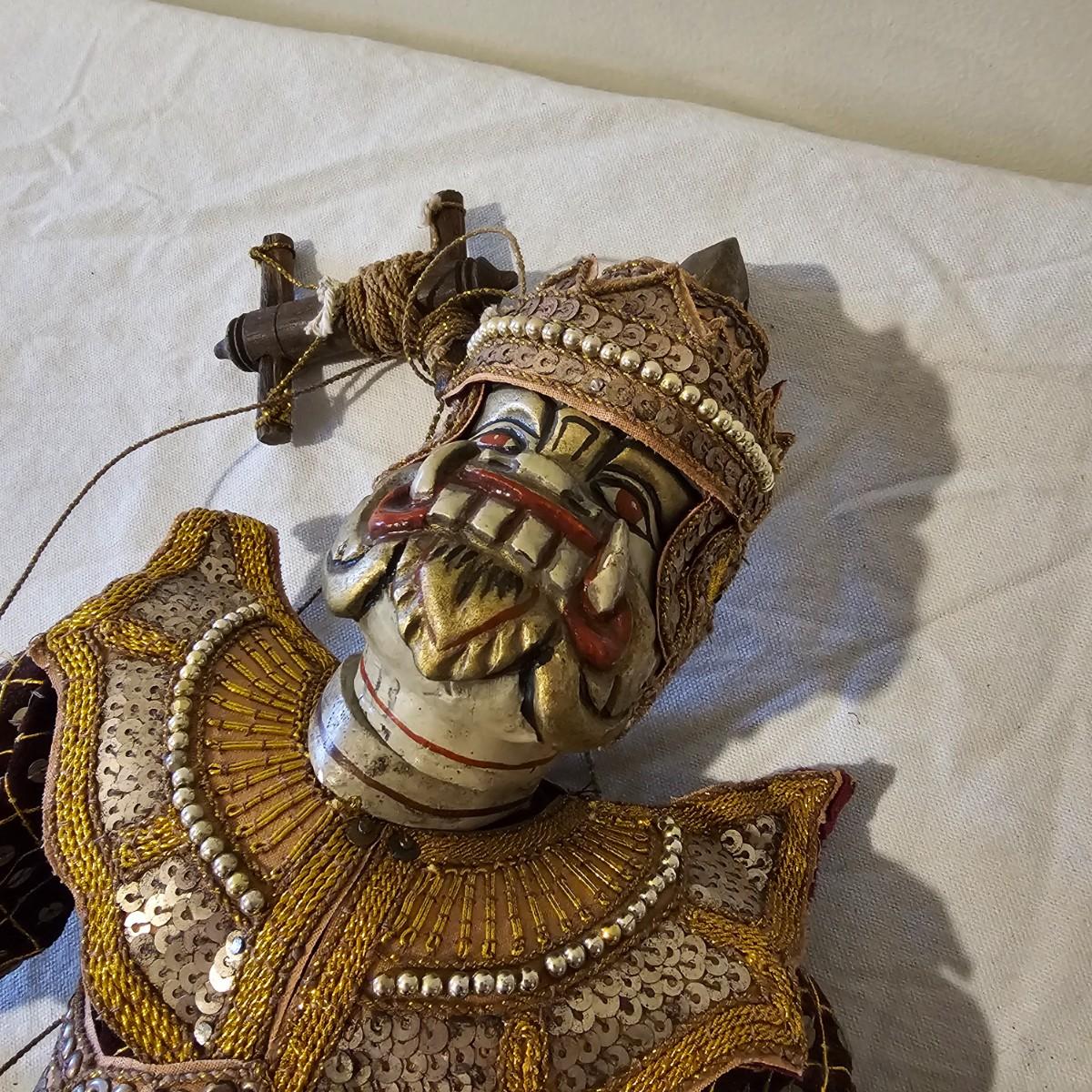 A trio of vintage marionette puppets most likely from Burma. Highly detailed costumes with beads and sequins, jewels, etc. One traditional style figure and two with monkey god features. Two have strings attached and paddles for movement. All pieces are approximately 10" x 20" H. Costumes and limbs show some wear. See photos for details. Shipping available.