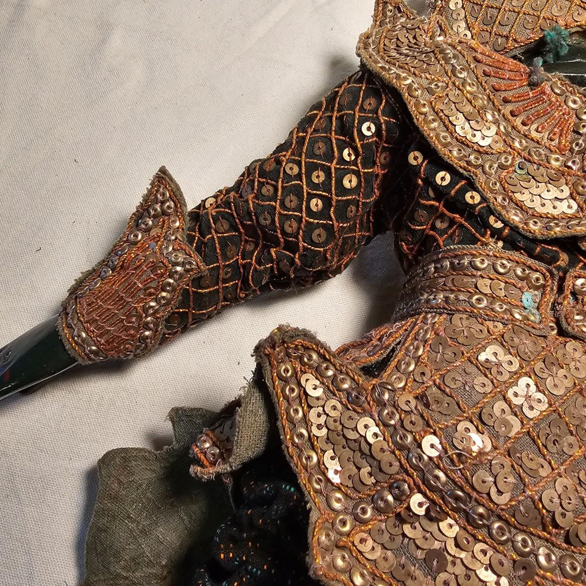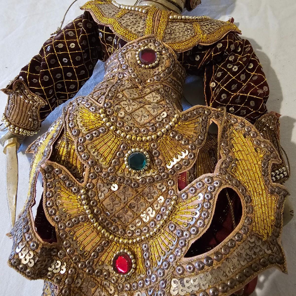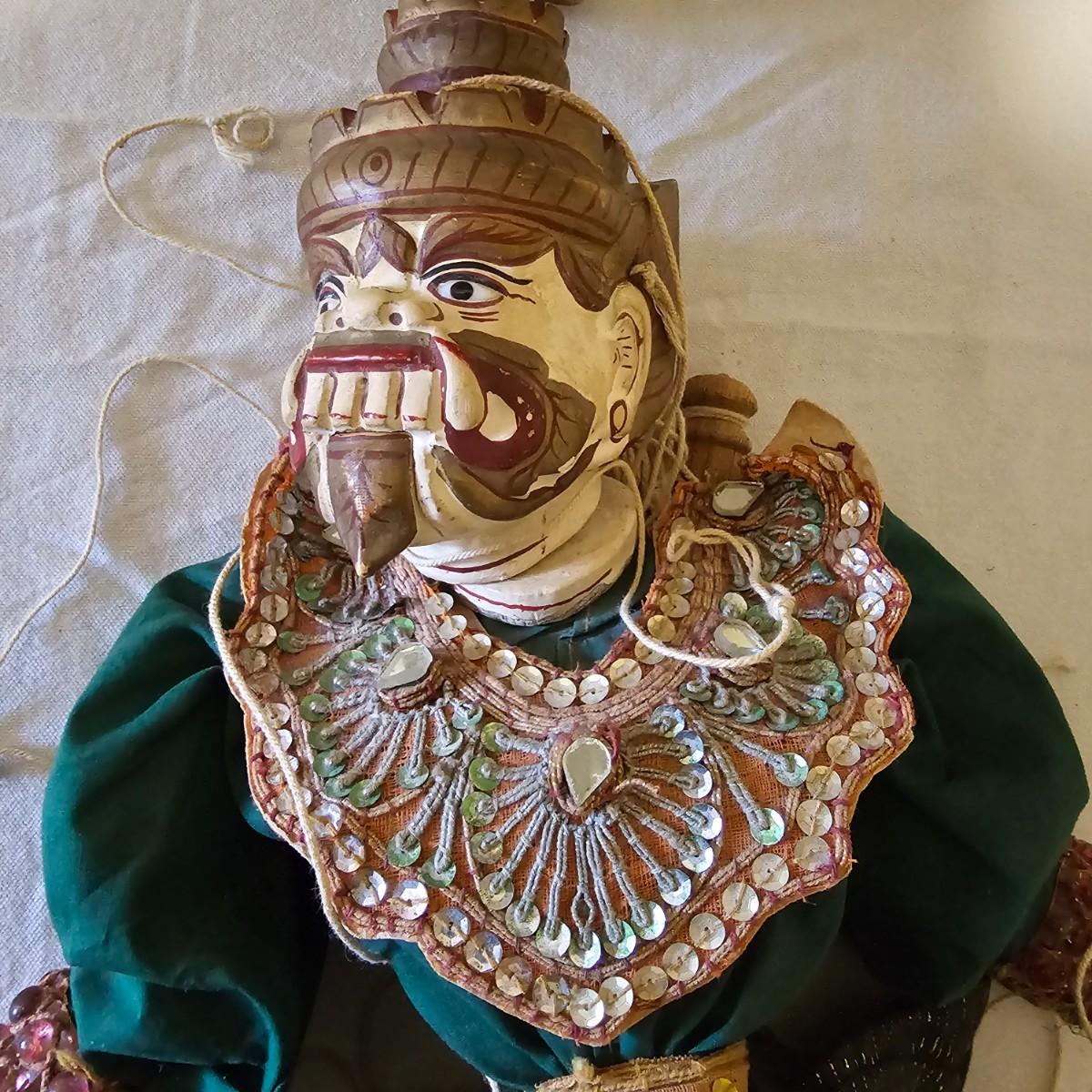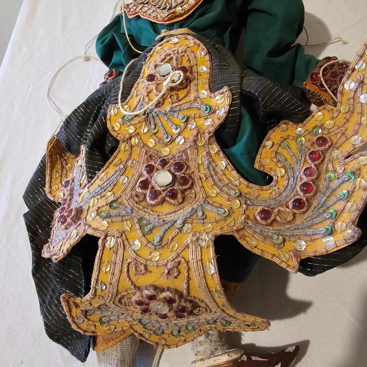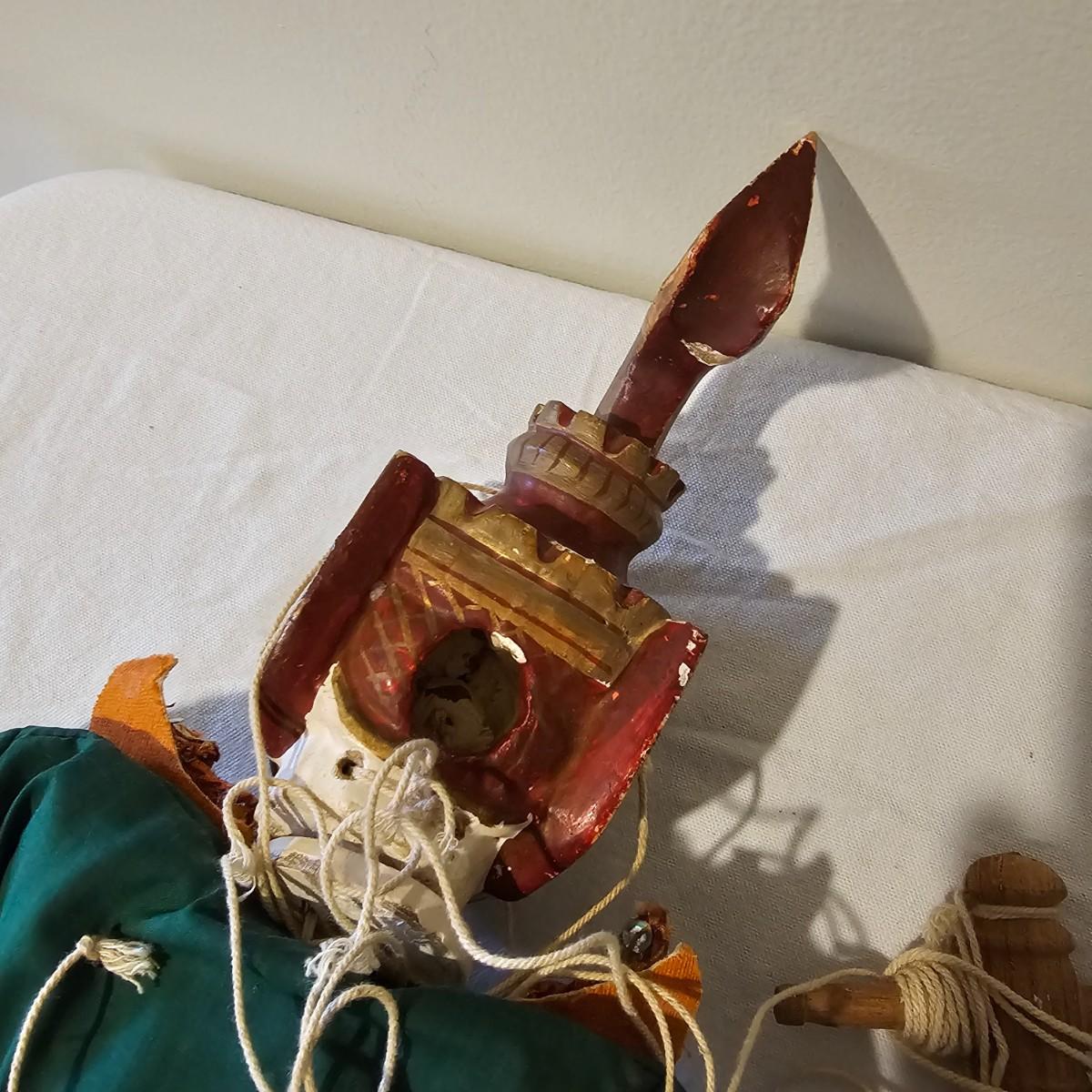A trio of vintage marionette puppets most likely from Burma. Highly detailed costumes with beads and sequins, jewels, etc. One traditional style figure and two with monkey god features. Two have strings attached and paddles for movement. All pieces are approximately 10" x 20" H. Costumes and limbs show some wear. See photos for details. Shipping available.