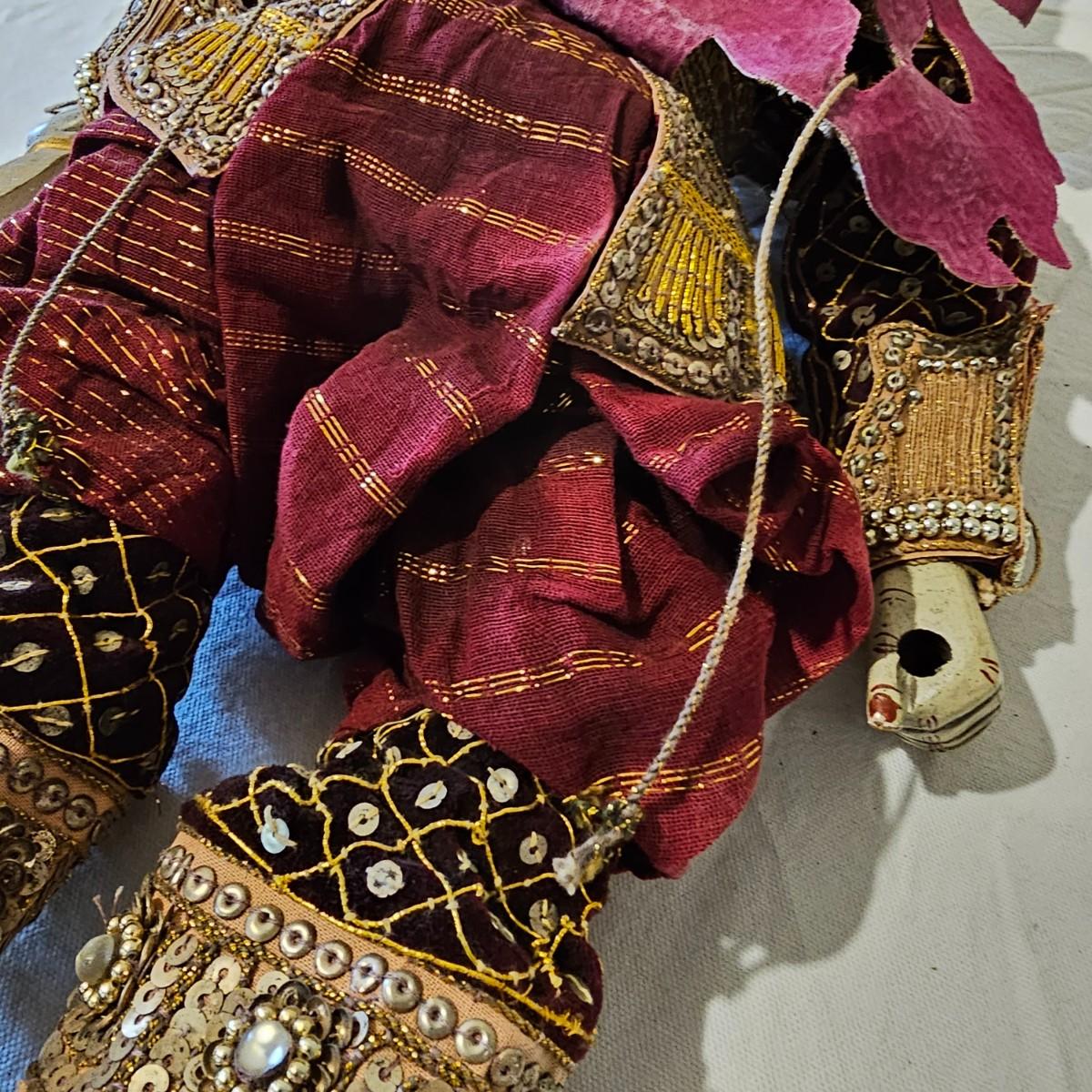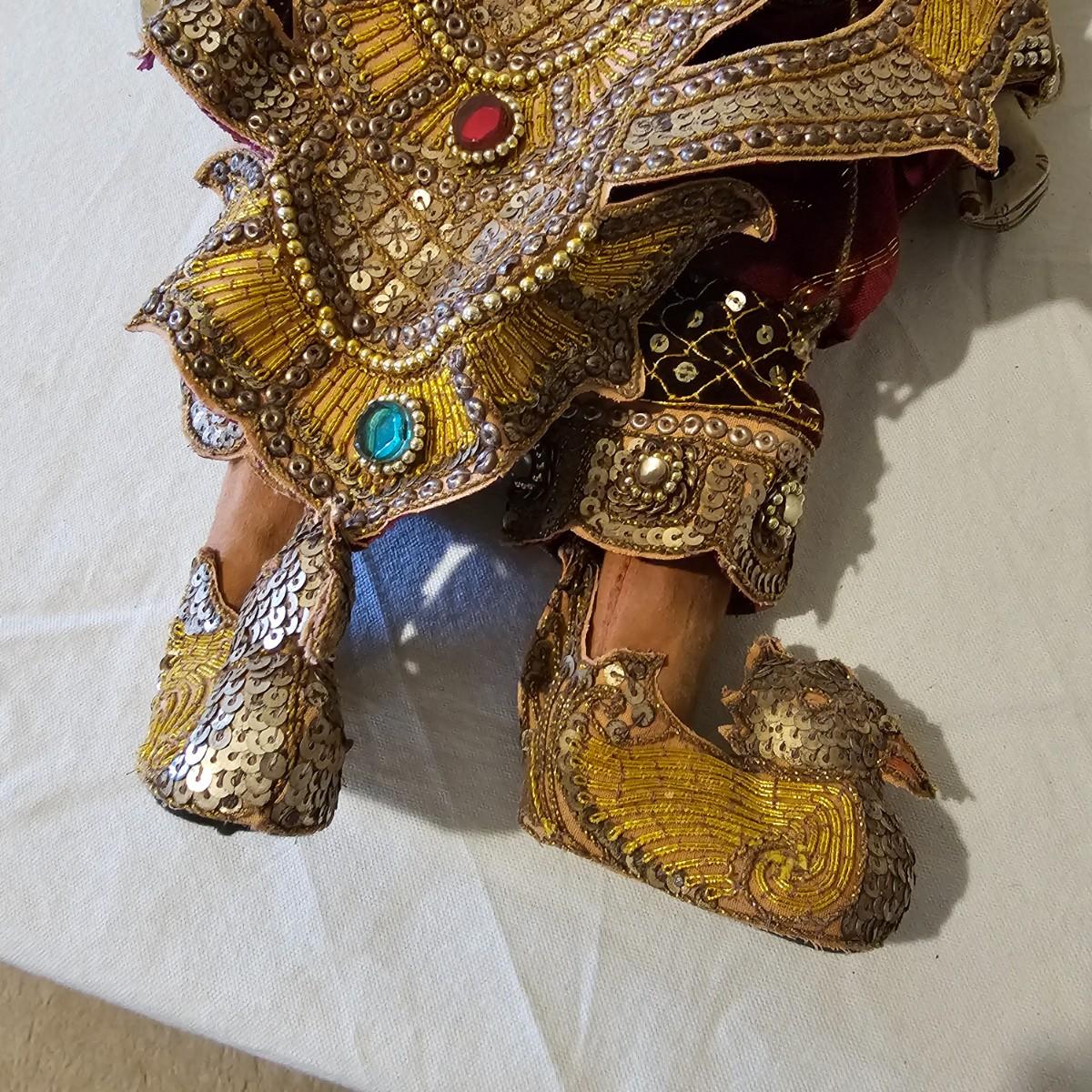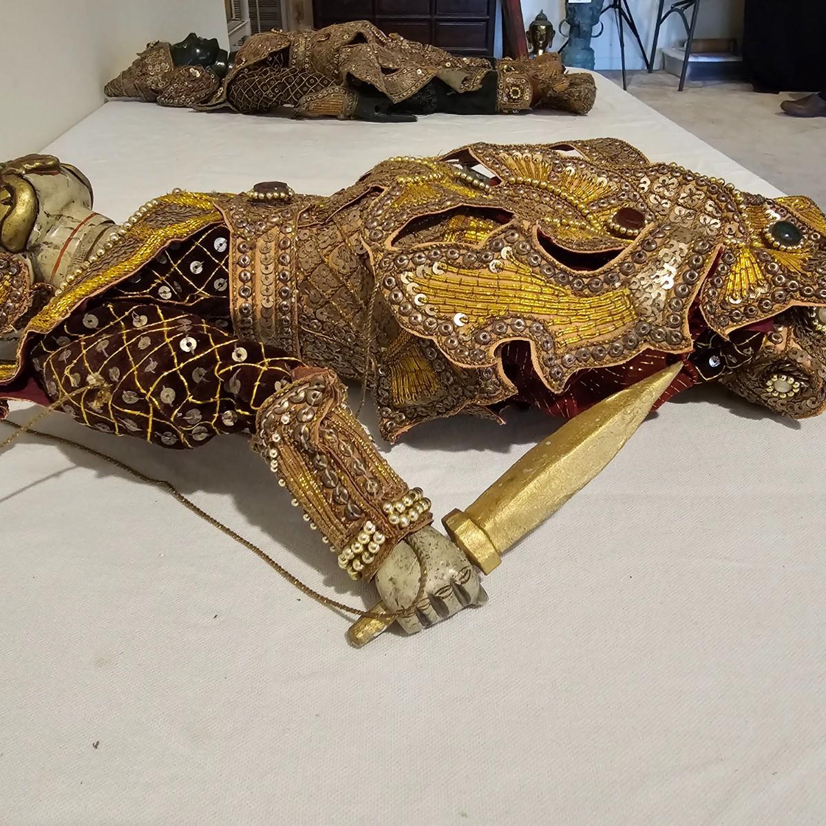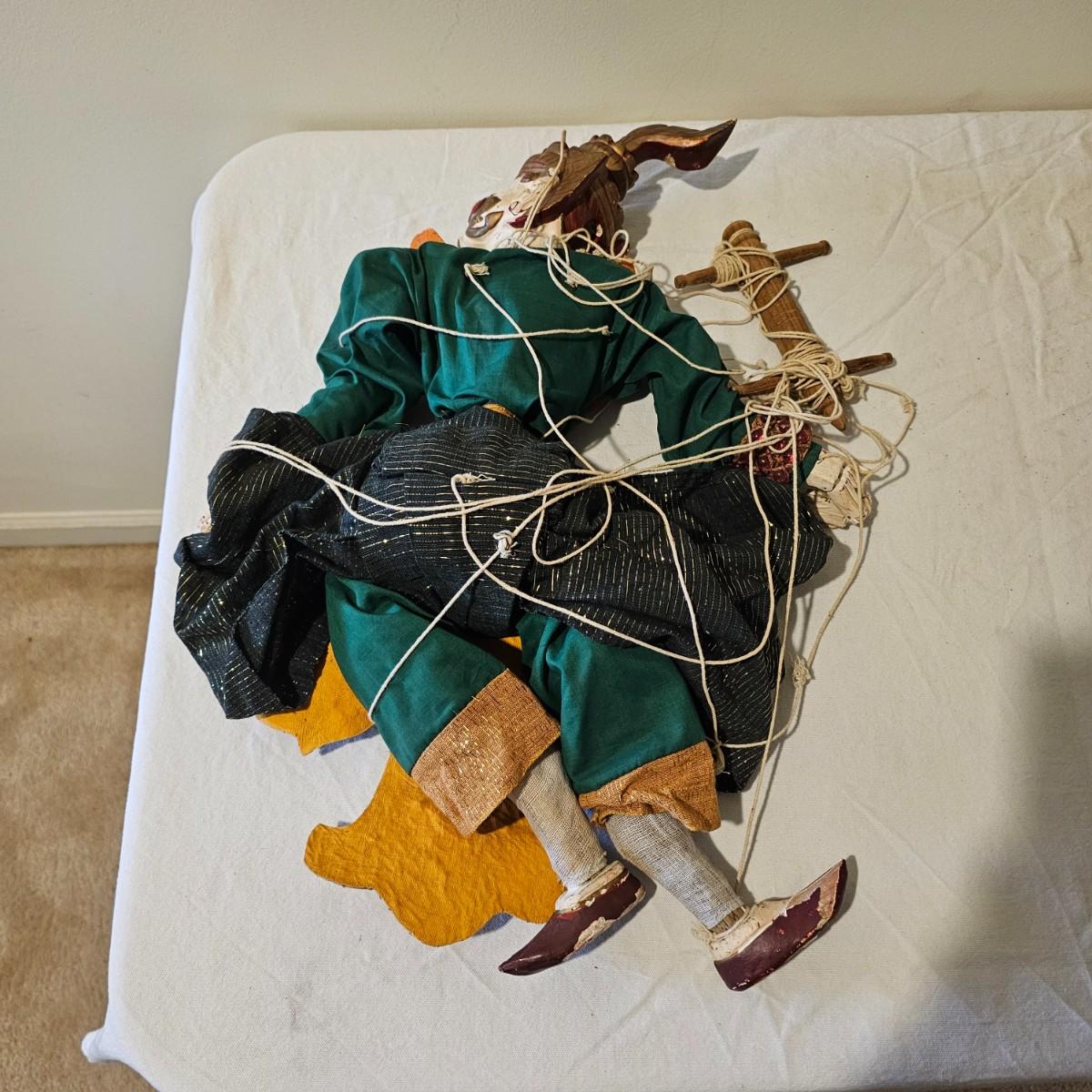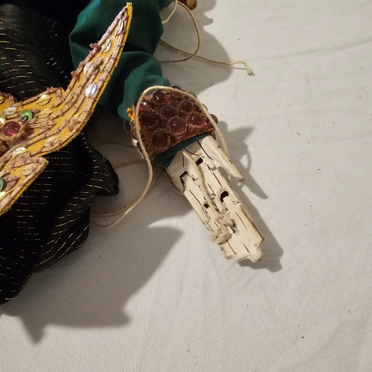 A trio of vintage marionette puppets most likely from Burma. Highly detailed costumes with beads and sequins, jewels, etc. One traditional style figure and two with monkey god features. Two have strings attached and paddles for movement. All pieces are approximately 10" x 20" H. Costumes and limbs show some wear. See photos for details. Shipping available.