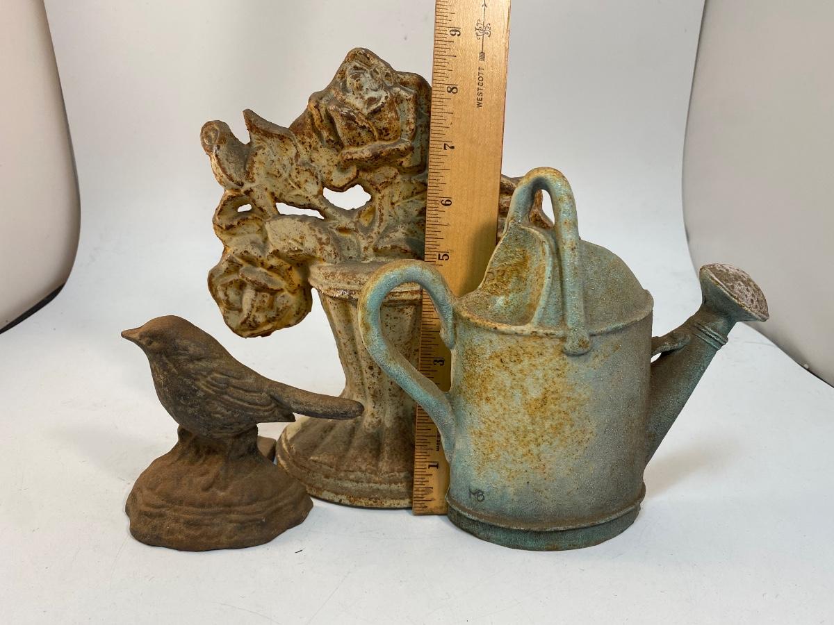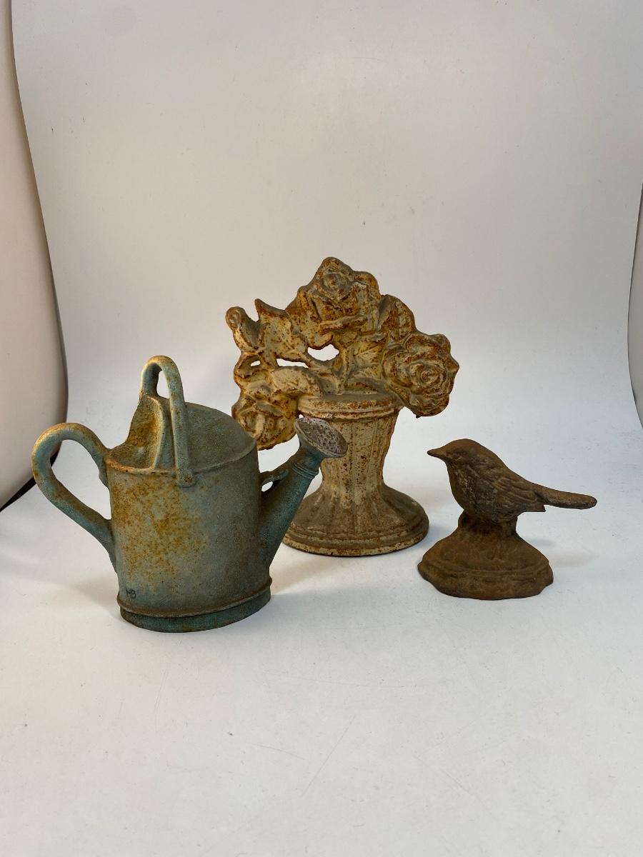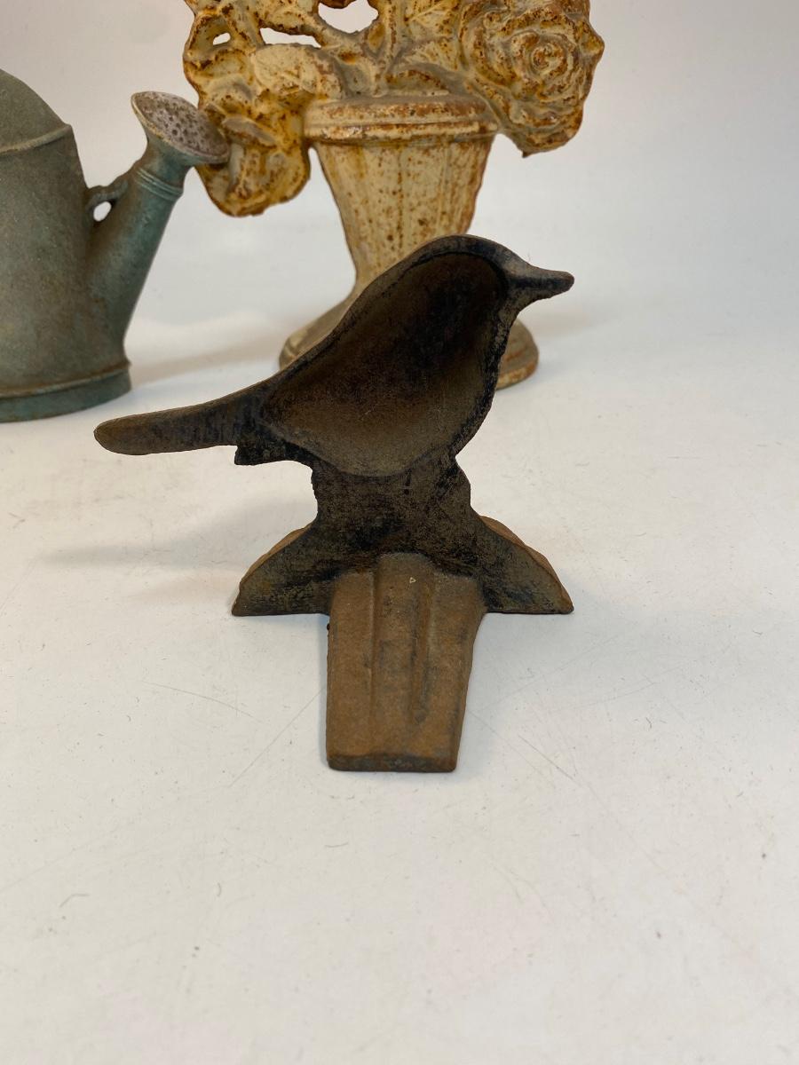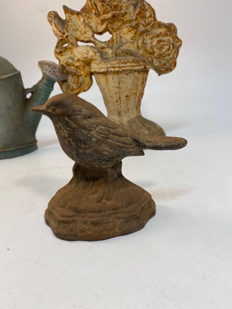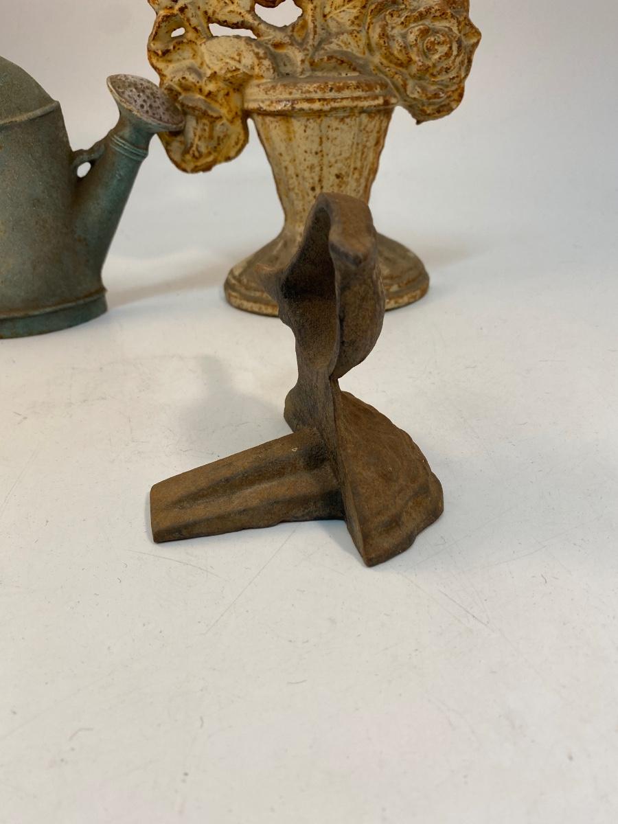 Set of 3 Cast Metal Door Stops Shabby Chic Cottagecore Garden Theme. All are a bit weathered but look great. Can be painted if desired. 9" and smaller.