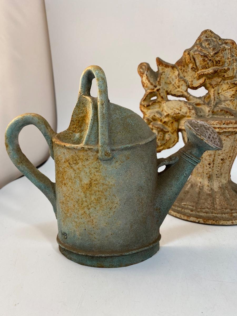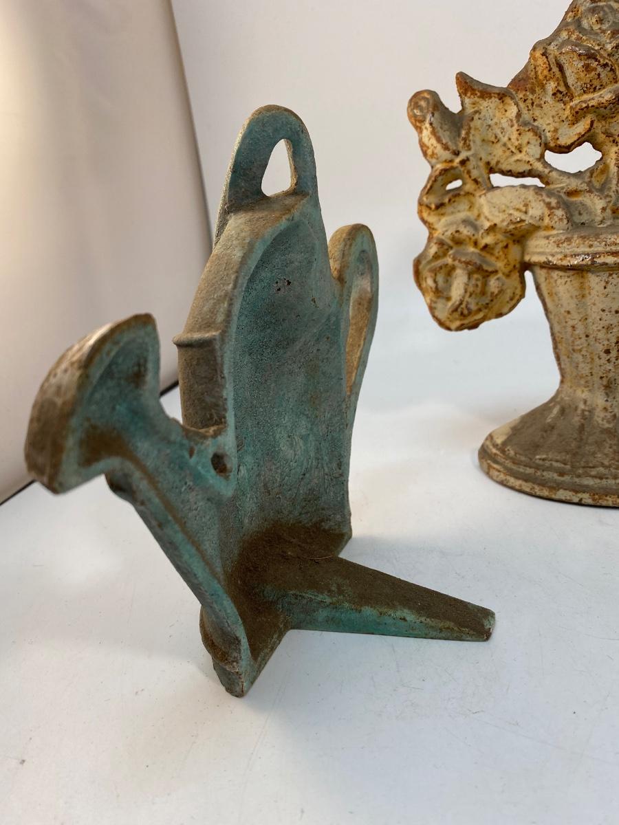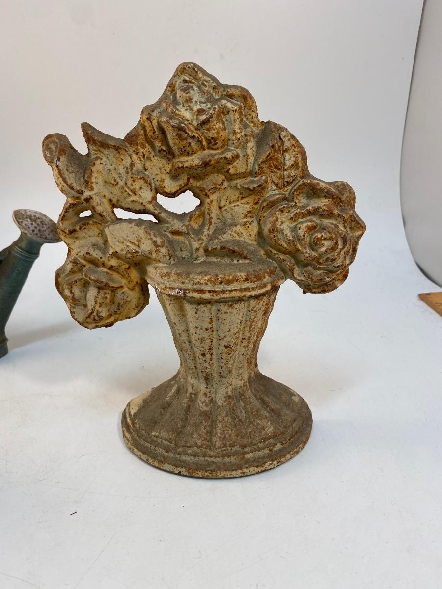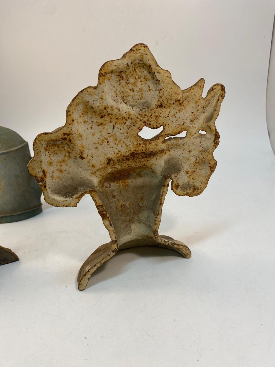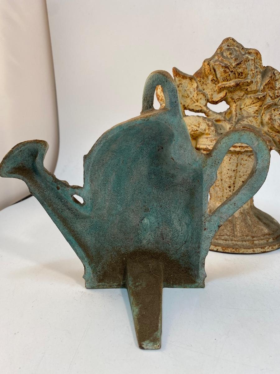 Set of 3 Cast Metal Door Stops Shabby Chic Cottagecore Garden Theme. All are a bit weathered but look great. Can be painted if desired. 9" and smaller.
