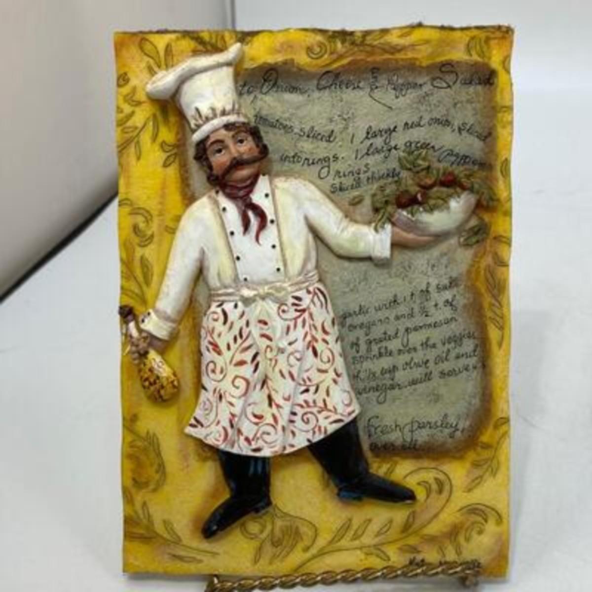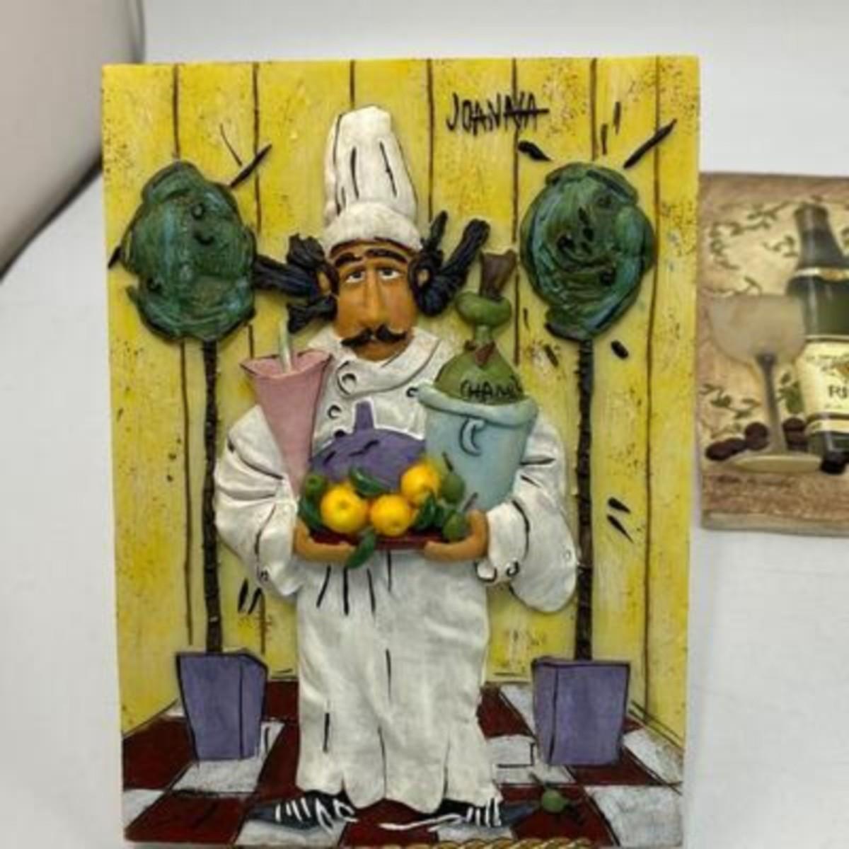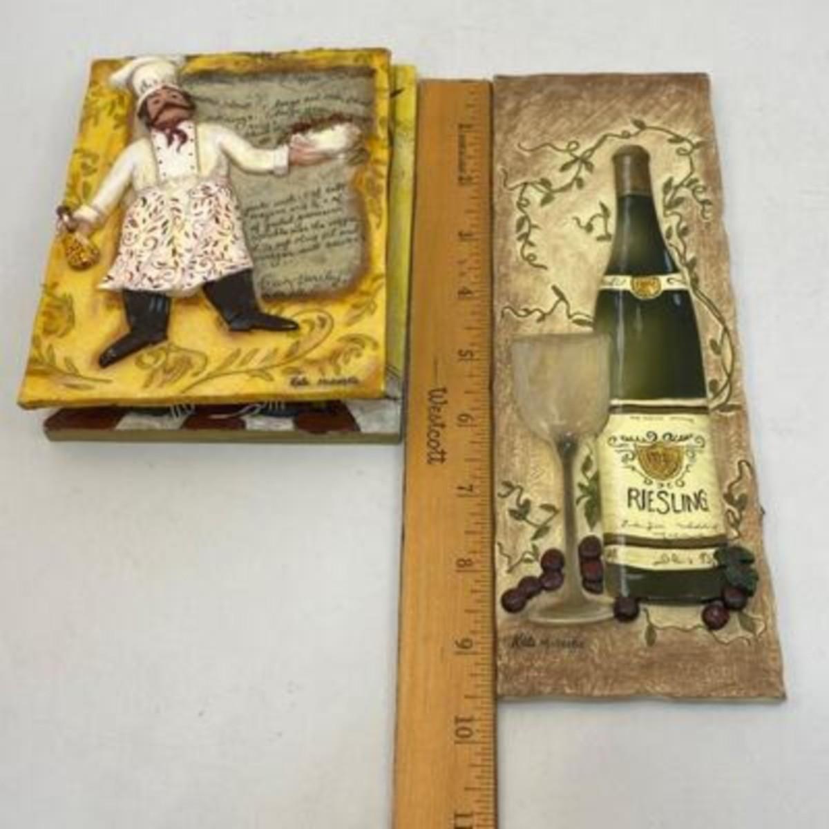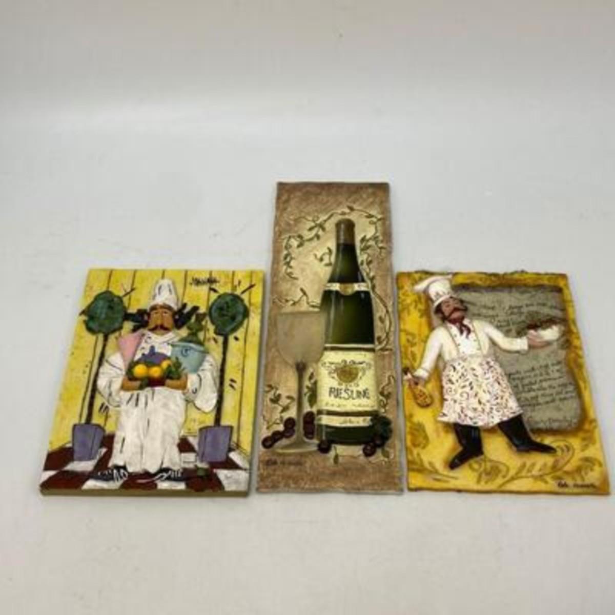 Set of 3 Chef & Wine Wall Hanging Kitchen Art. Good condition. Have a slot in the back for hanging on wall.