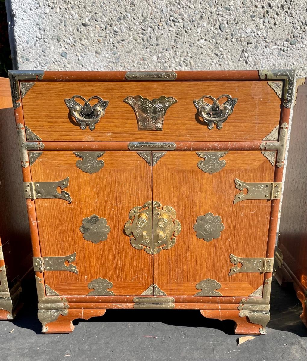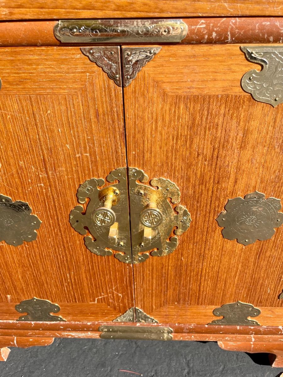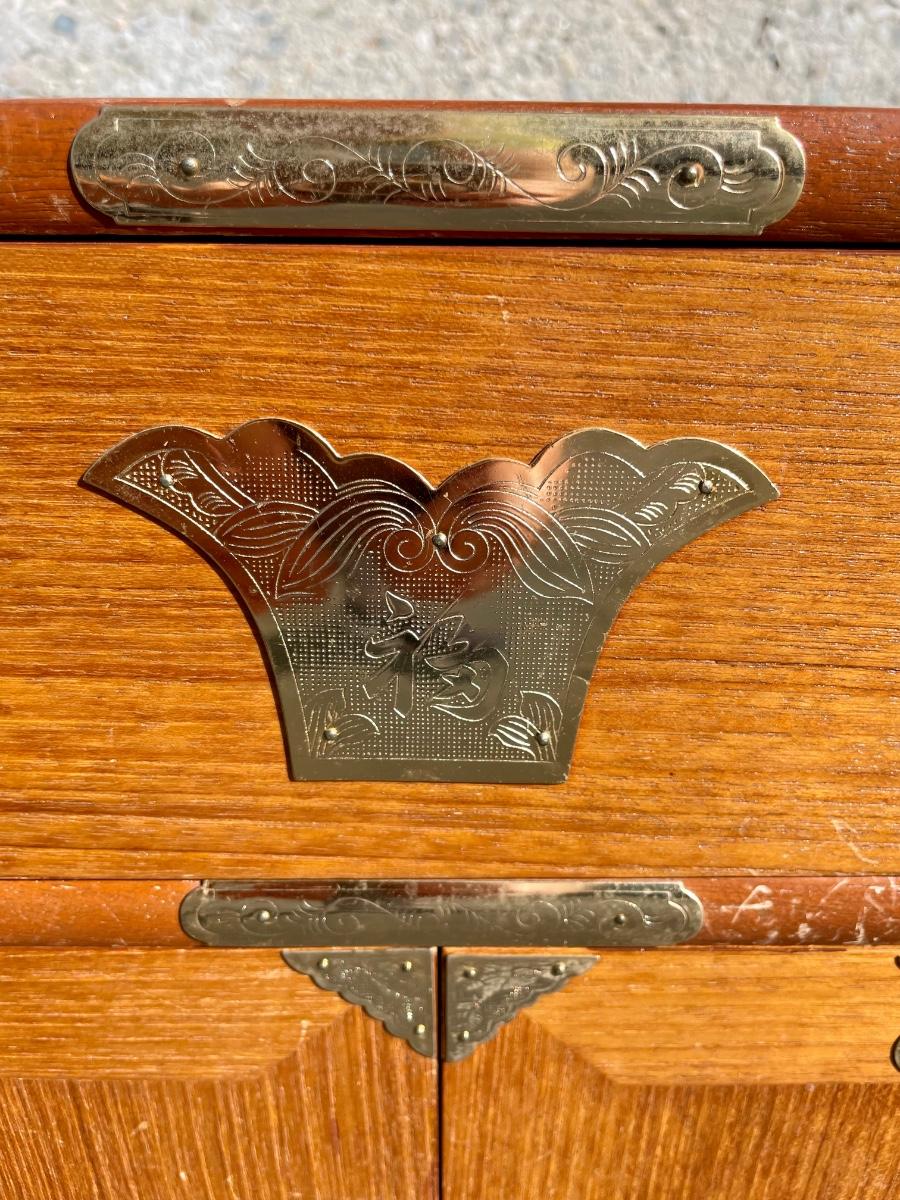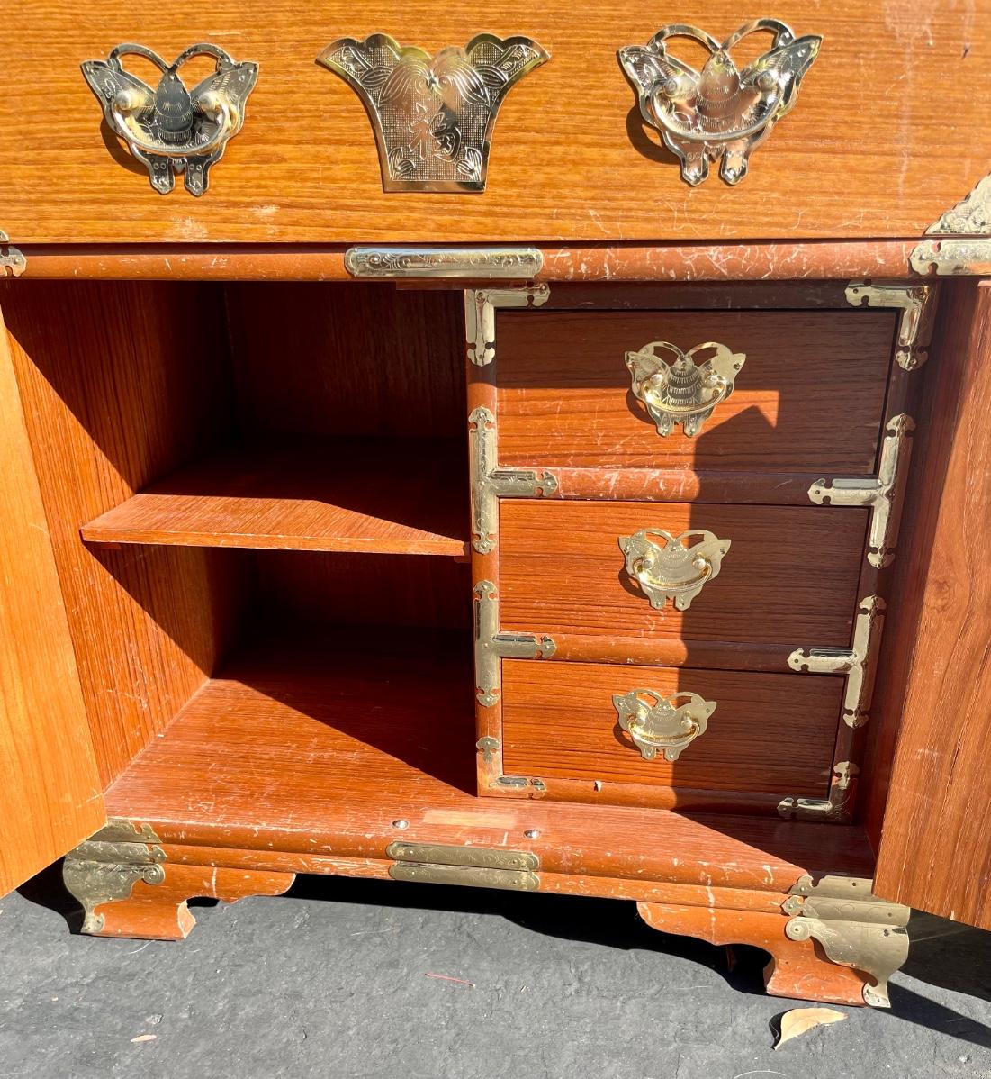 Solid wood construction with polished brass handles, fittings, and corner protectors. Single drawer at the top. Doors open to reveal a cubby with 1 shelf on the left and a 3-drawer unit on the right. 24" tall, 14" deep and 22" wide. Extra brass fittings included, see photos.