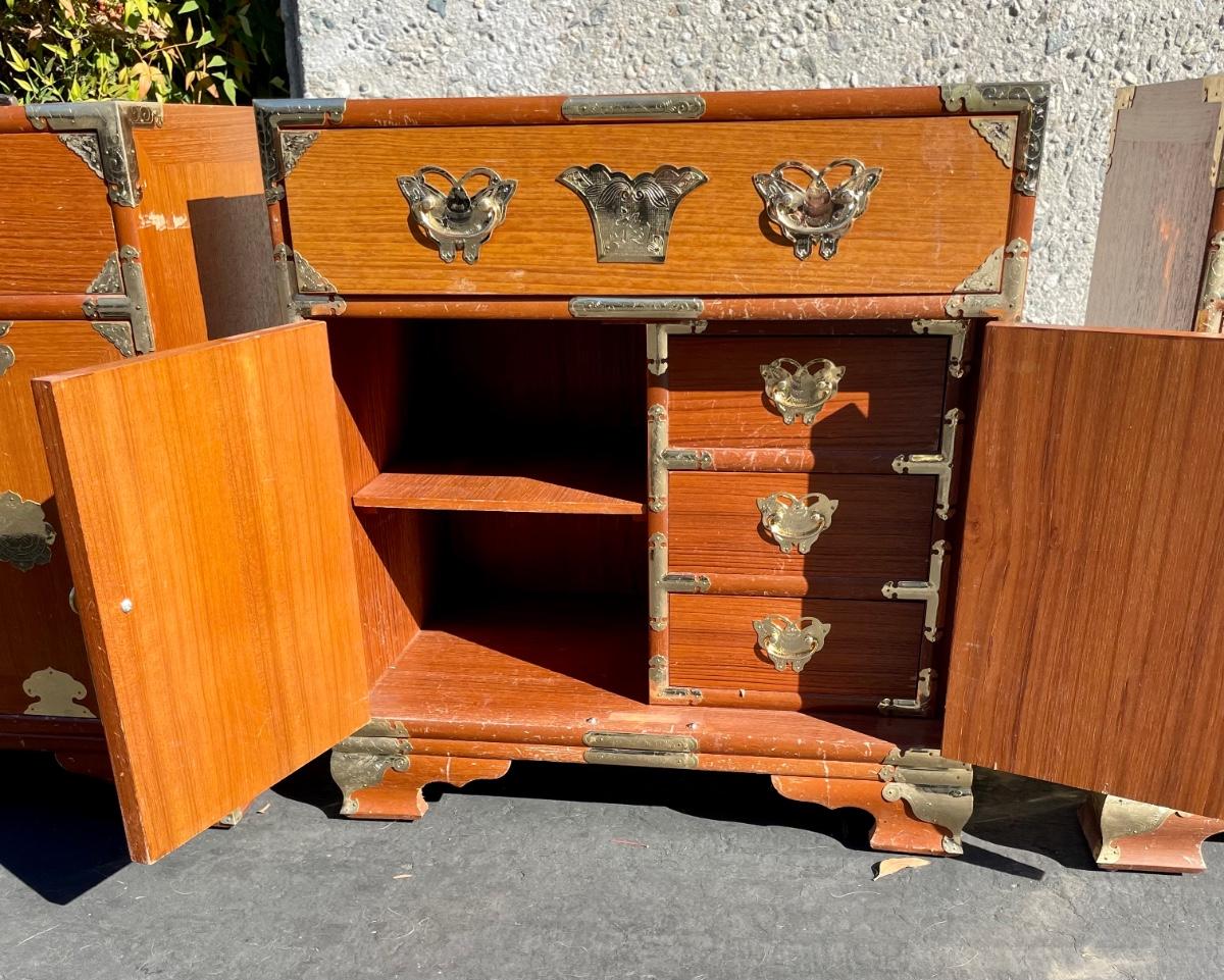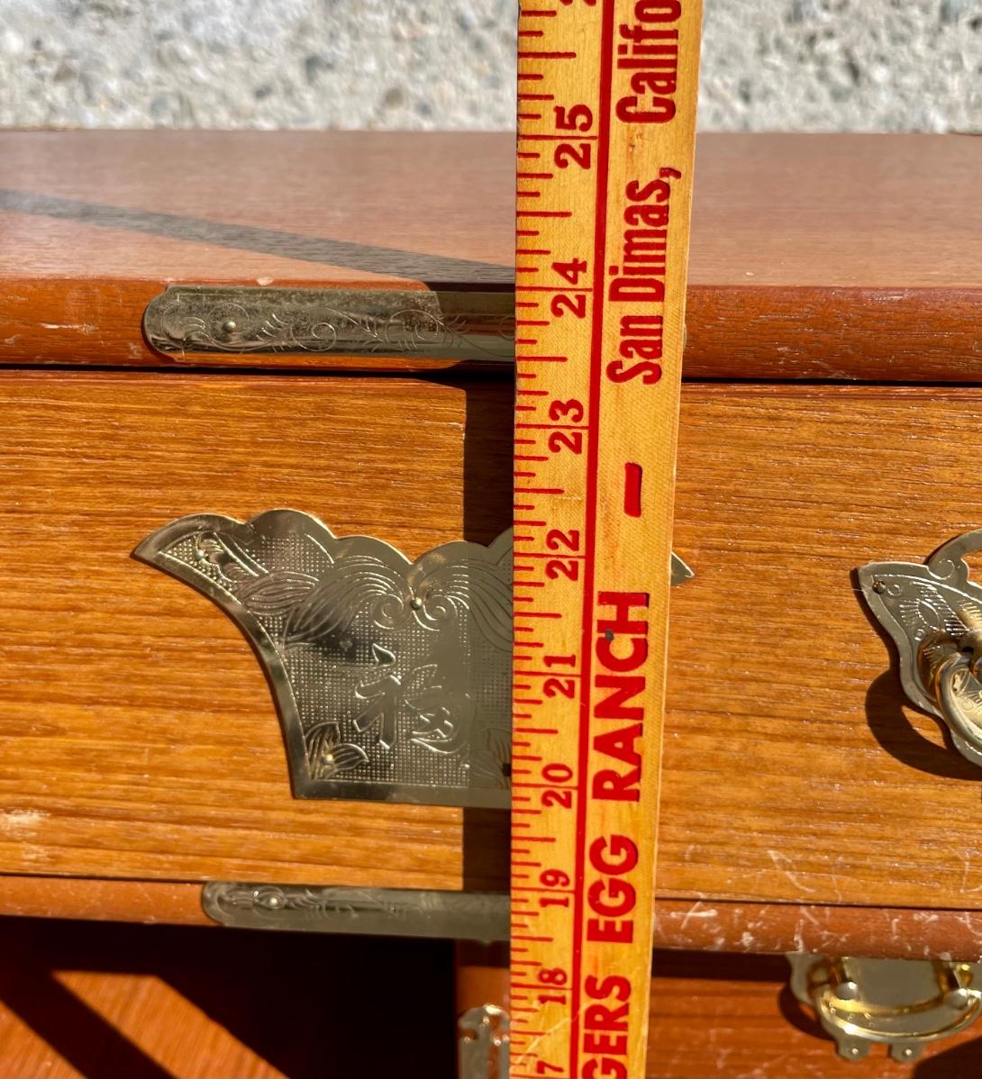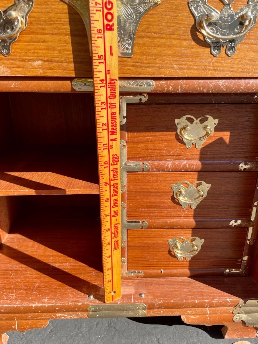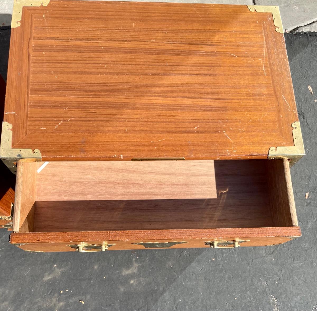 Solid wood construction with polished brass handles, fittings, and corner protectors. Single drawer at the top. Doors open to reveal a cubby with 1 shelf on the left and a 3-drawer unit on the right. 24" tall, 14" deep and 22" wide. Extra brass fittings included, see photos.