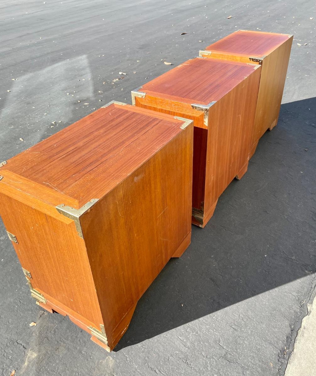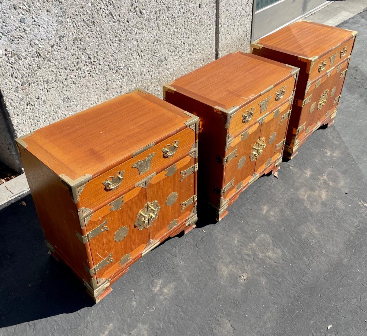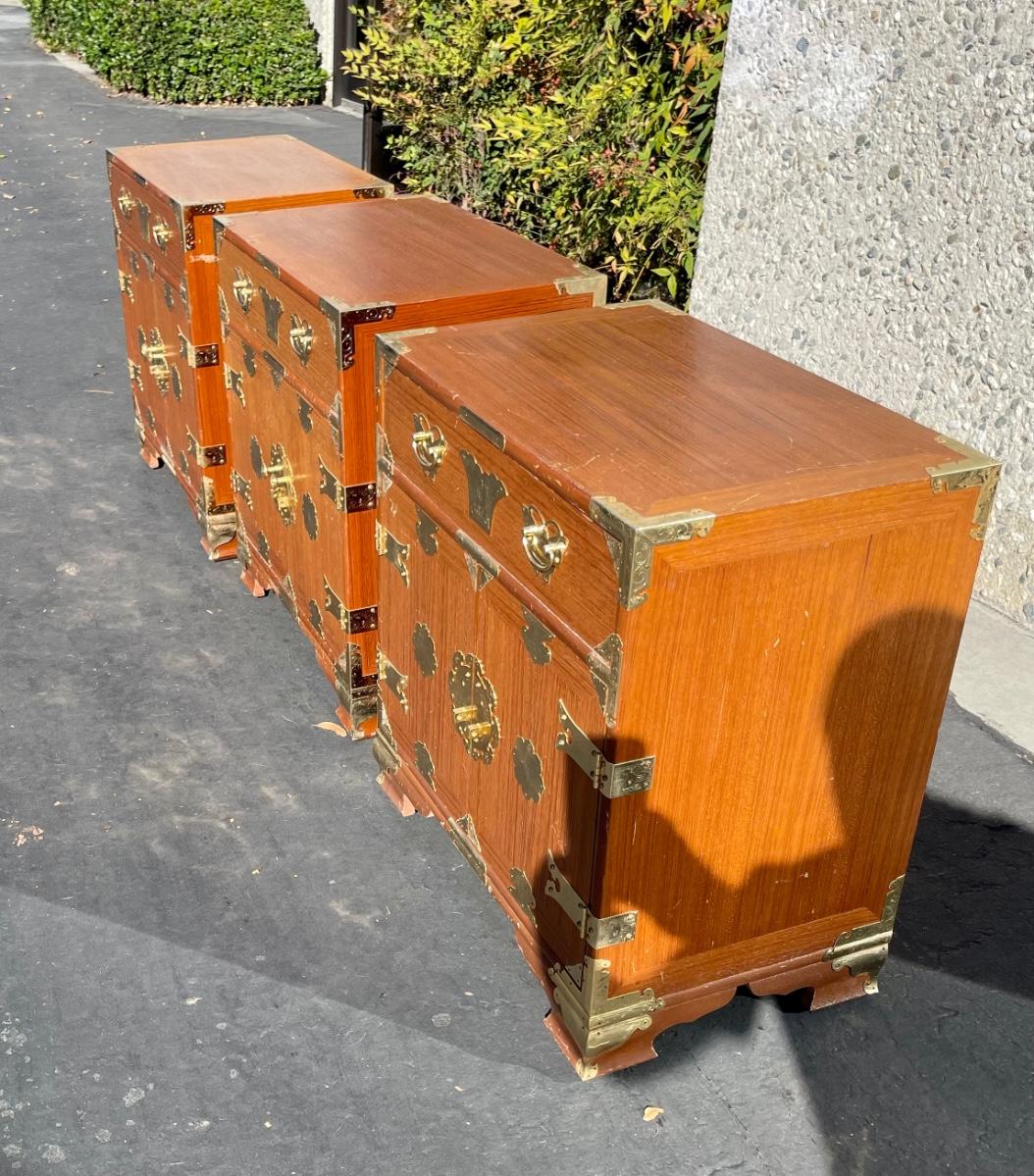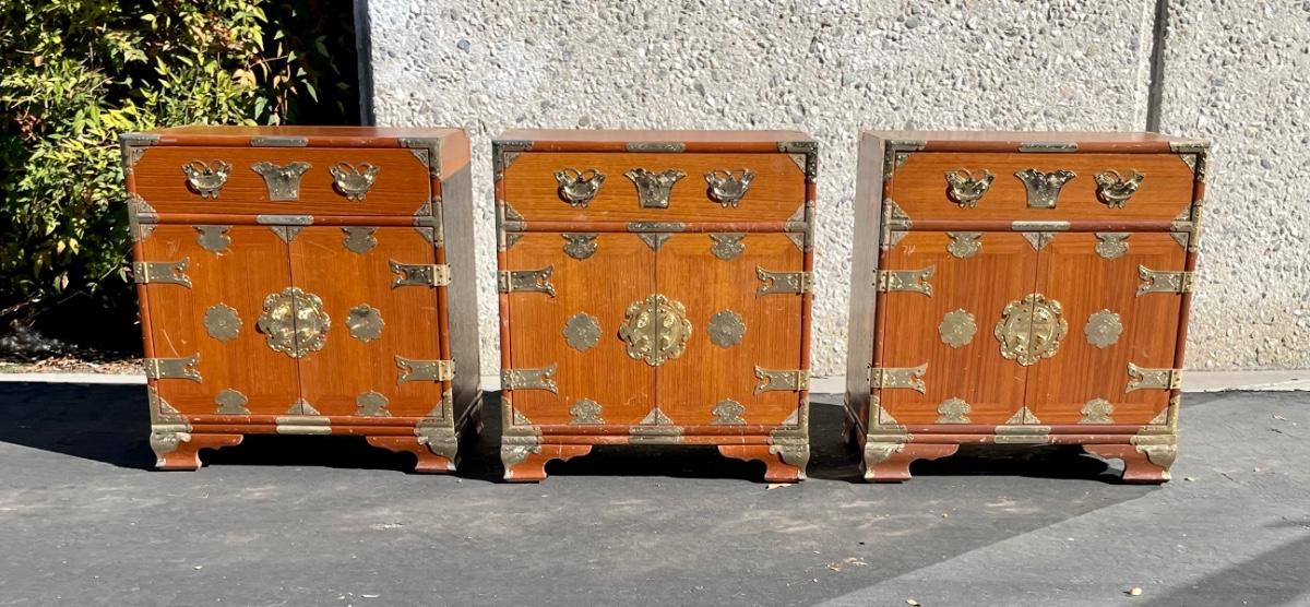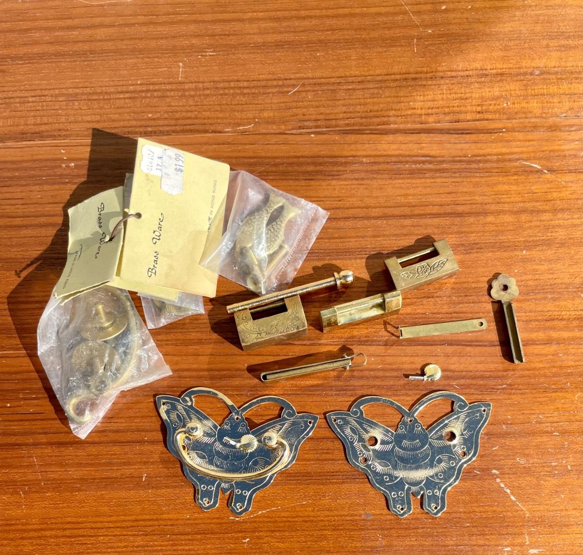 Solid wood construction with polished brass handles, fittings, and corner protectors. Single drawer at the top. Doors open to reveal a cubby with 1 shelf on the left and a 3-drawer unit on the right. 24" tall, 14" deep and 22" wide. Extra brass fittings included, see photos.