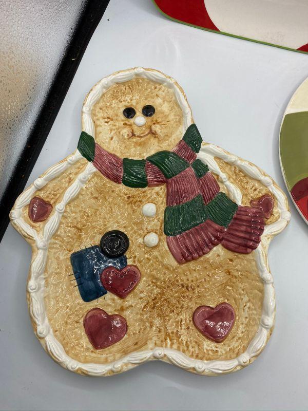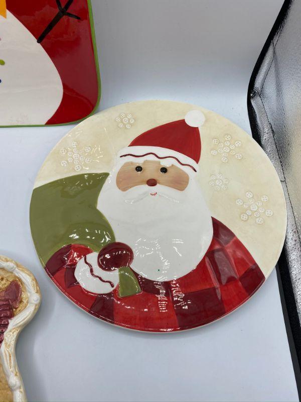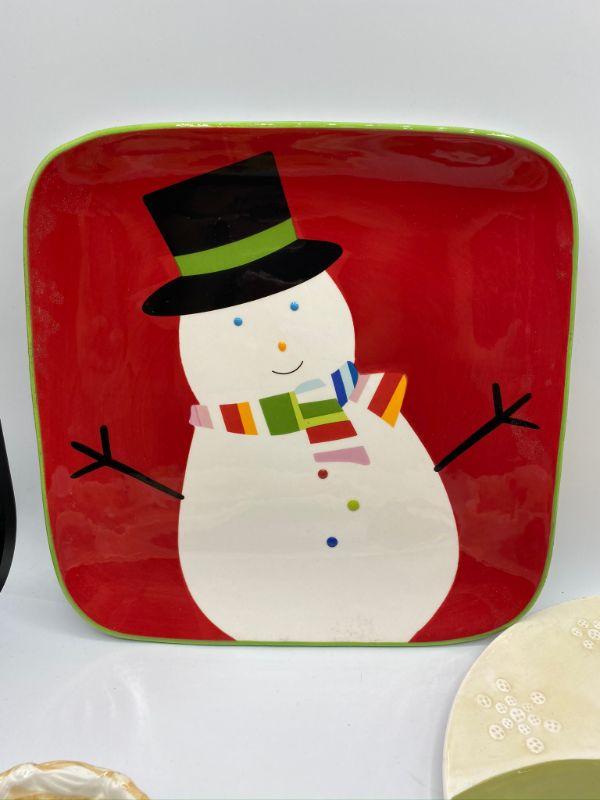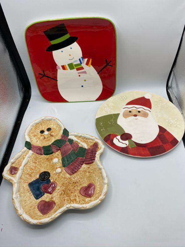 Set of 3 Christmas serving plates. Holiday platters are in good condition, no chips. There is a little crazing on the square snowman plate near the edges.
