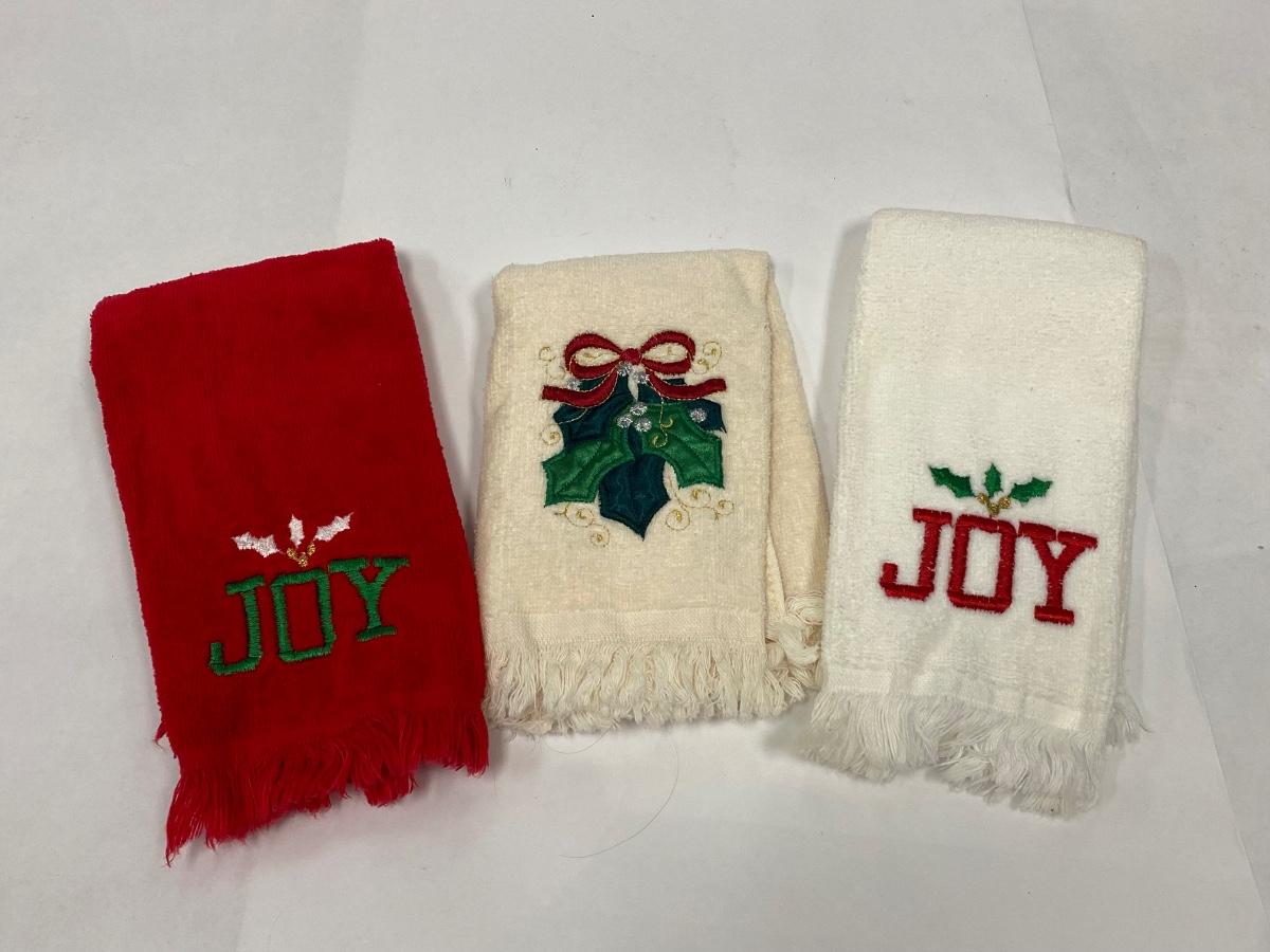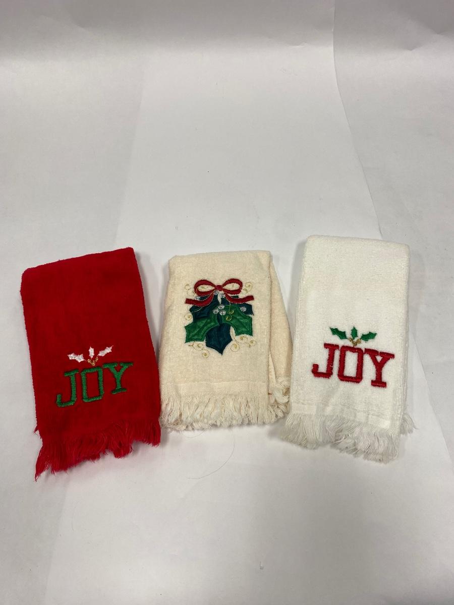 Set of 3 Christmas Holiday Seasonal Decorative Hand Towels. Small, great for decor more than use. May have discolor from age and storage.