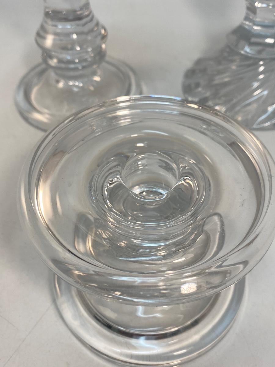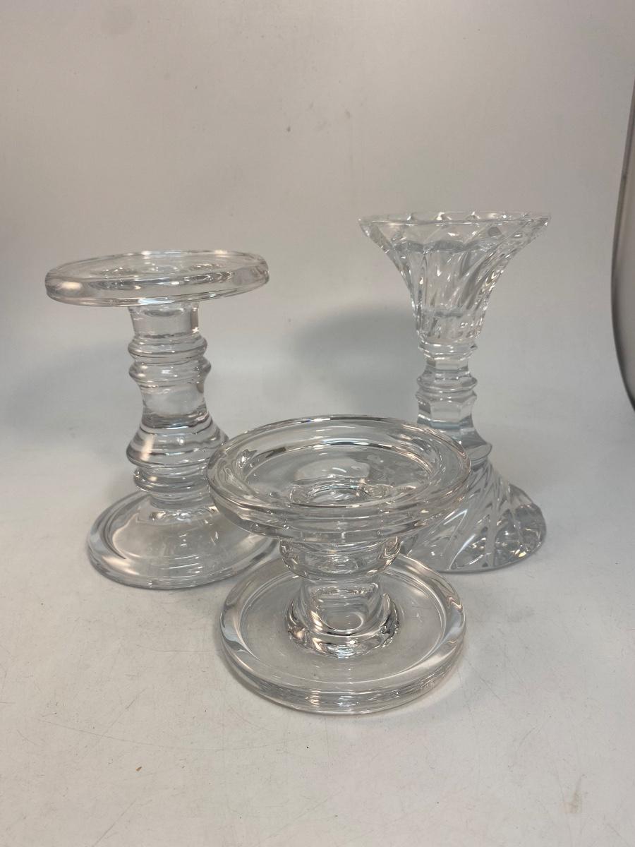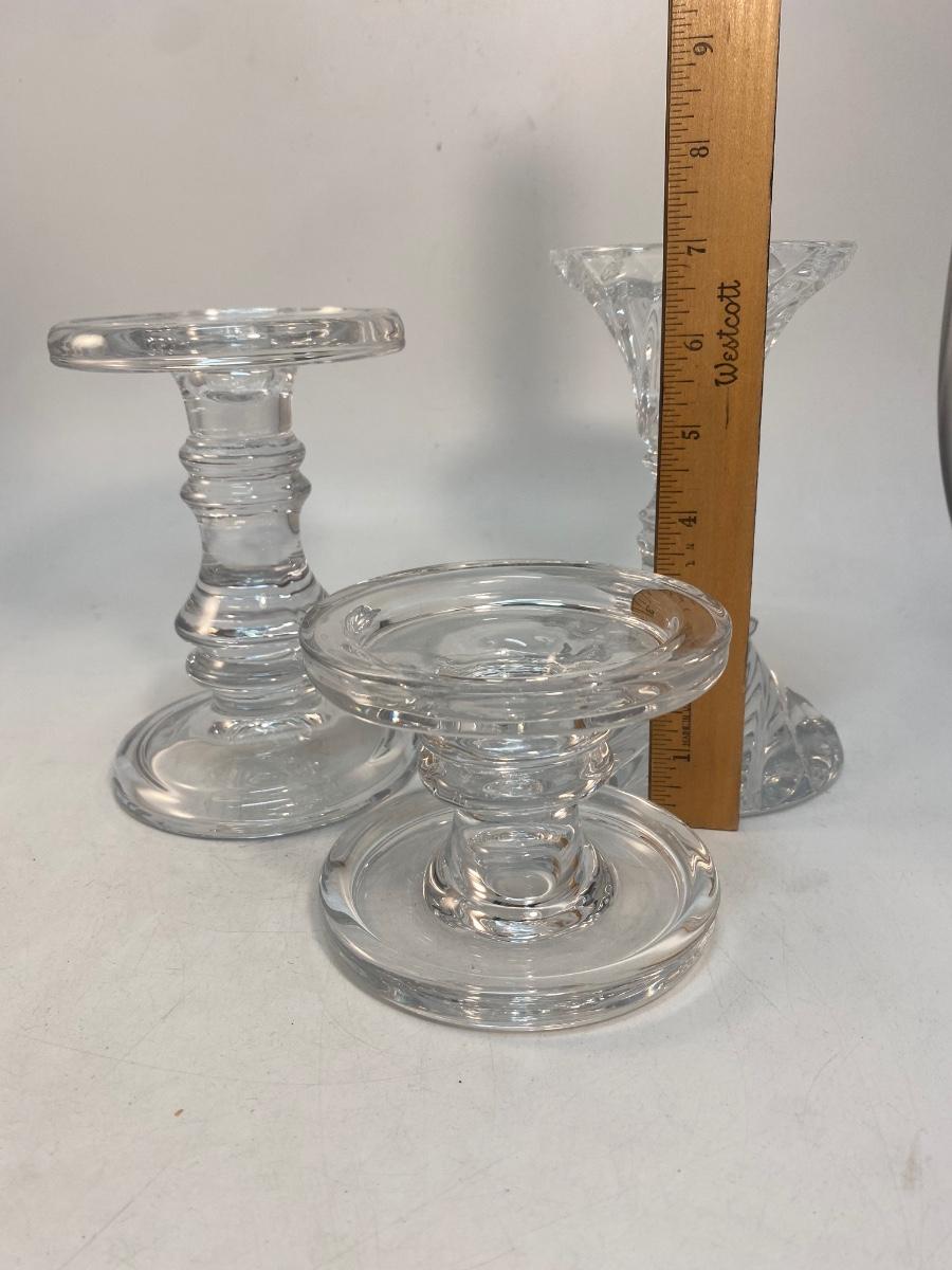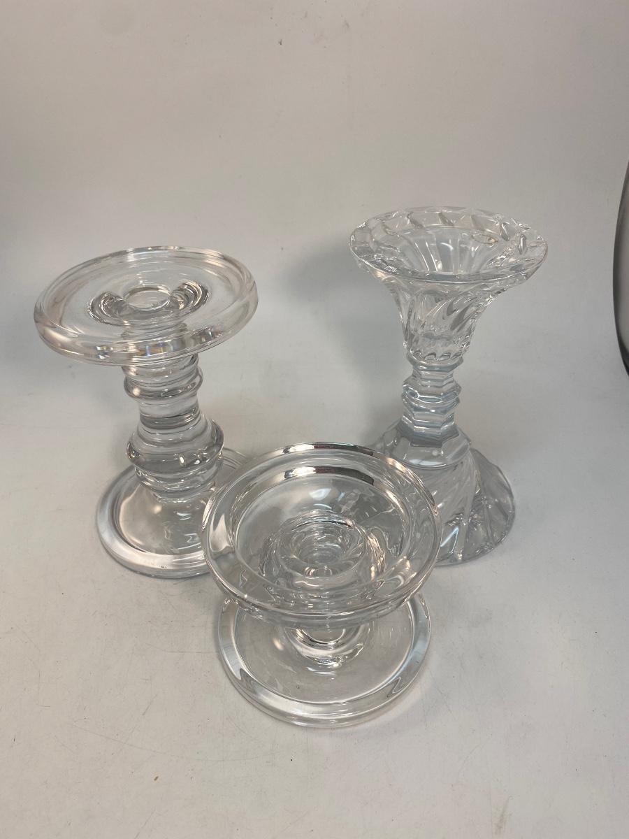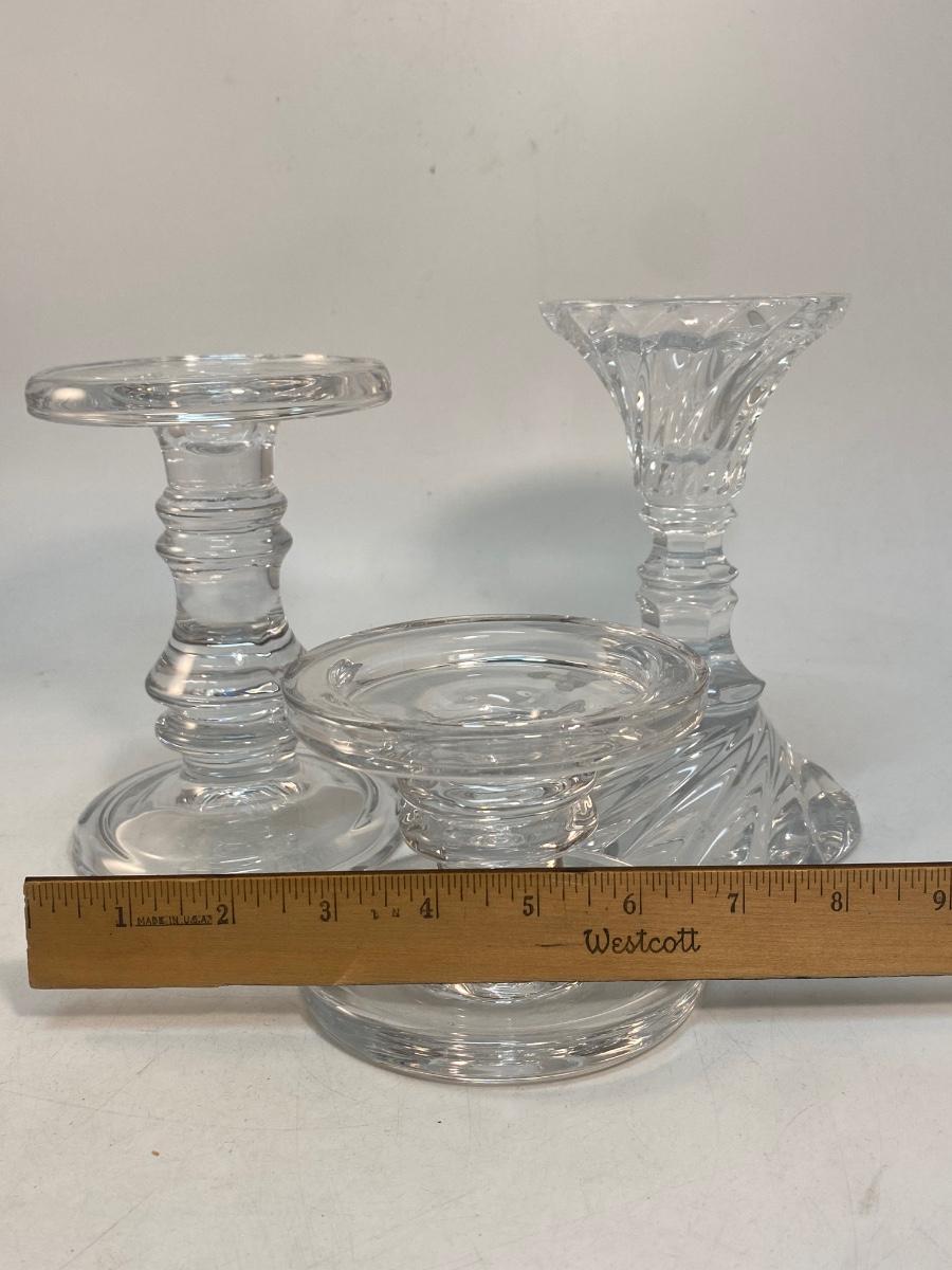 Set of 3 Clear Glass Pillar & Taper Candlestick Holders. Good condition. Can hold taper candles up to 3" pillar candles.