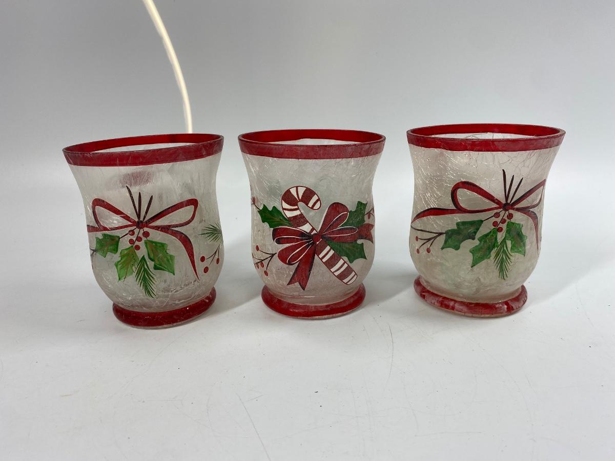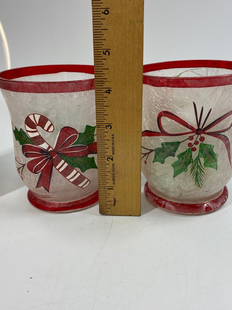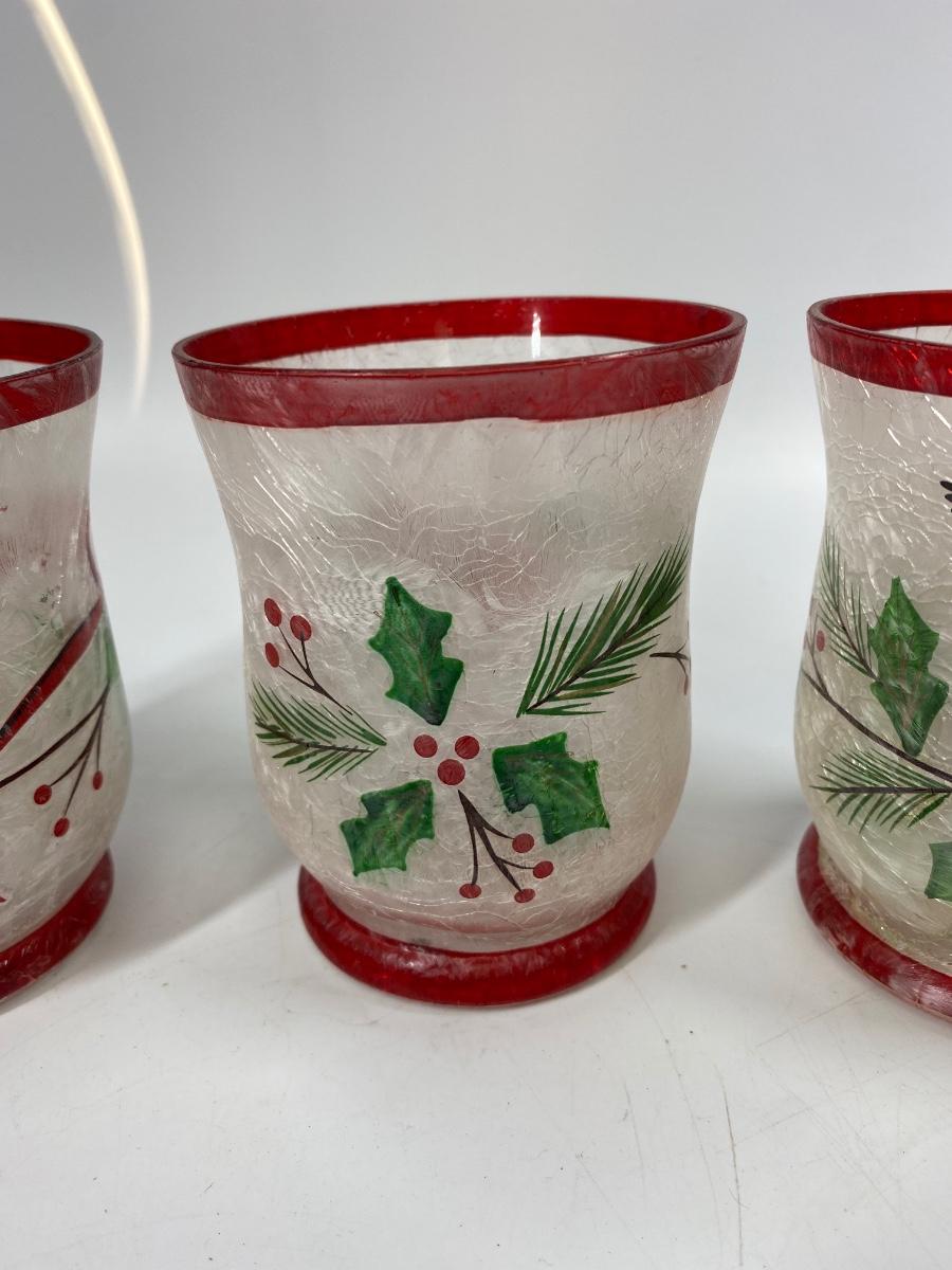 Set of 3 Crackle Glass Winter Holiday Candle Holders. Different images on two sides. Good condition. Come with two sets of battery-operated fairy lights.
