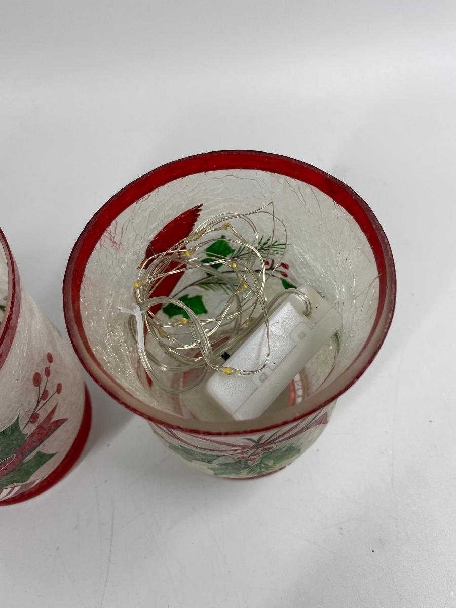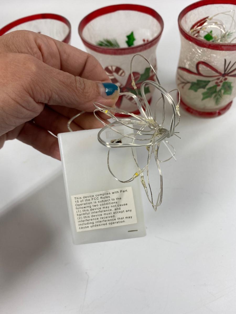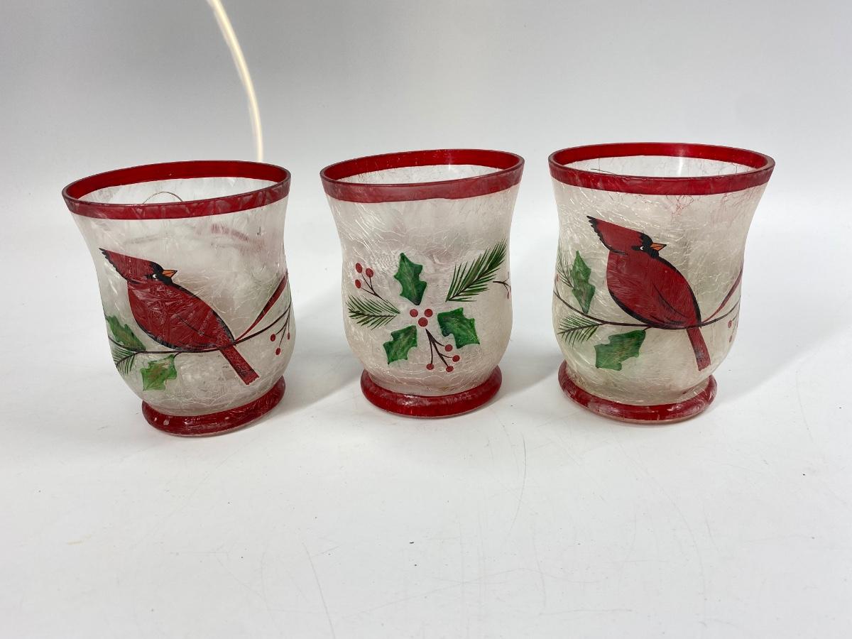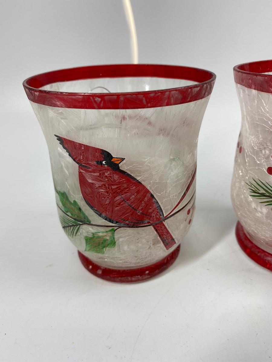 Set of 3 Crackle Glass Winter Holiday Candle Holders. Different images on two sides. Good condition. Come with two sets of battery-operated fairy lights.