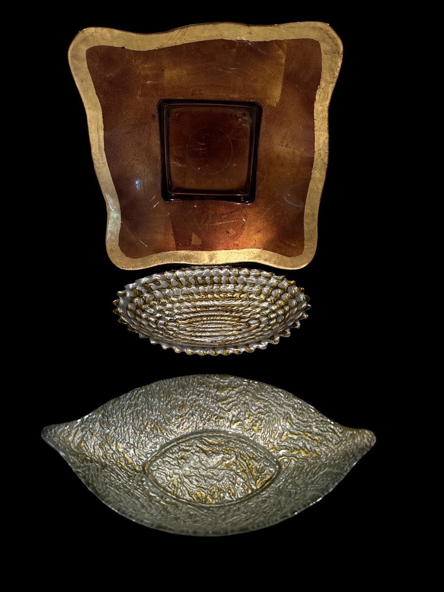 • A textured oval leaf-shaped dish with a frosted and gold-toned finish 11” ( app)