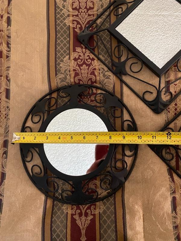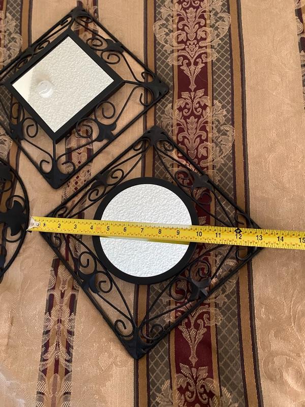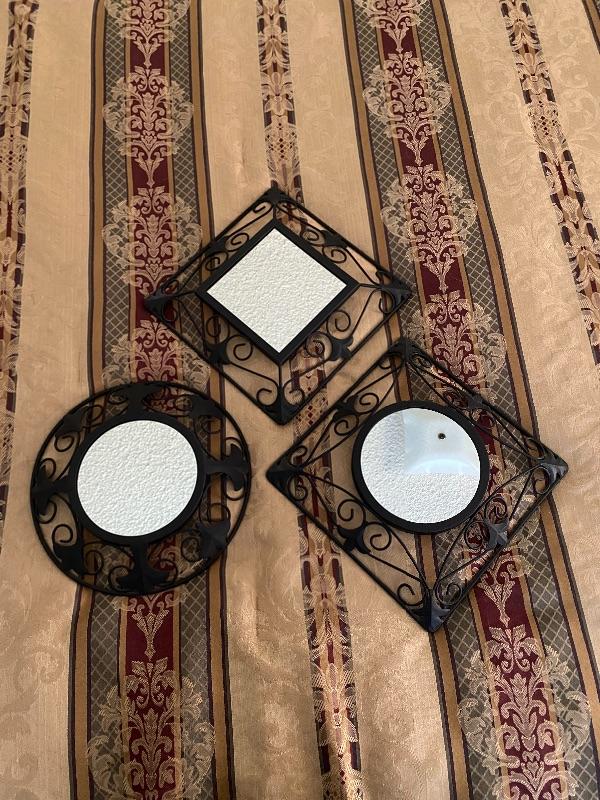 Set of 3 decorative wall mirrors. Metal frames. 10" to 14" size.