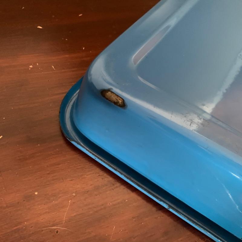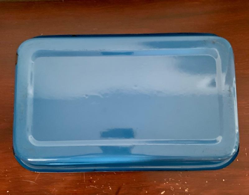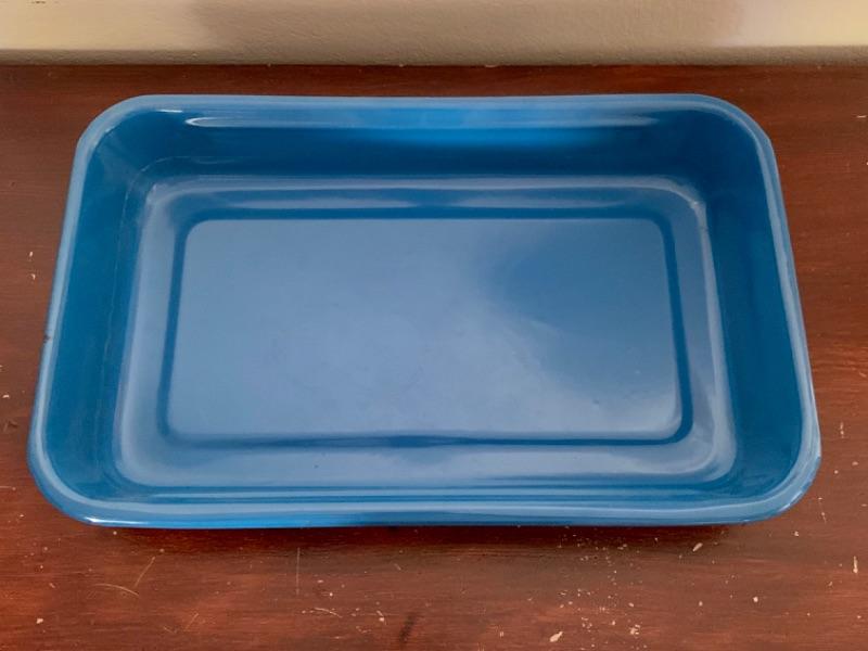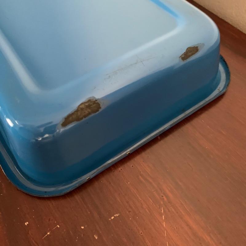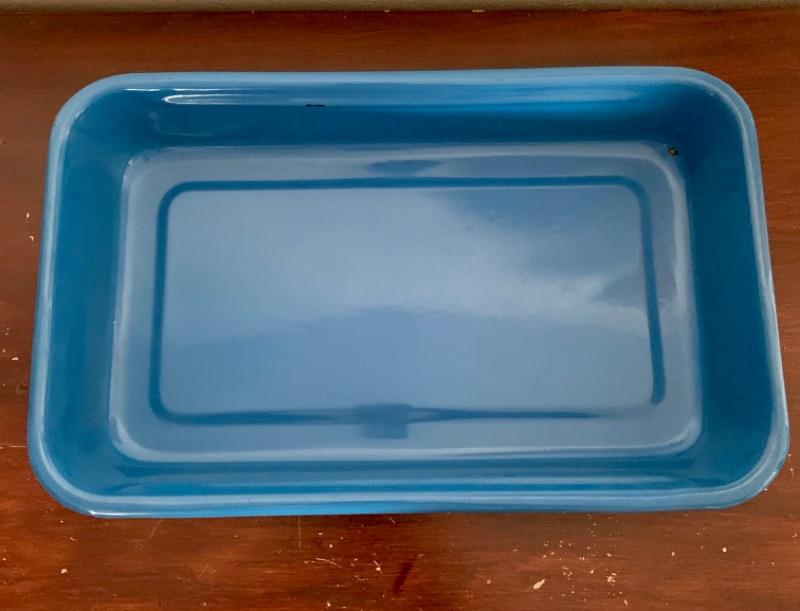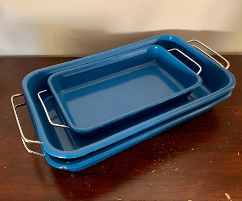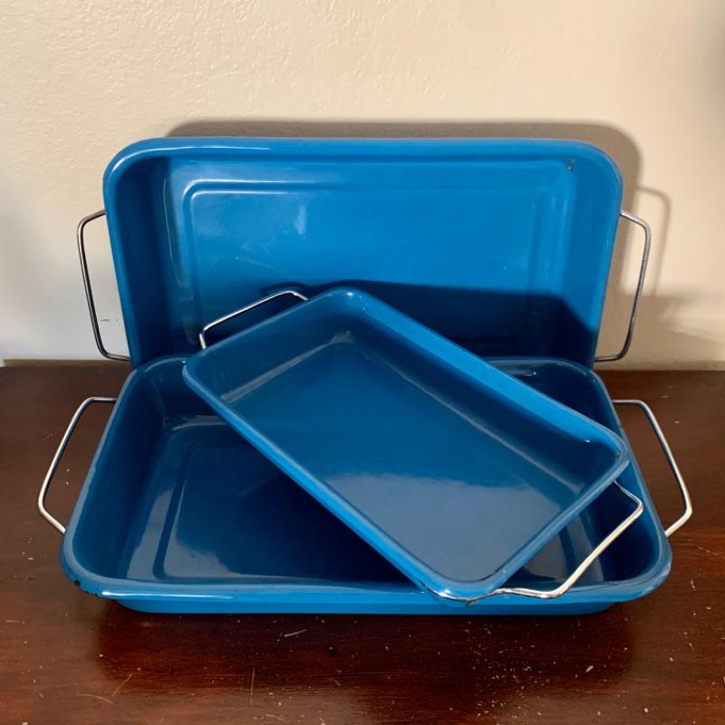 Set of 3, vintage, blue enamel open casserole pans. Each pan has snap on /off removable metal carrier handles. Smallest measures 7 1/2” x 12” and 2 largest measure 10 1/4” x 16 1/2.” Chips to enamel consistent with age.