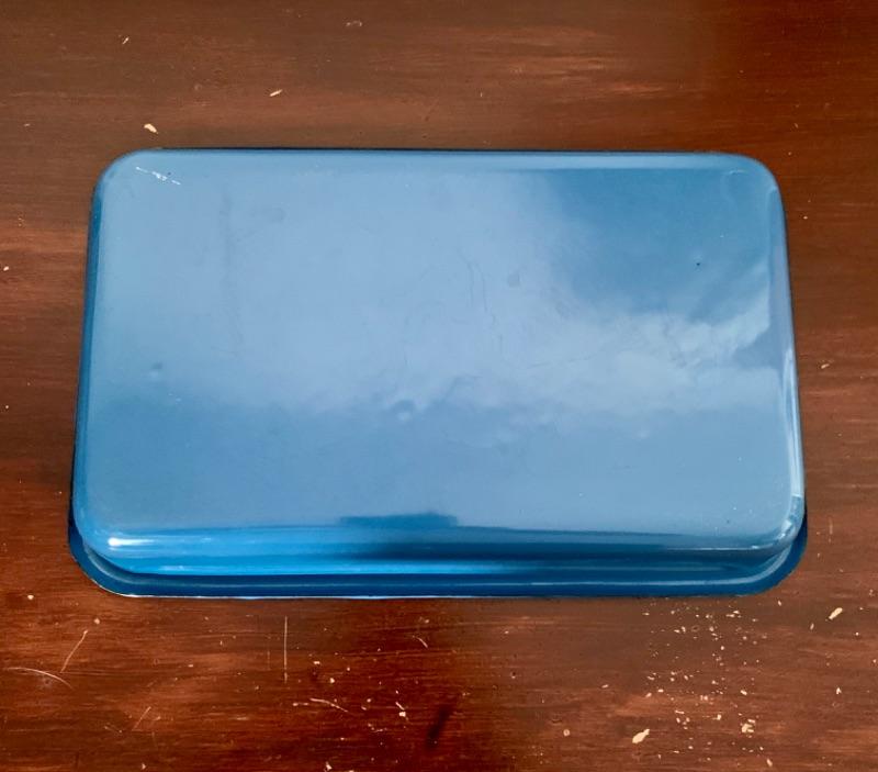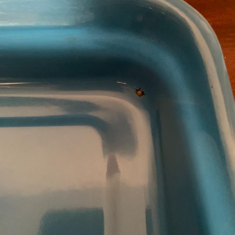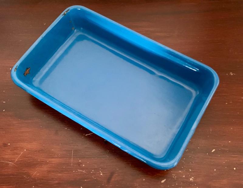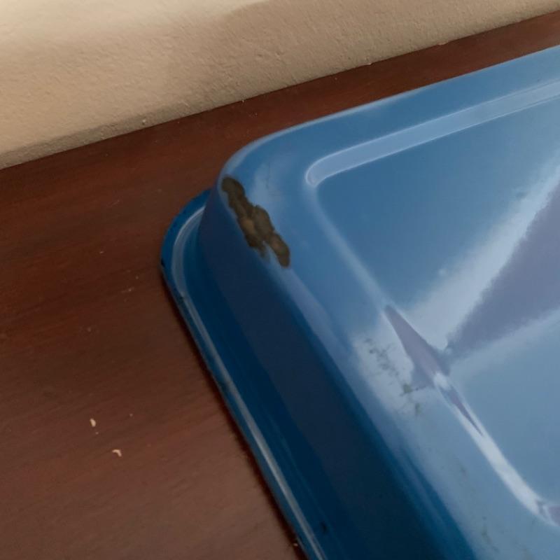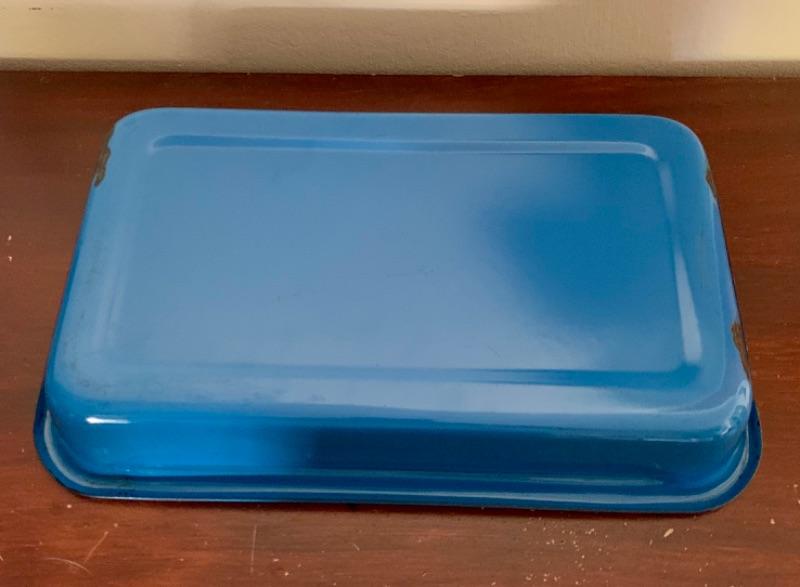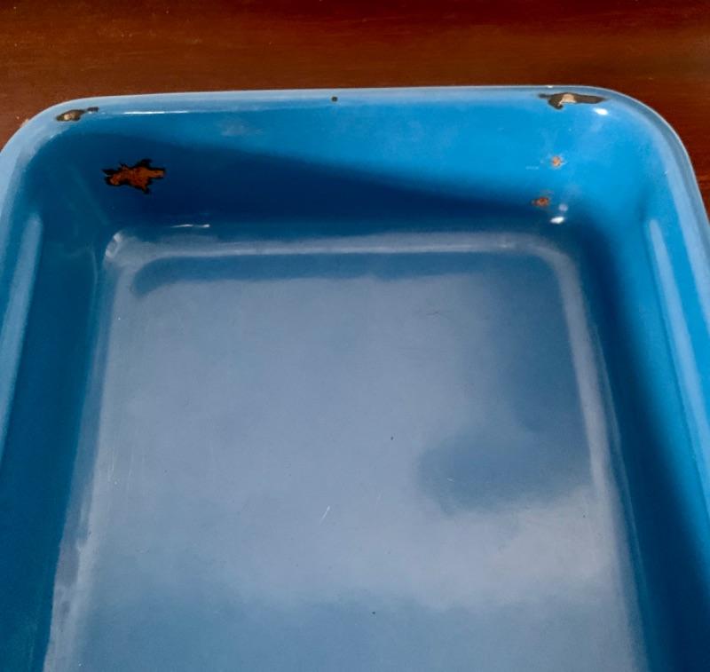 Set of 3, vintage, blue enamel open casserole pans. Each pan has snap on /off removable metal carrier handles. Smallest measures 7 1/2” x 12” and 2 largest measure 10 1/4” x 16 1/2.” Chips to enamel consistent with age.