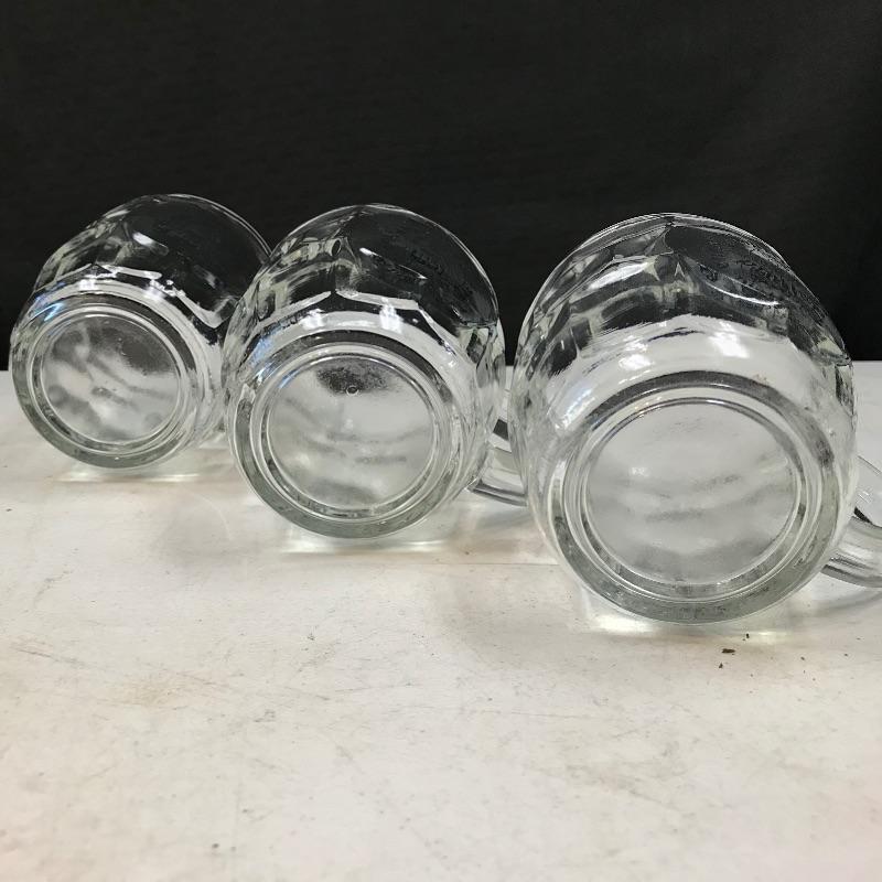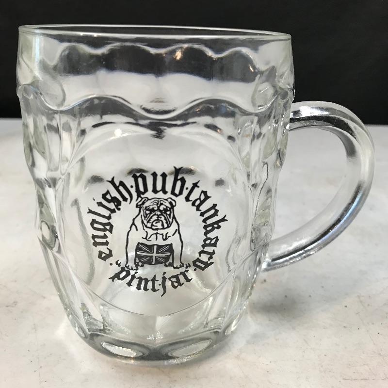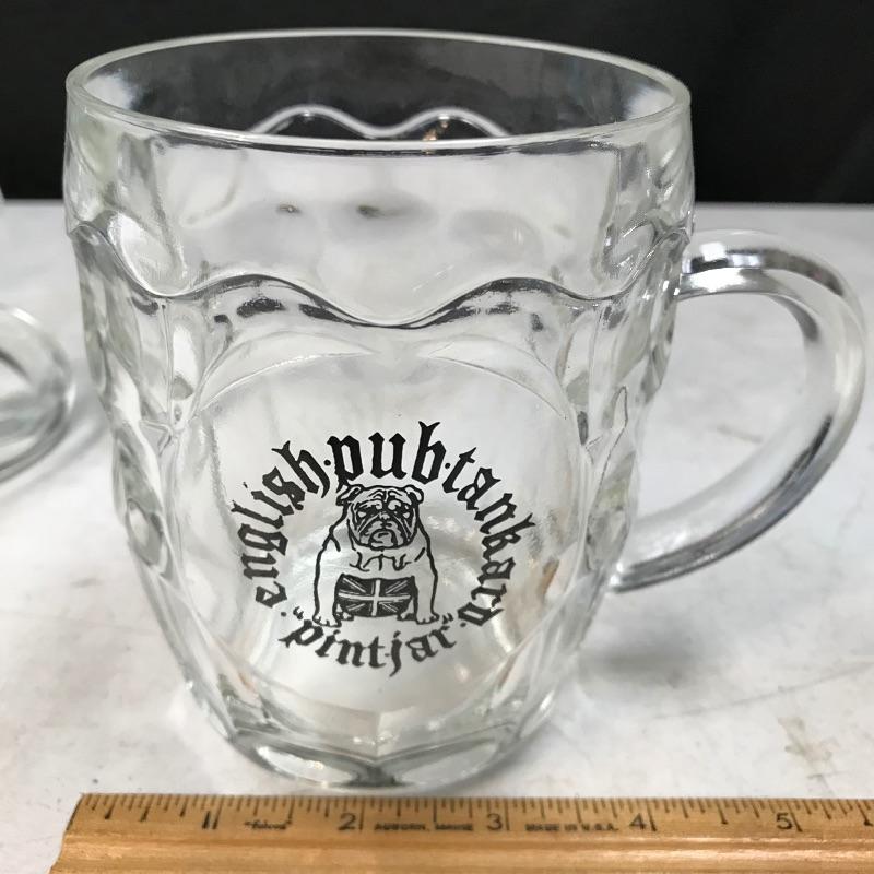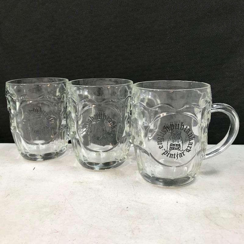 Up for auction or three glass beer mugs. They depict a bulldog standing over a Union Jack flag surrounded by a script which reads, “English pub tankard“. See pictures.