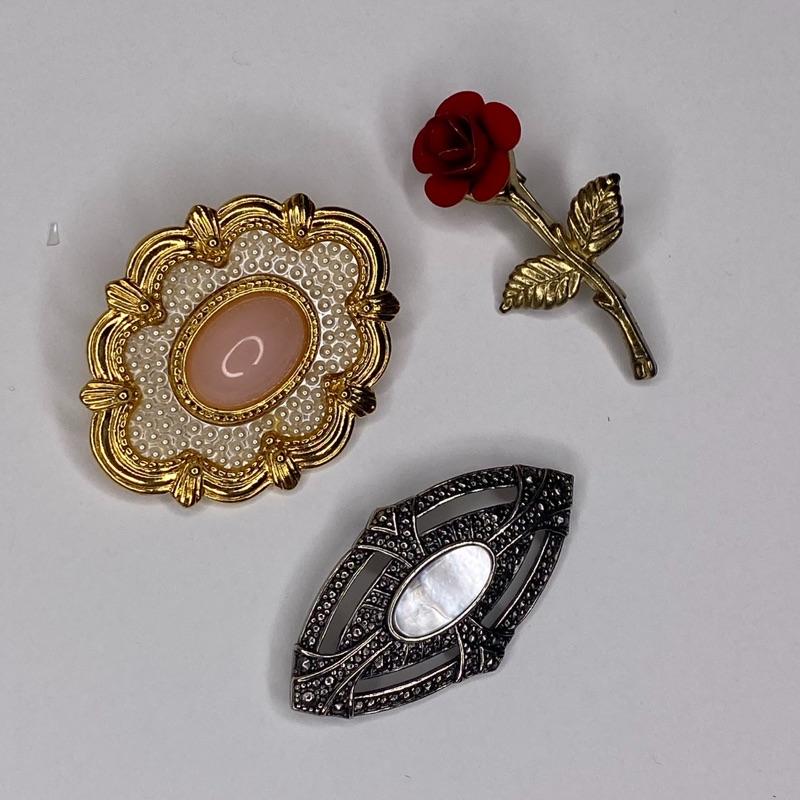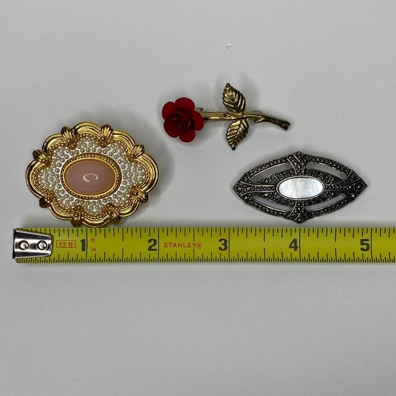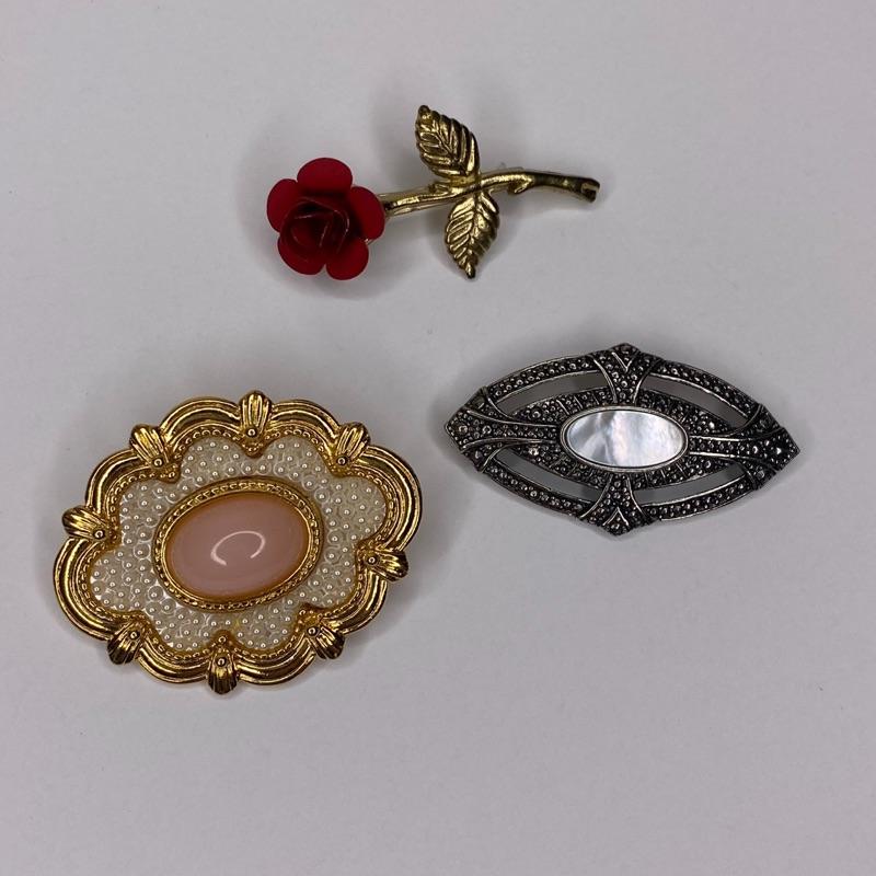 Includes one red rose / one gold with pink stone / one silver with mother of Pearl