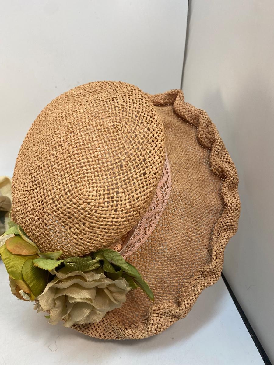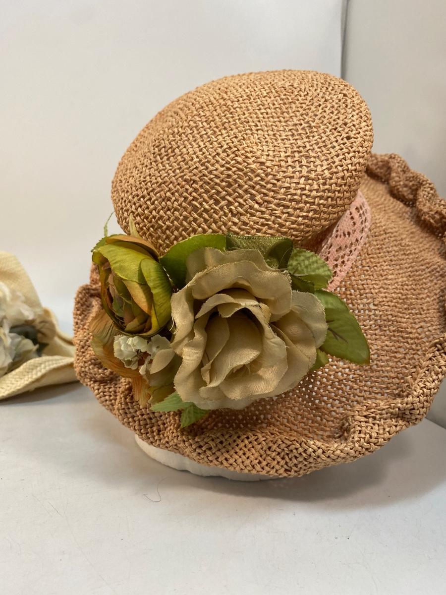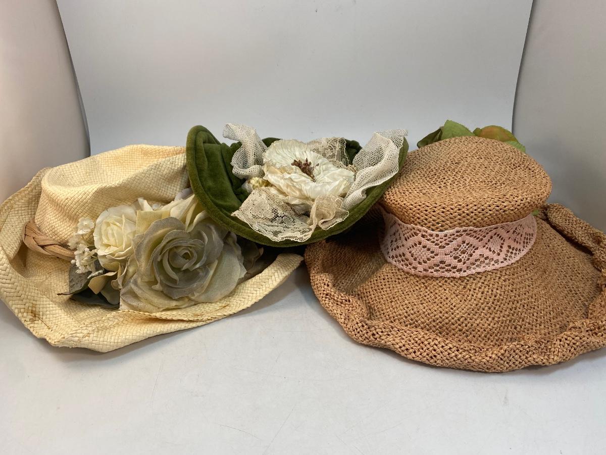 Set of 3 Flower Adorn Floppy Sun Hats. Good condition, may be dusty from display.