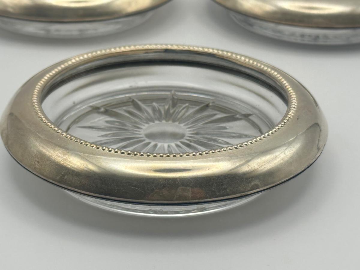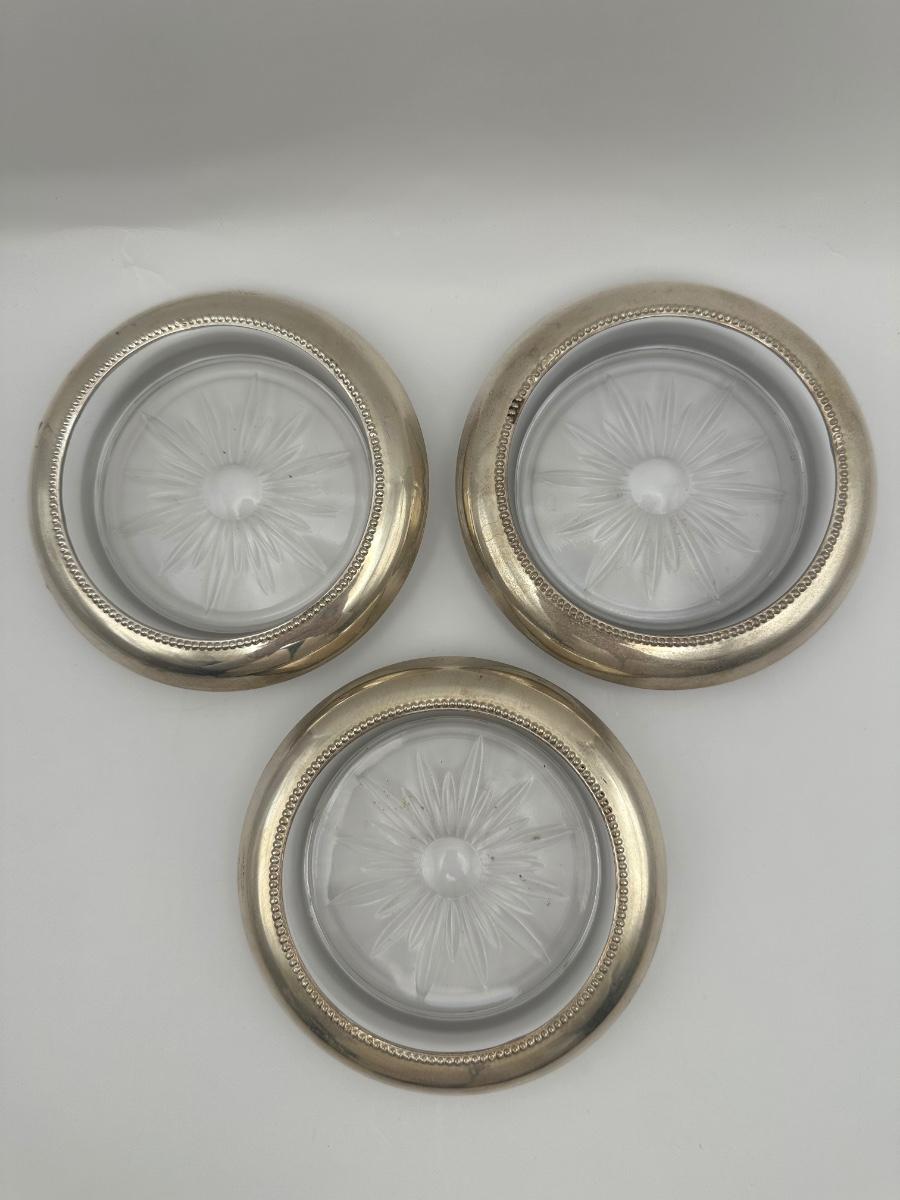 Set of three antique coasters or bottle stands by Frank M. Whiting & Co., featuring sterling silver rims marked “Sterling” with cut glass inserts in a sunburst pattern. Each measures approximately 4” in diameter.