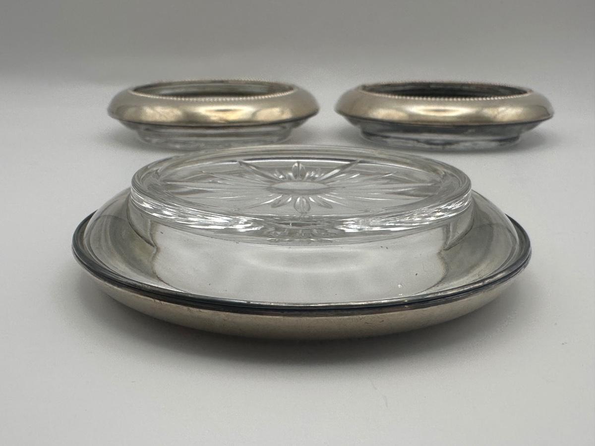 Set of 3 Frank M. Whiting Sterling Silver & Cut Glass Coasters / Bottle Stands