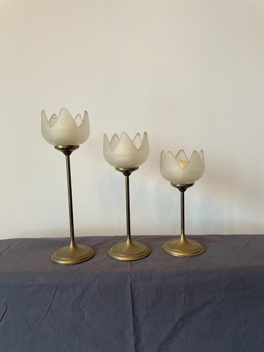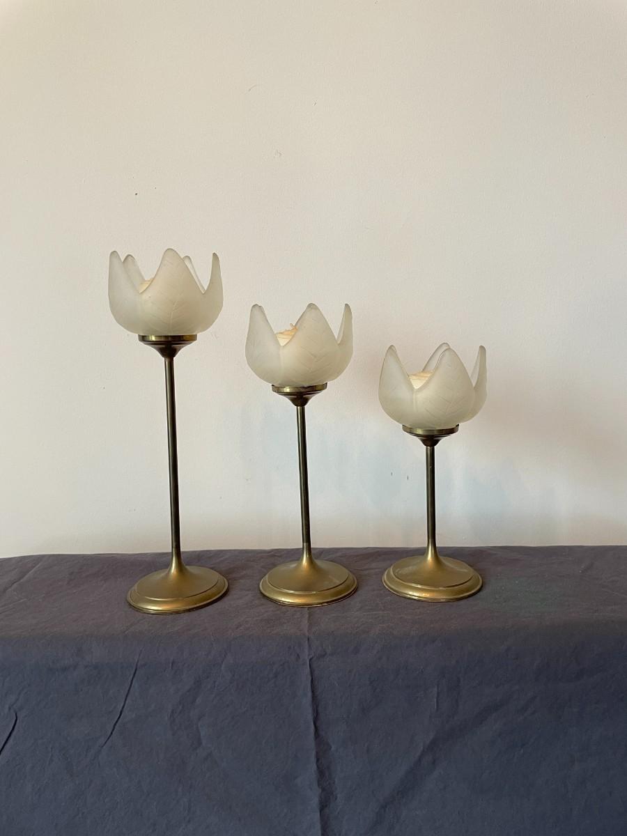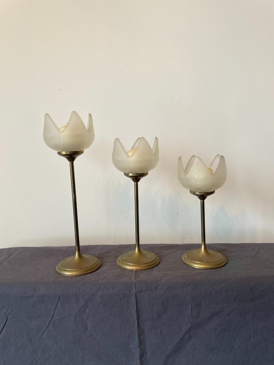 Set of 3 Frosted Glass and Brass Tulip Flower Candle Holders