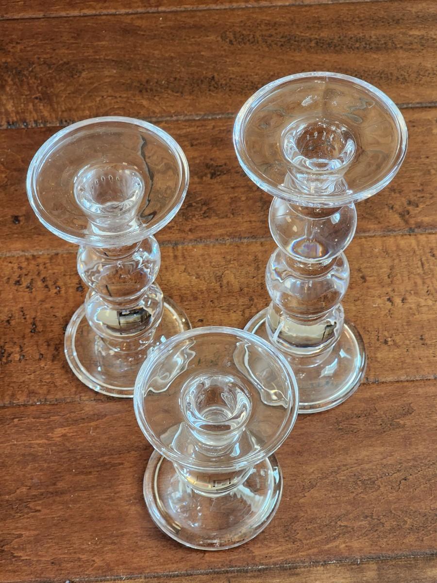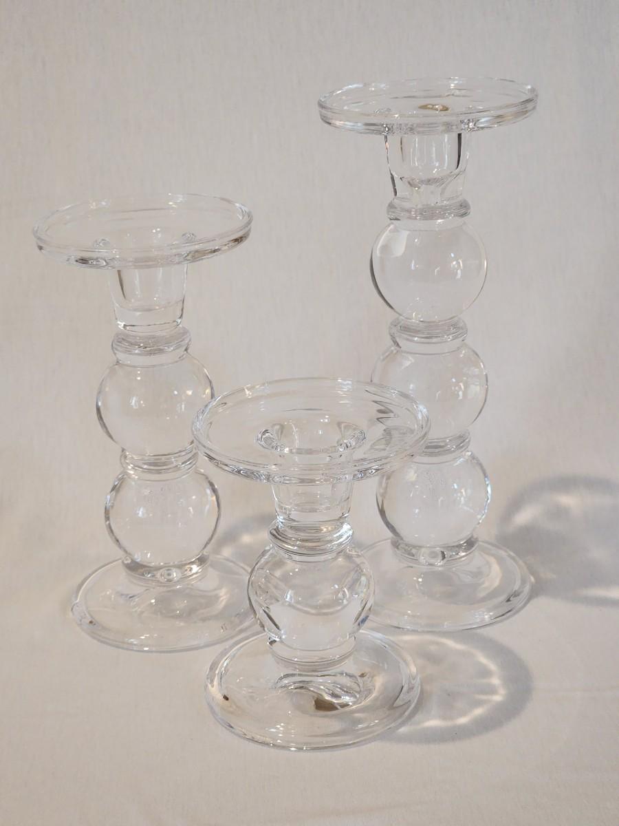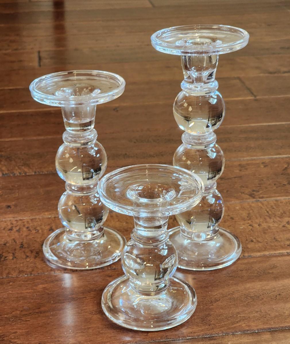 Set of 3 in different sizes with "bubble & band" bases. Suitable for either taper or up to 3" wide pillar style. 9", 7 3/4" and 3 1/4" tall.