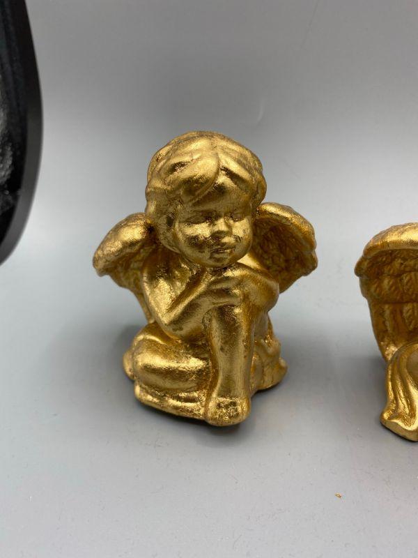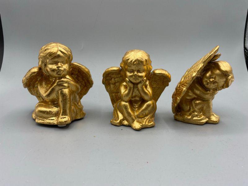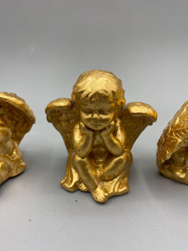 Set of three cherub figurines. Bright gold finish. Angels are all sitting in various positions. Good condition, about 4" tall.