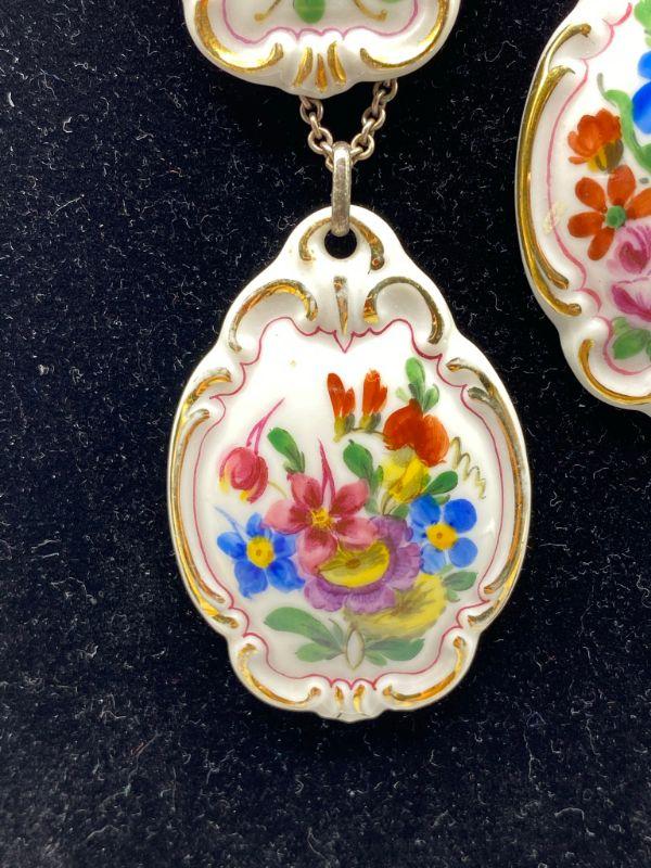 Set of 3 Alka Kunst Bavaria porcelain pendants on chains. Each beautifully painted with floral patterns. Light wear but no chips. About 2" length.
