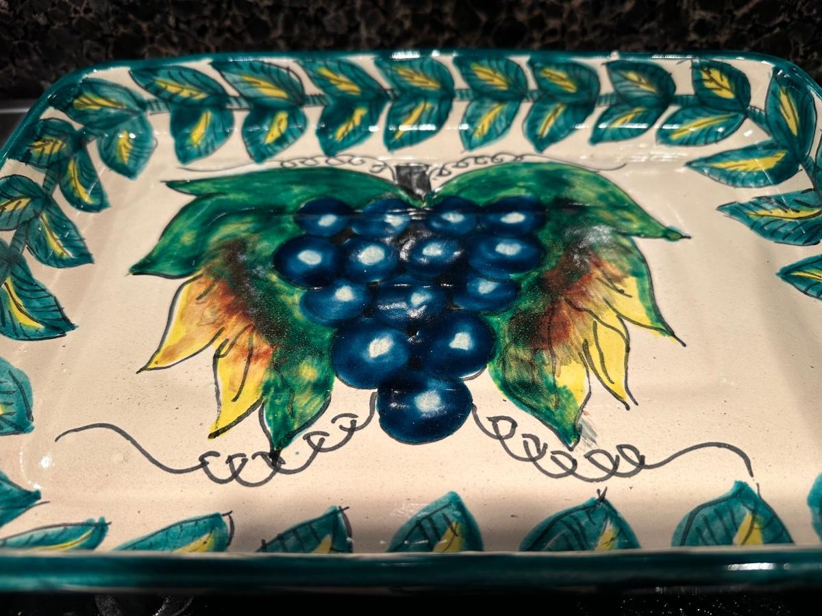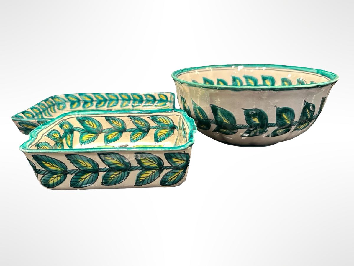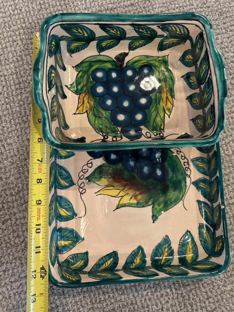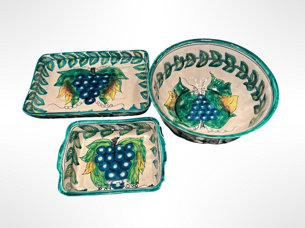 Set of 3 Hand-Painted Mexican Pottery Serving Dishes with Blue Grape and Leaf Design