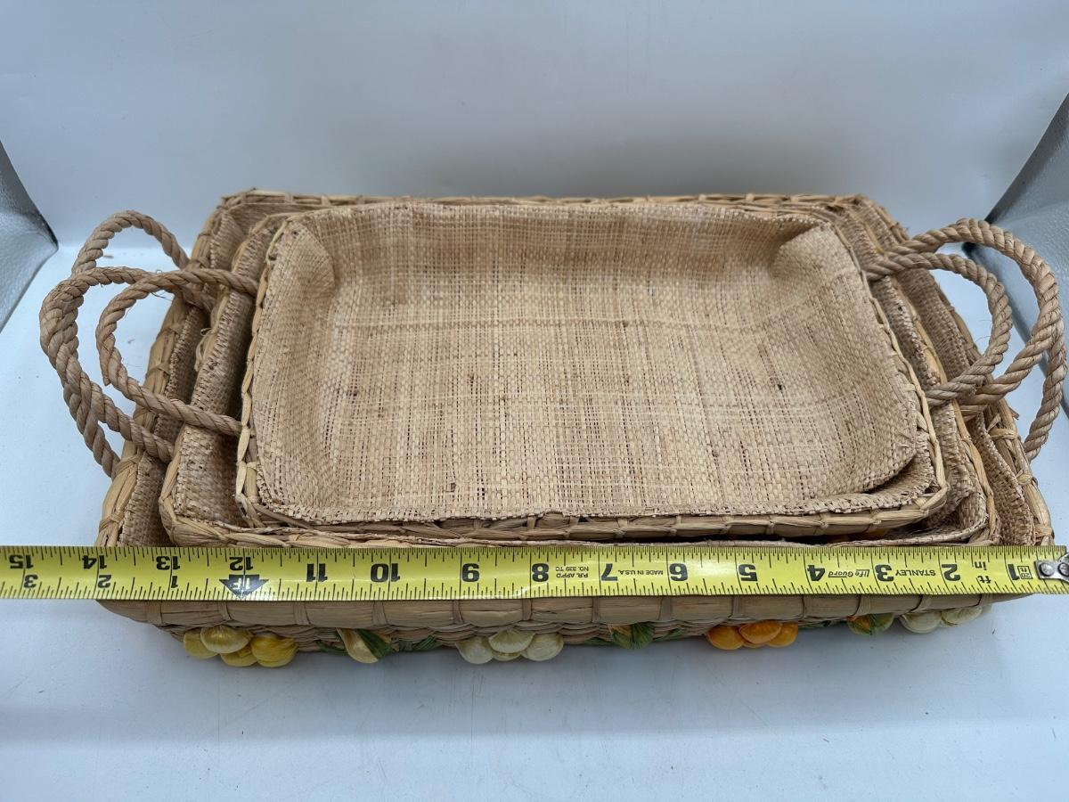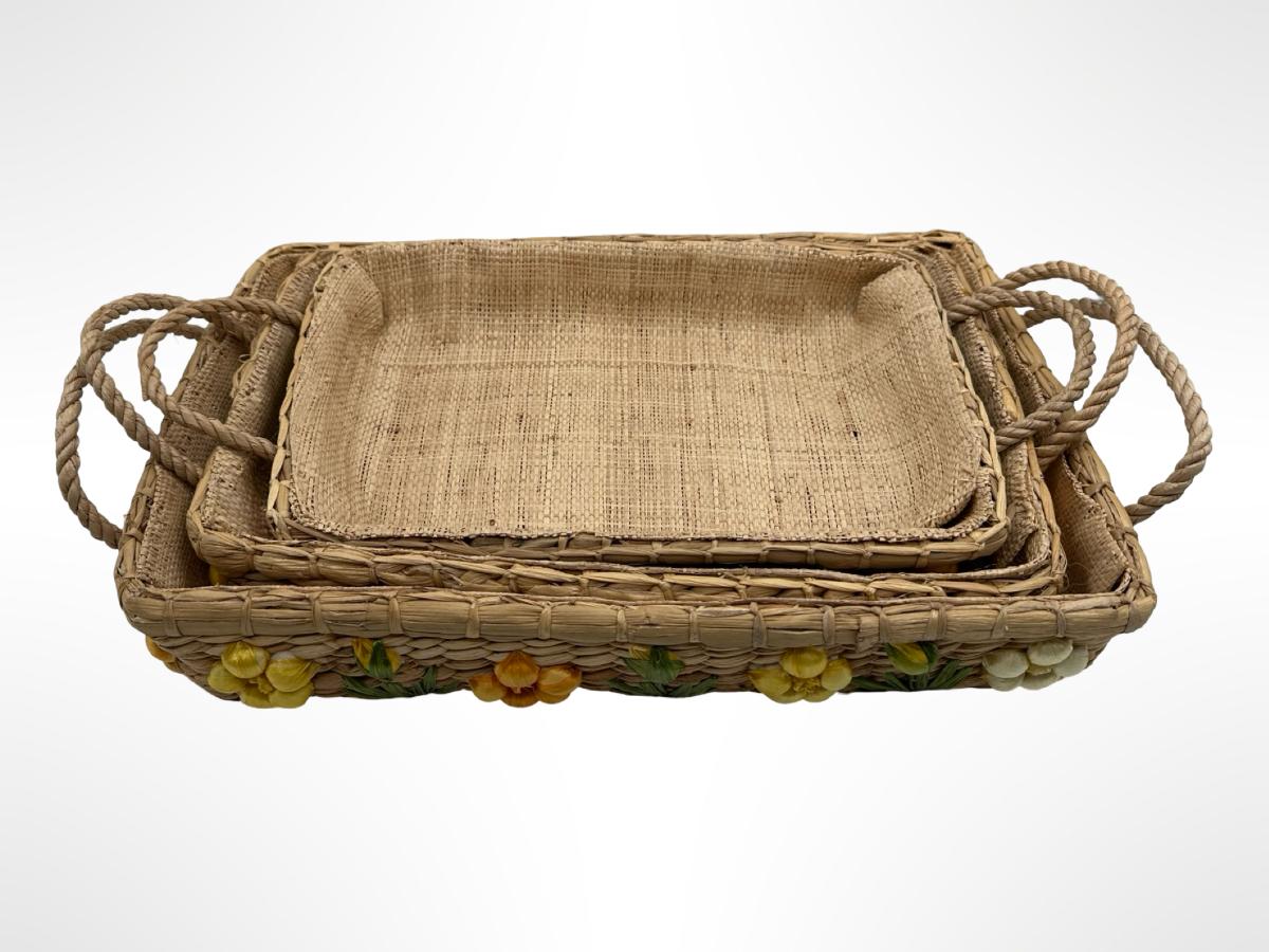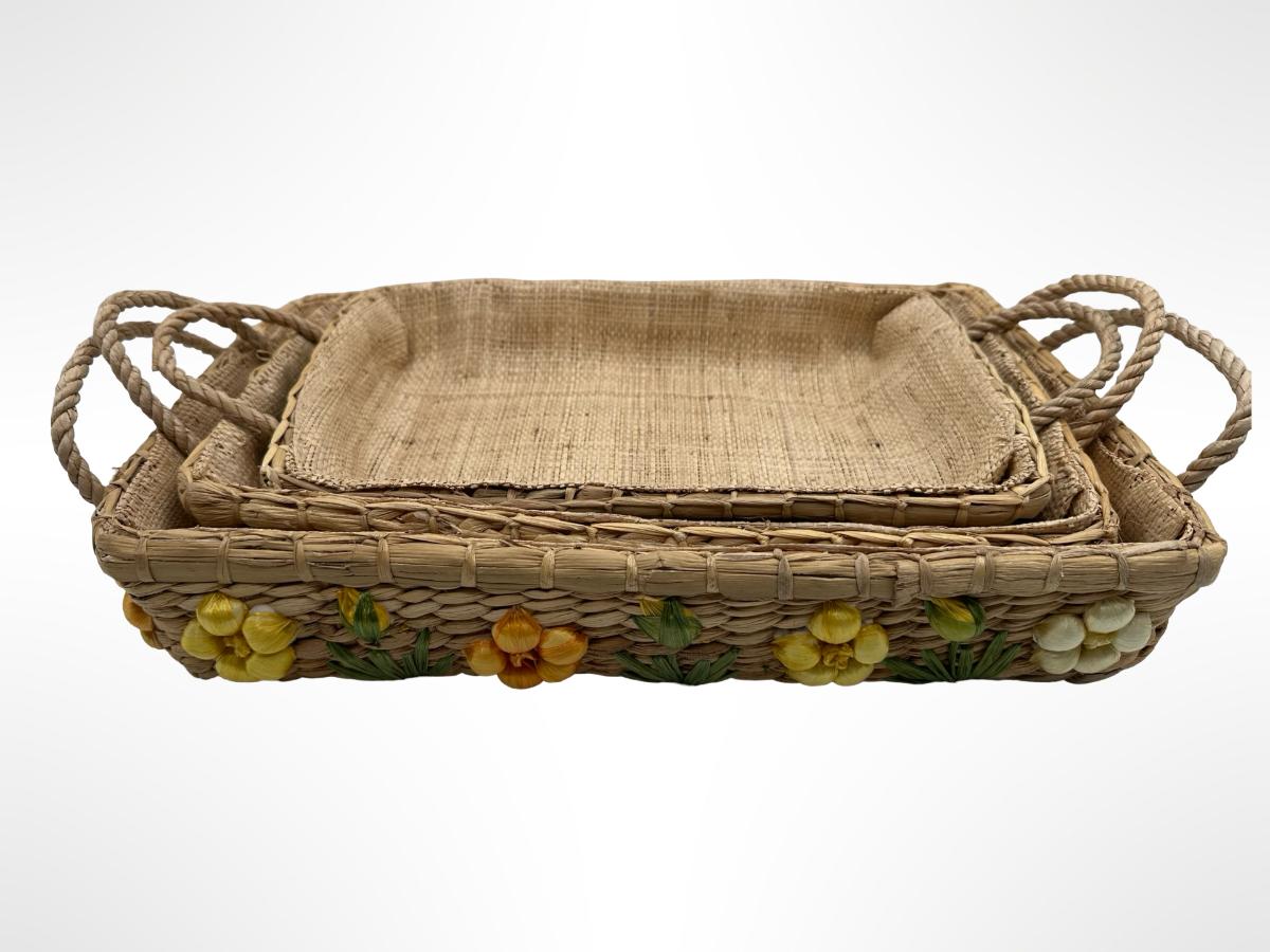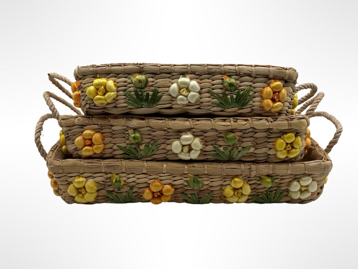 Set of 3 Handwoven Wicker Casserole Holders with Raffia Flower Accents.