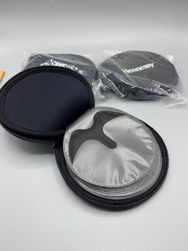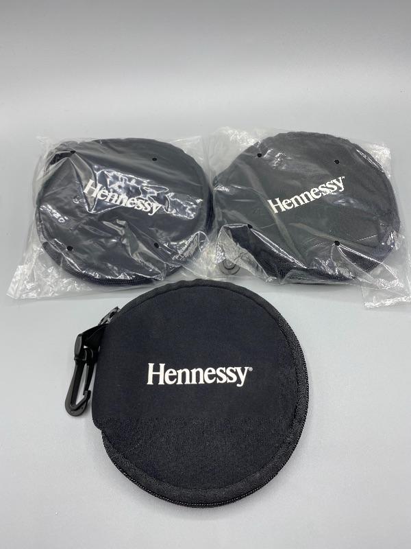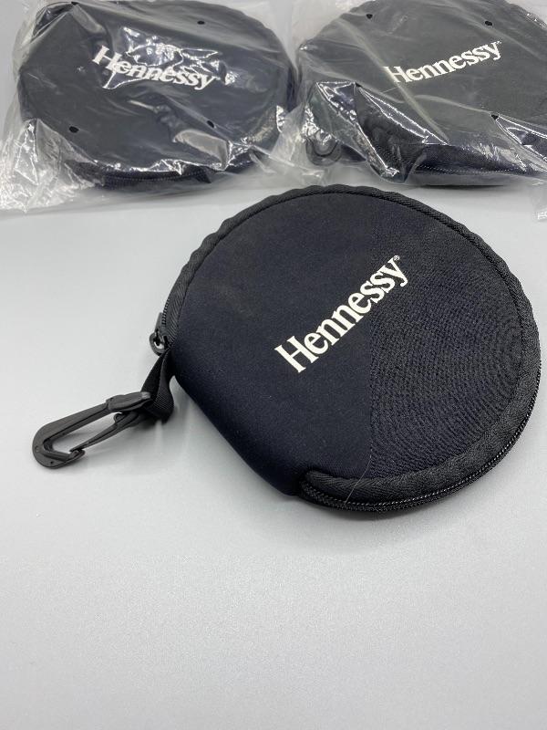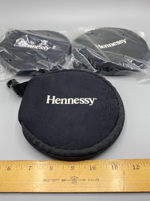 Seet of 3 Hennessy promotional CD cases. Round neoprene zipper case. Has a clip attached for attaching to bags or straps for travel. Holds up to 24 CDs.