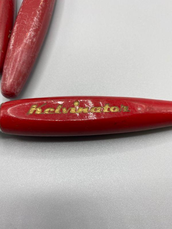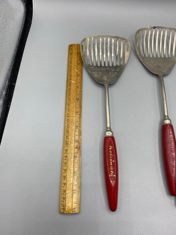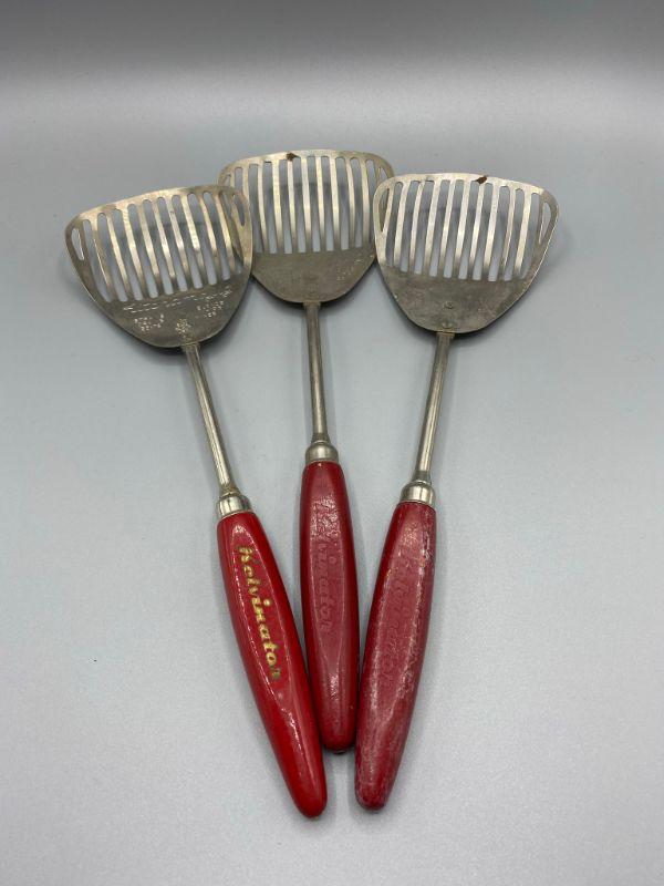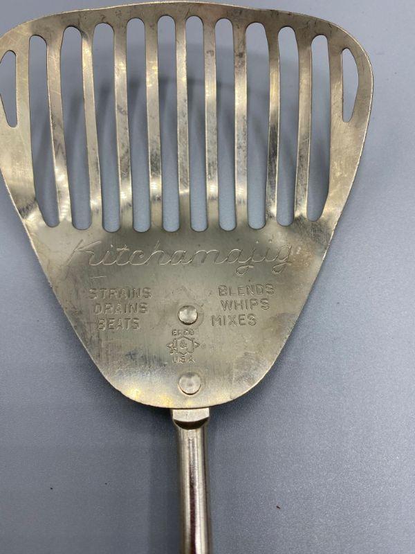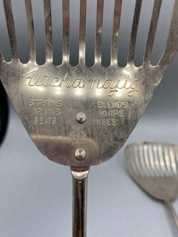 3 Kelvinator "Kitchamajig" multiuse hand tool. It can strain, drain, beat, blend, whip and mix. Good vintage condition.