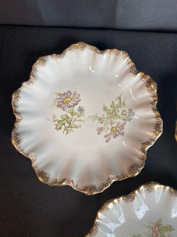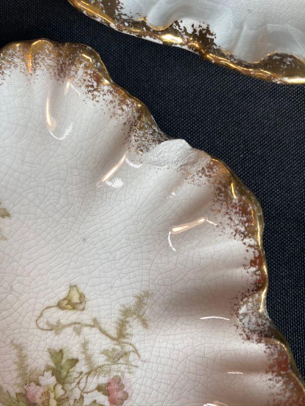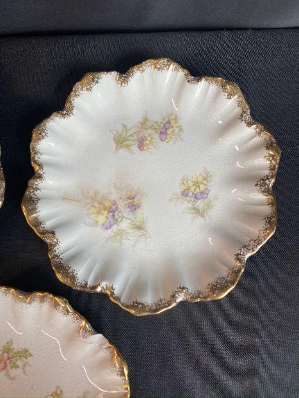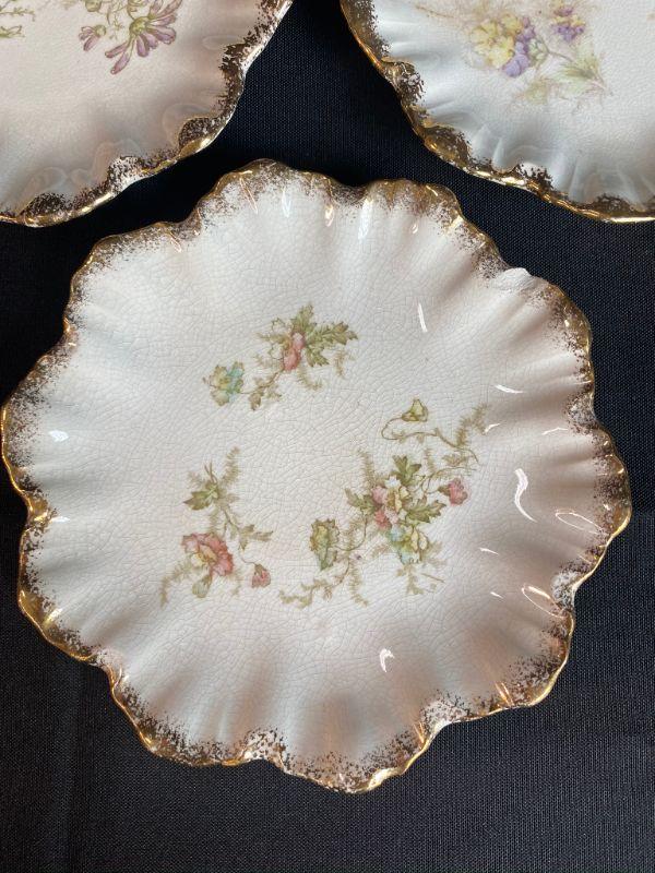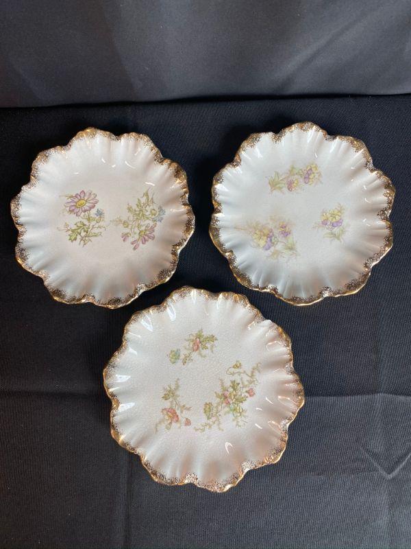 3 Floral Limoges scalloped dessert plates. Different patterns. A couple small chips along edge of 2 plates.