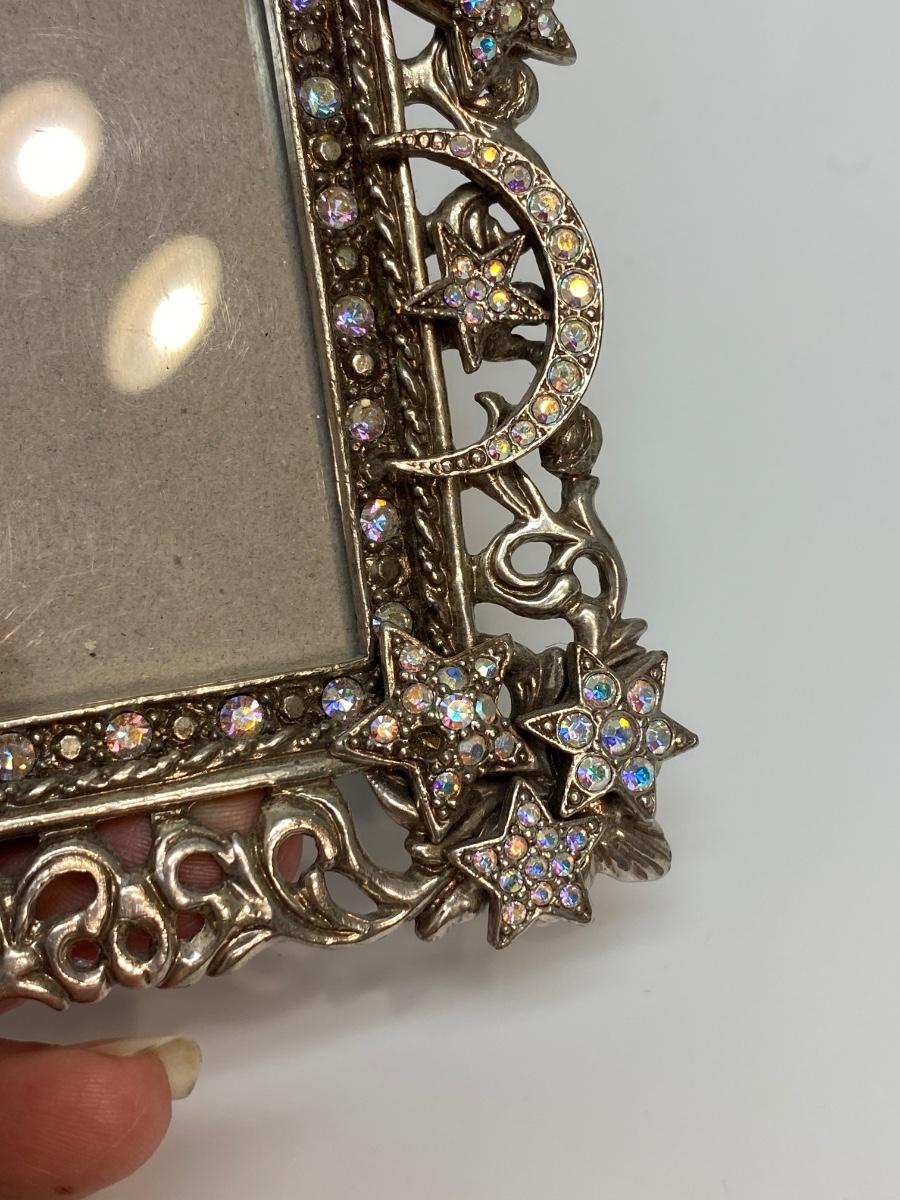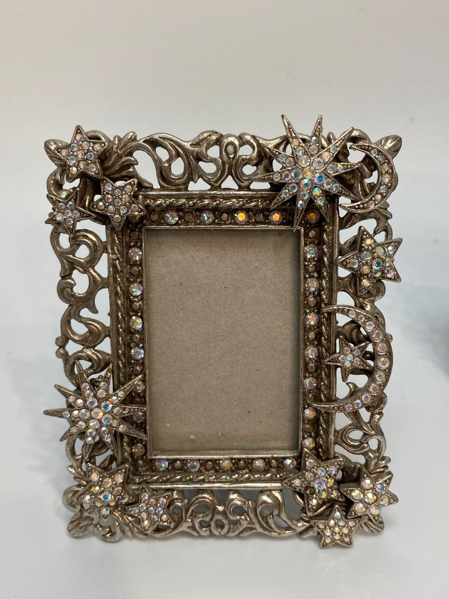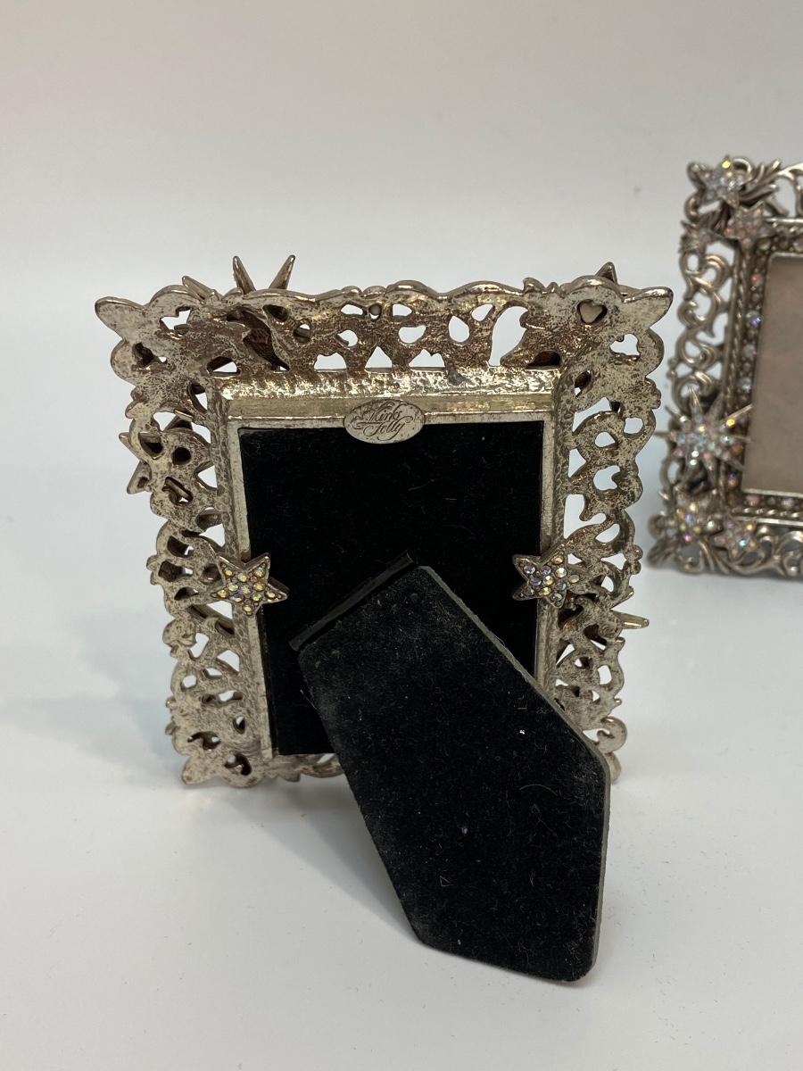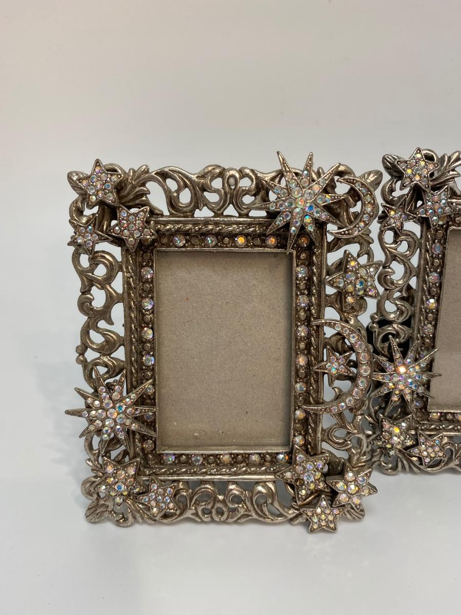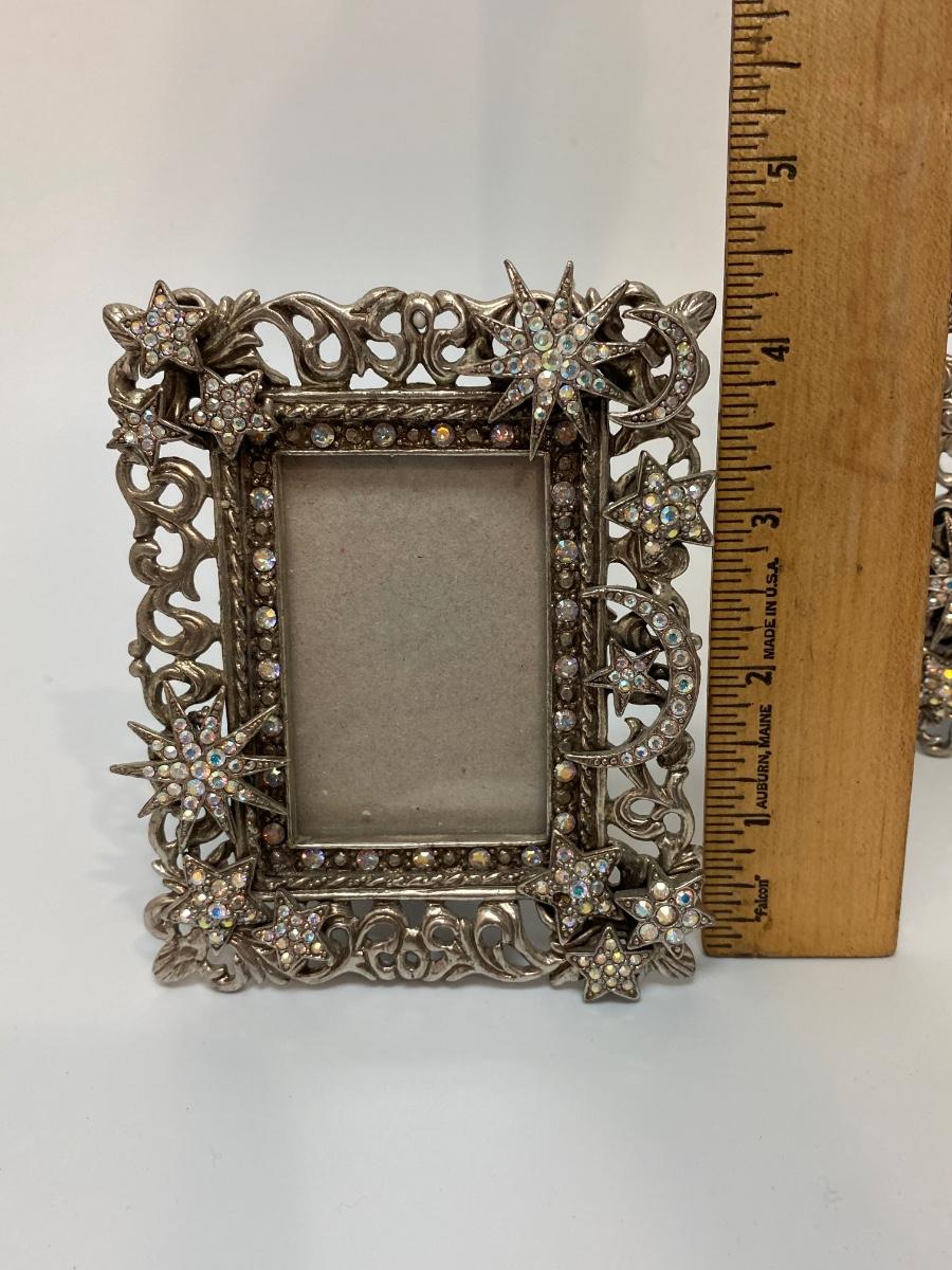 Set of 3 matching metal and rhinestone Kirks Foley picture frames. Good condition. Will hold 2x3 photos.