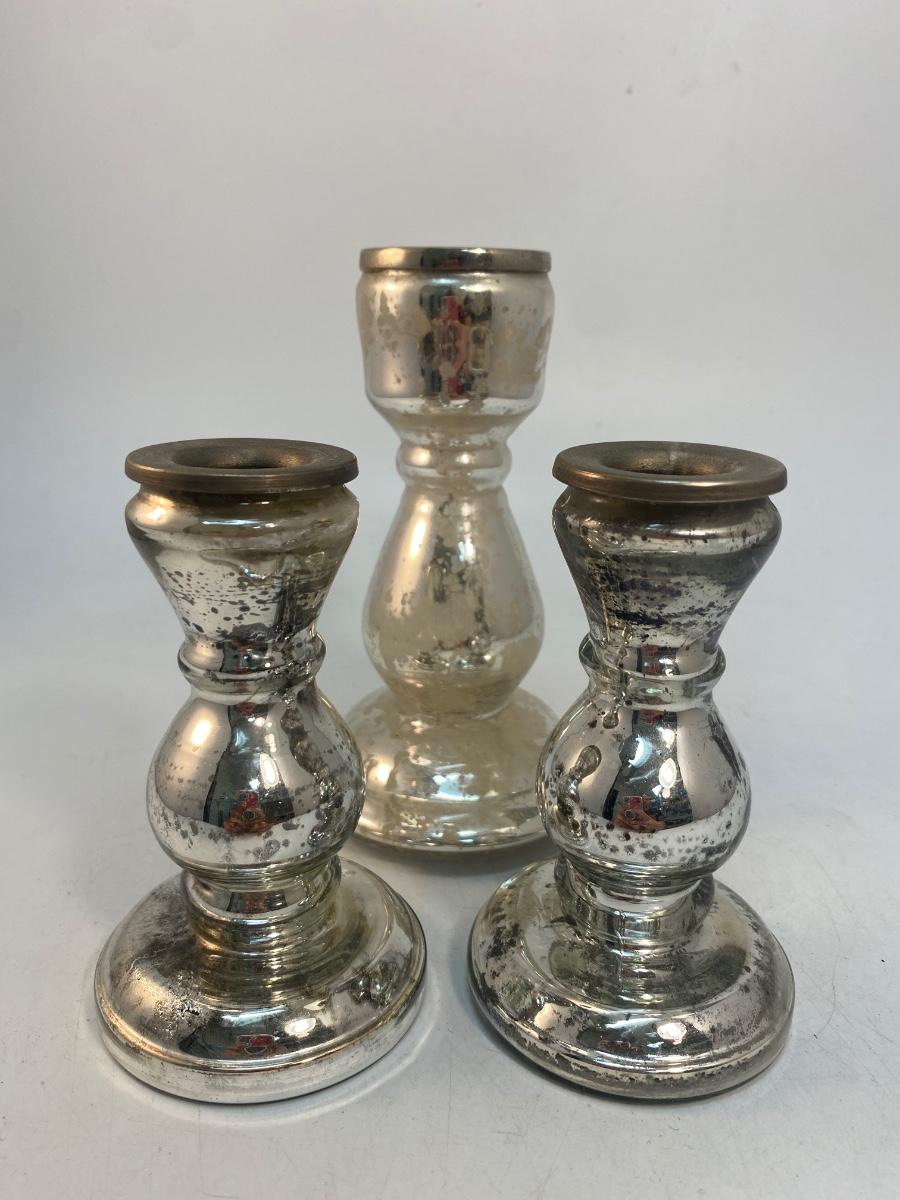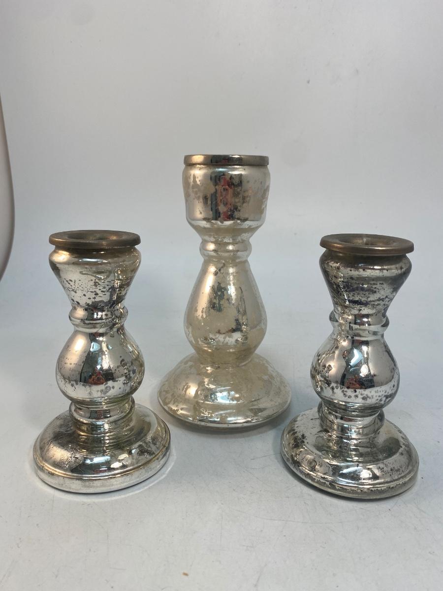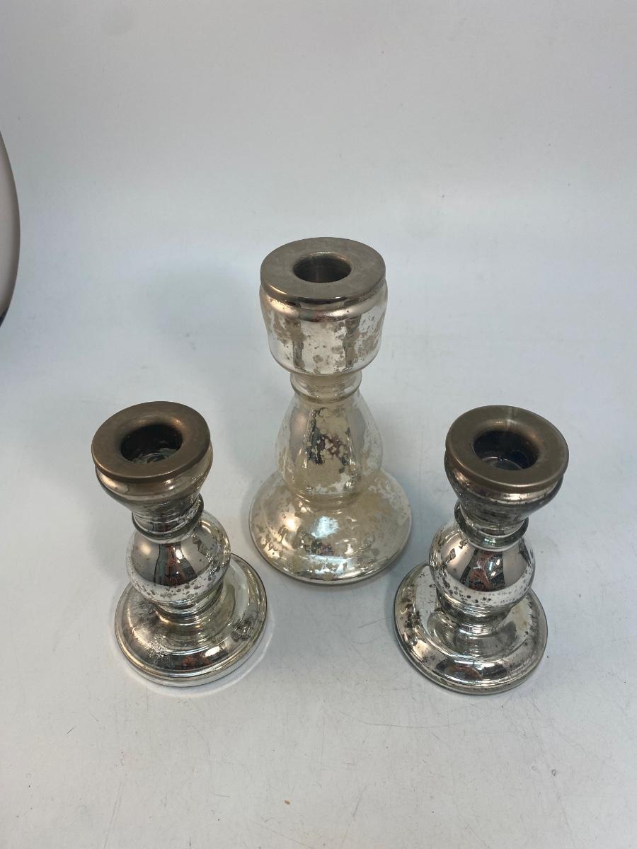 Set of 3 Mercury Glass Style Candlestick Holders. Two are matching. All have metal inserts to keep the glass from getting too hot when the candle has burnt down. Under 6" size.