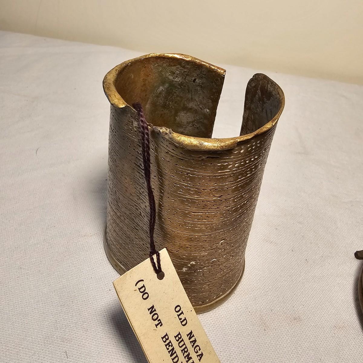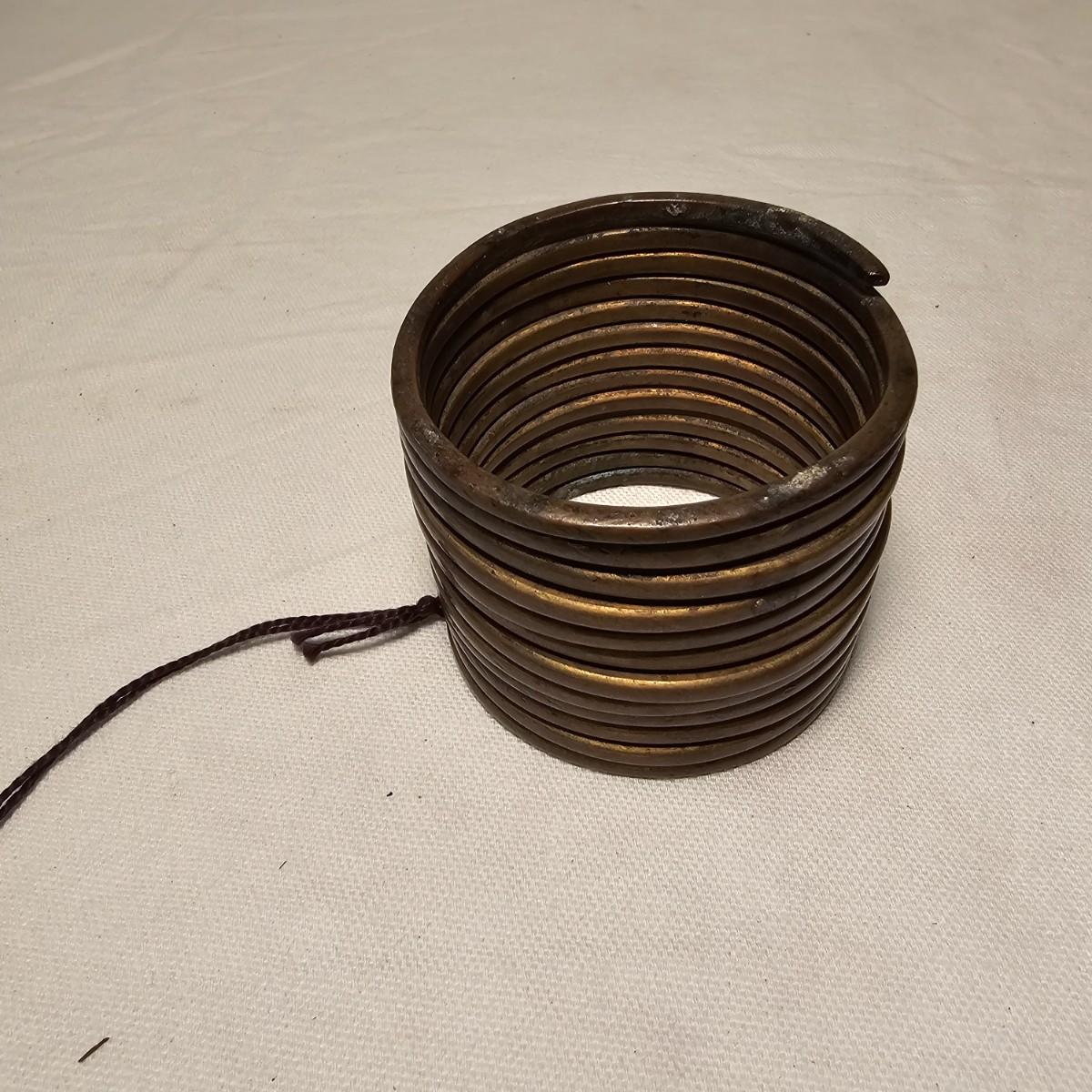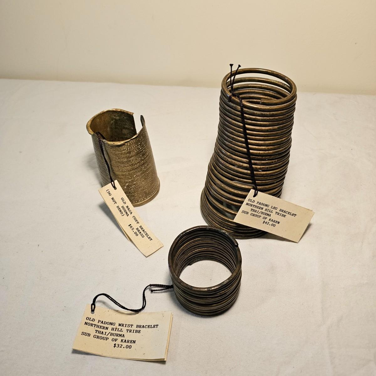 A trio of three metal bracelets, presumably from Burma. Two coiled items are bronze and the cuff is brass. Small coil is 2.25"D x 2"H. Large coil is 3.25"D x 6"H. Brass cuff is 2.5" x 3" x 3.5"H. Cuff has some broken and missing edges, it is engraved on sides. Coils show patina and some wear and verdigris from age. Tags on items are from client, may or may not reflect true origins. See photos for details. Shipping available.