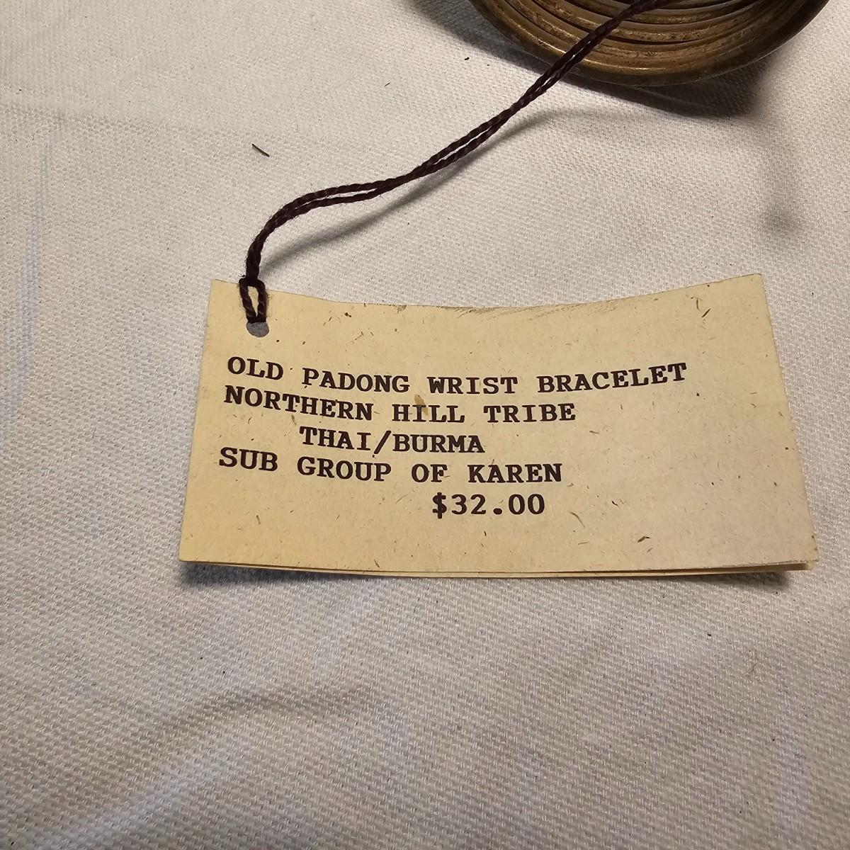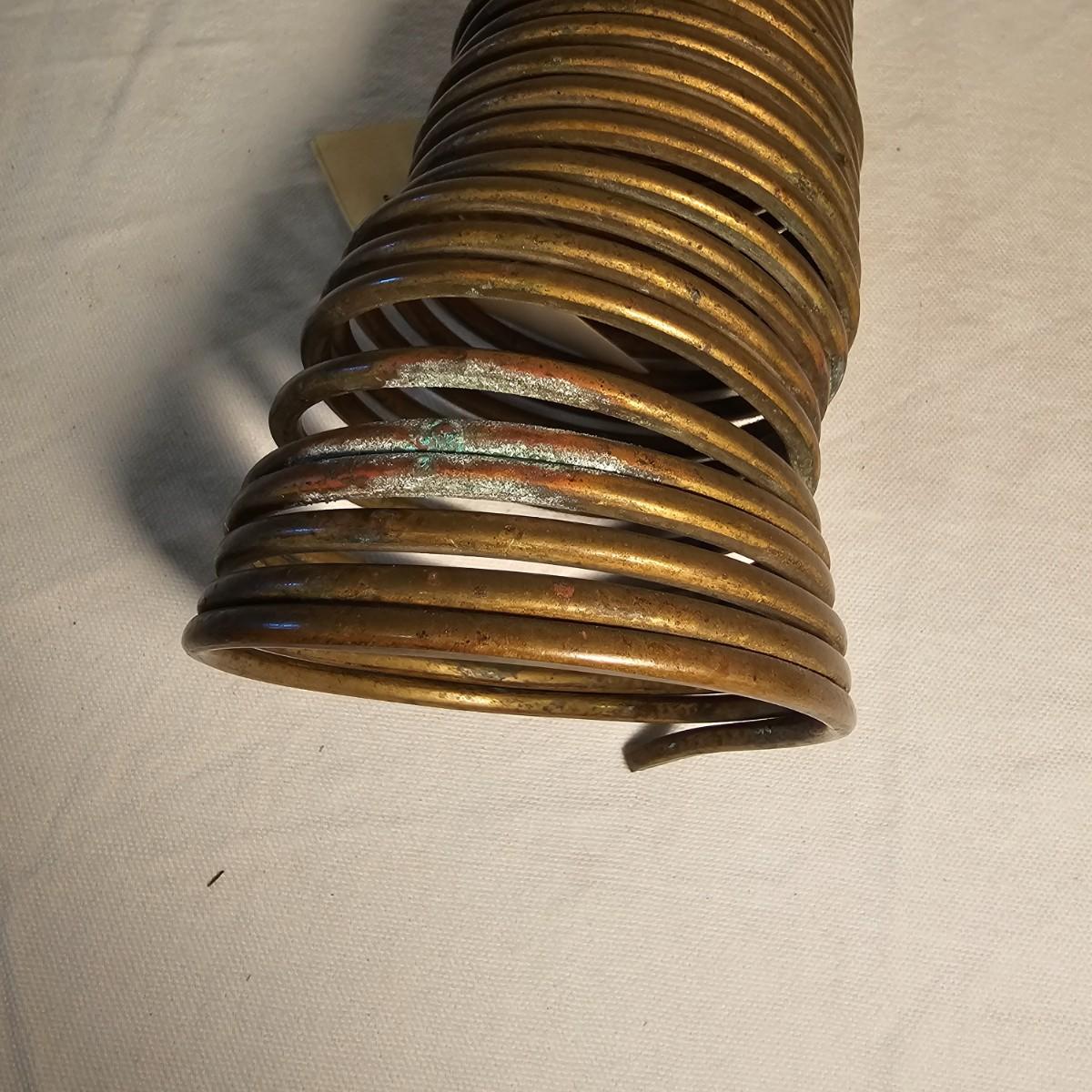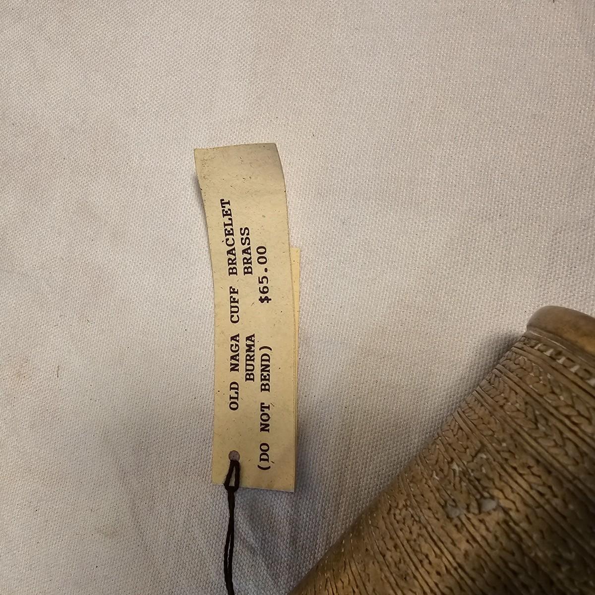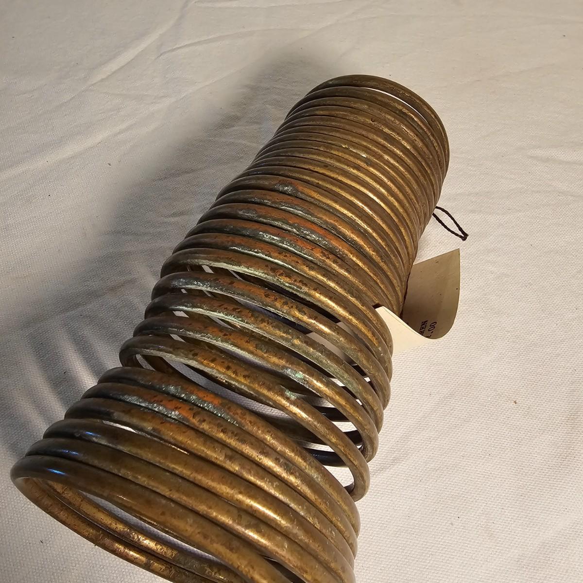 A trio of three metal bracelets, presumably from Burma. Two coiled items are bronze and the cuff is brass. Small coil is 2.25"D x 2"H. Large coil is 3.25"D x 6"H. Brass cuff is 2.5" x 3" x 3.5"H. Cuff has some broken and missing edges, it is engraved on sides. Coils show patina and some wear and verdigris from age. Tags on items are from client, may or may not reflect true origins. See photos for details. Shipping available.