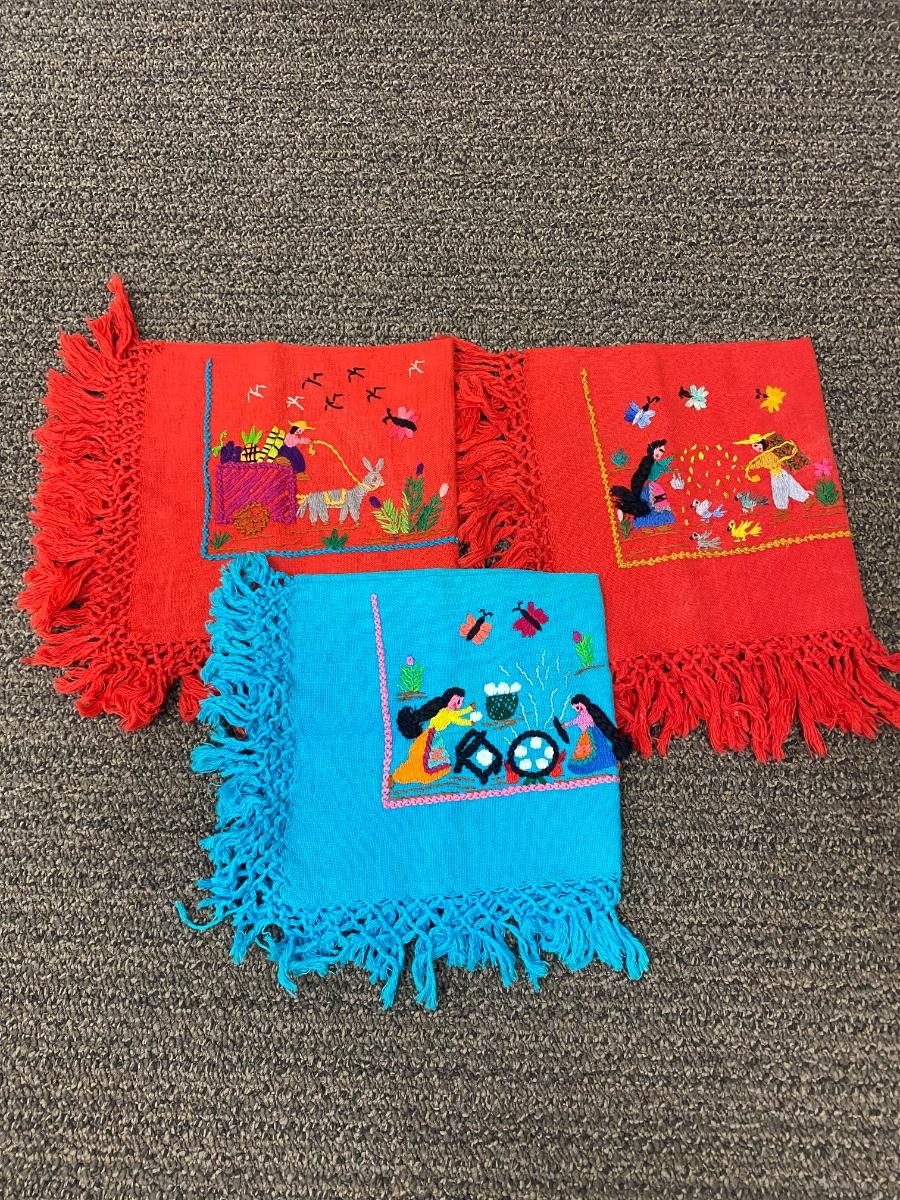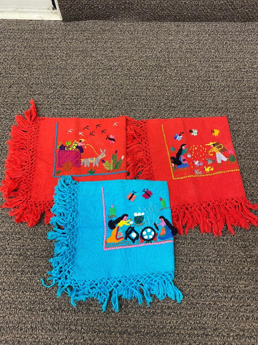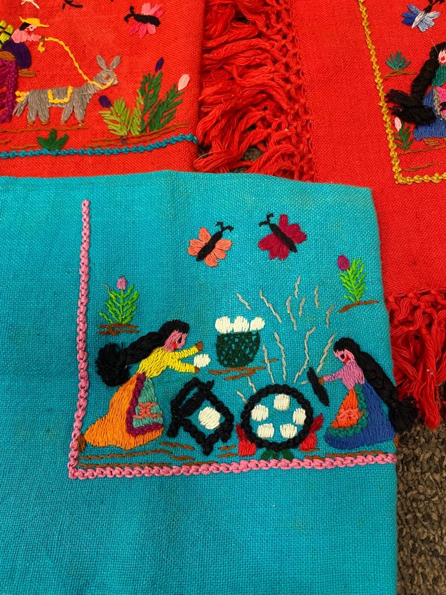 Set of 3 fringed edge linen napkins, hand embroidered from Mexico. Each one has a different image. In good vintage condition. About 10" square.
