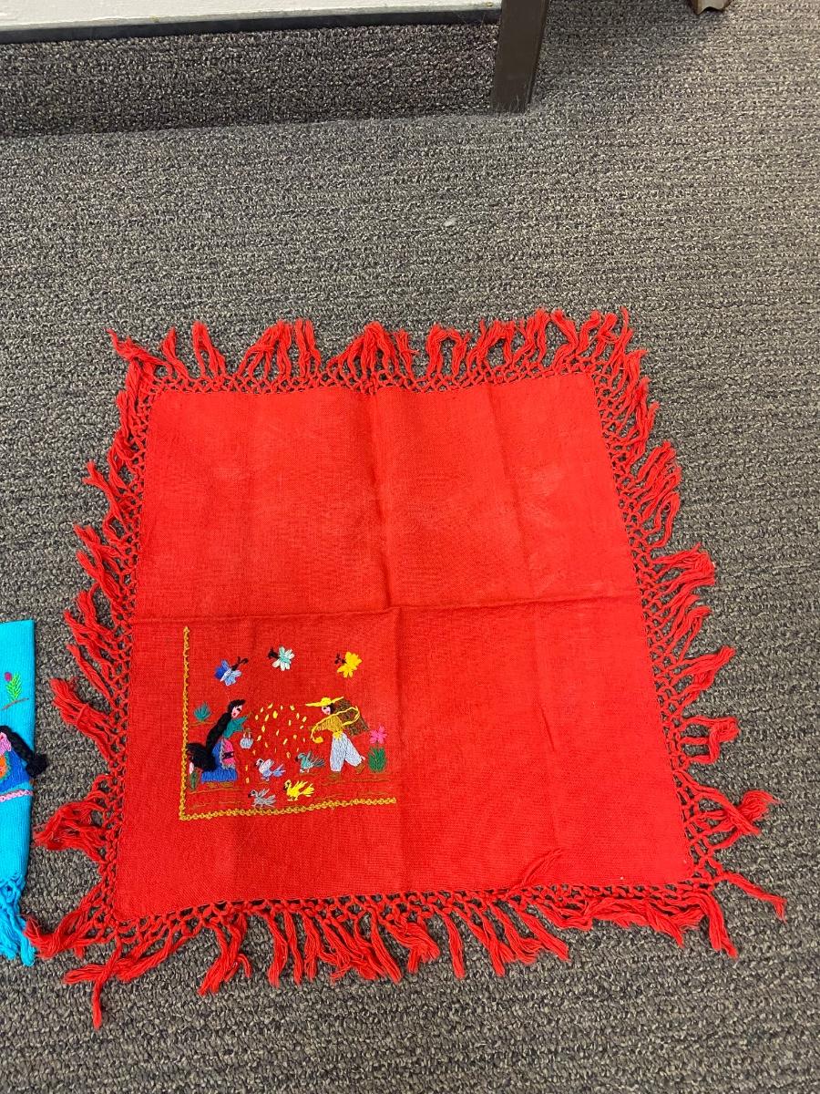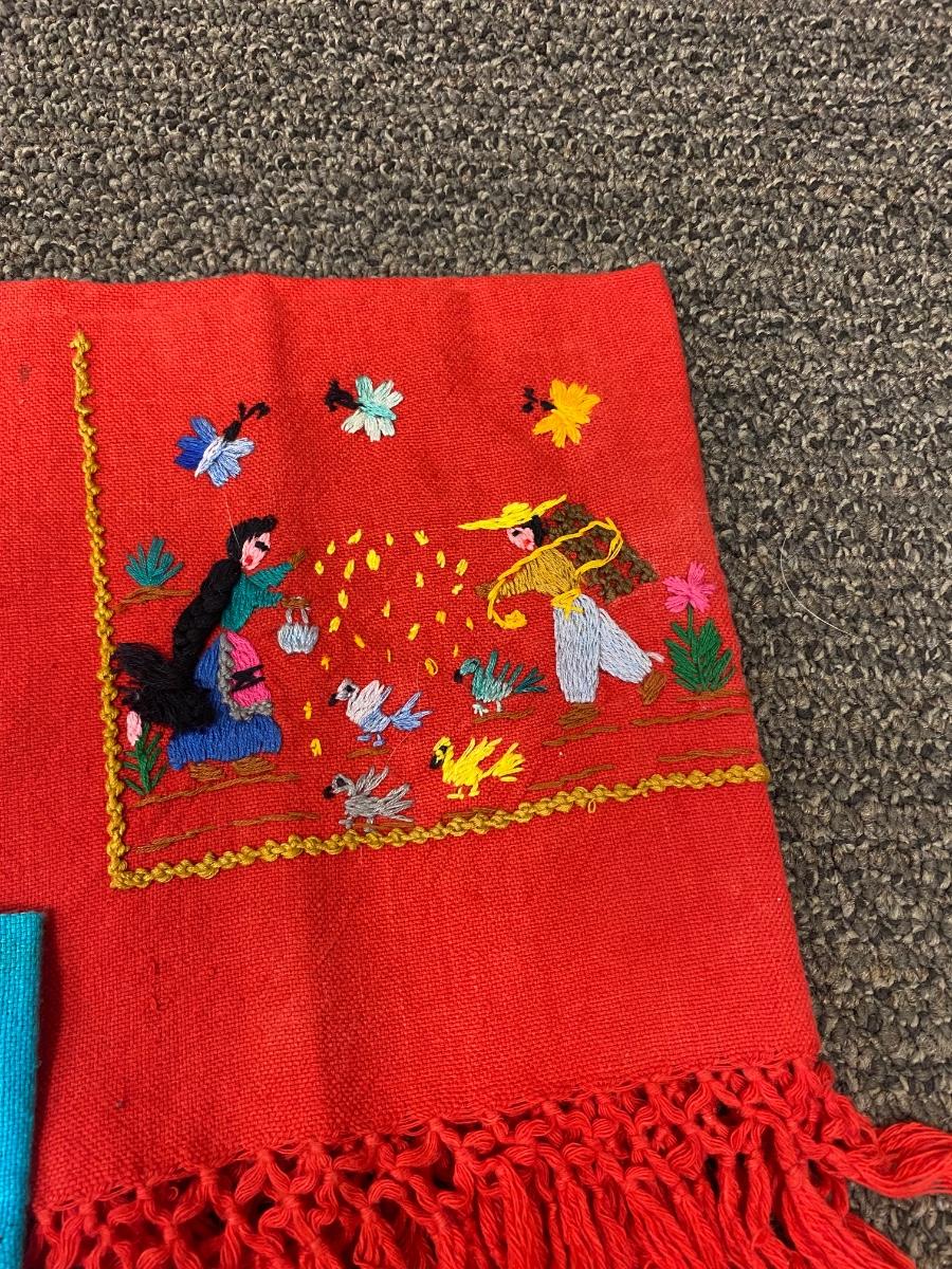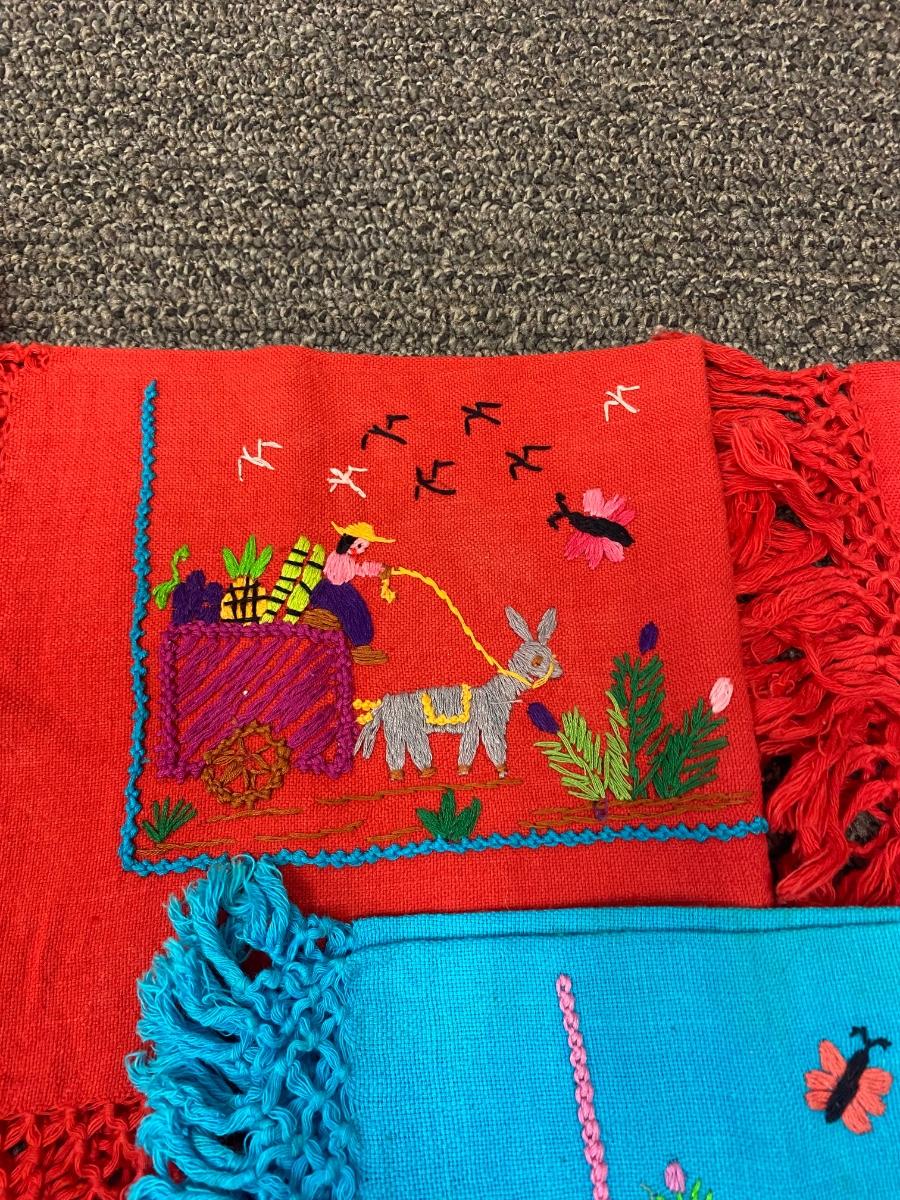 Set of 3 fringed edge linen napkins, hand embroidered from Mexico. Each one has a different image. In good vintage condition. About 10" square.