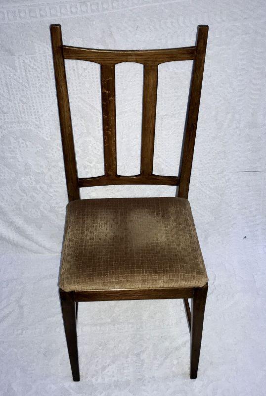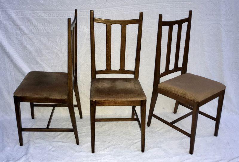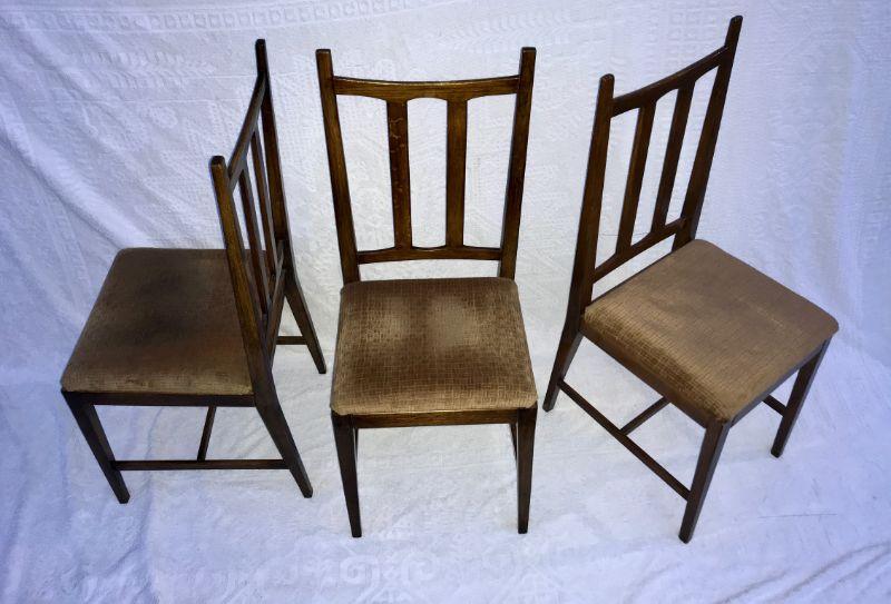 Set of 3 mid century dining chairs. Padded seats. Fabric on seats is worn. Great for a refinish project.
