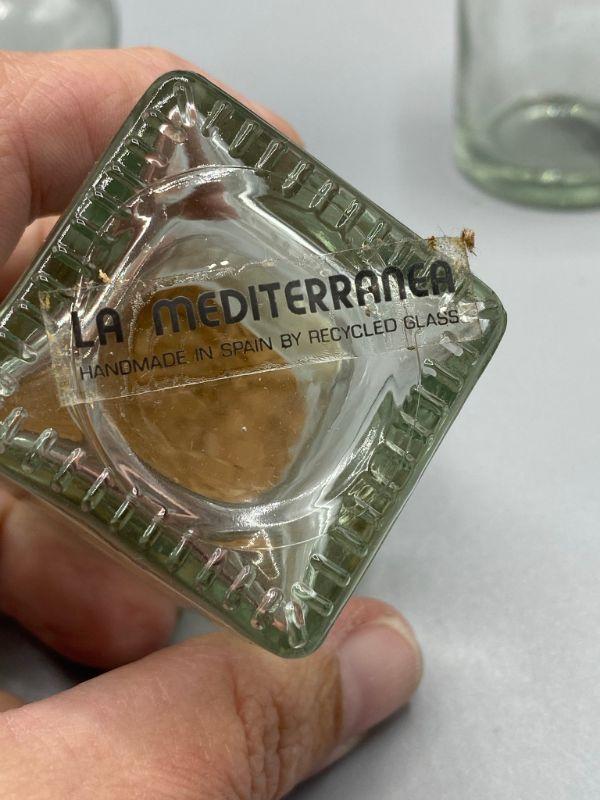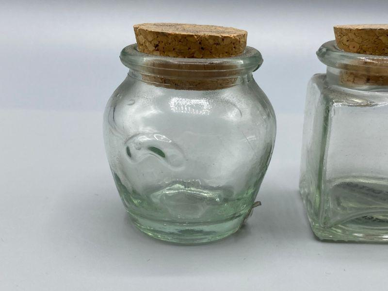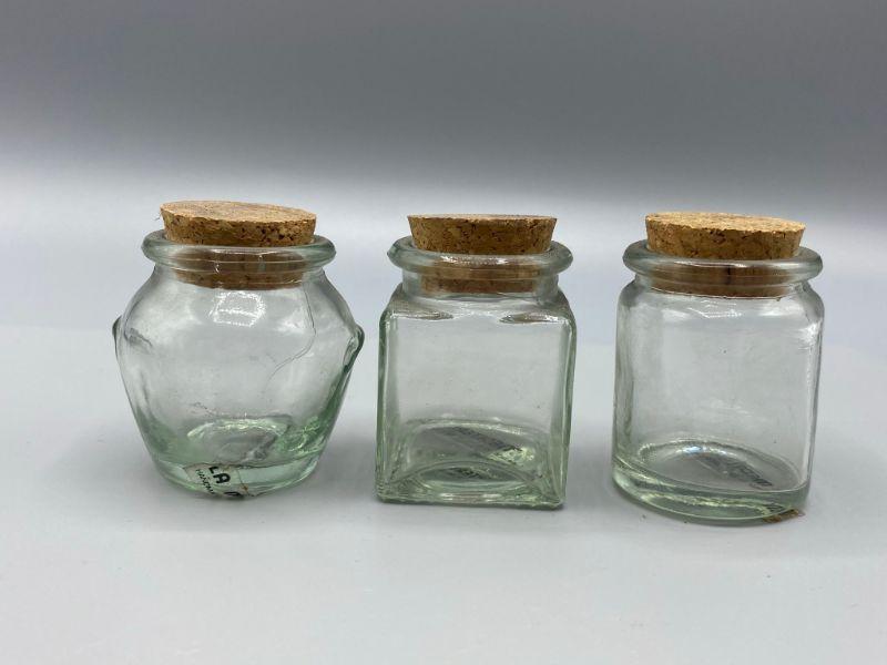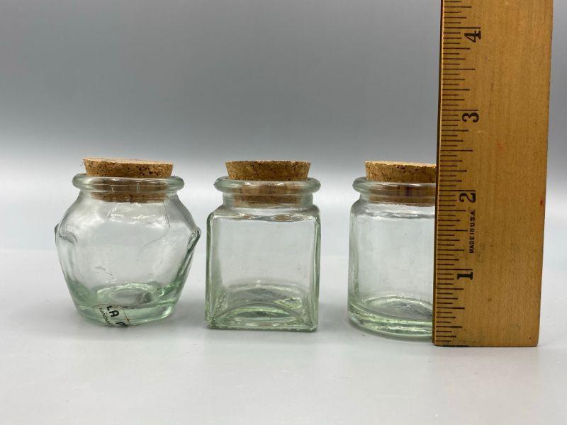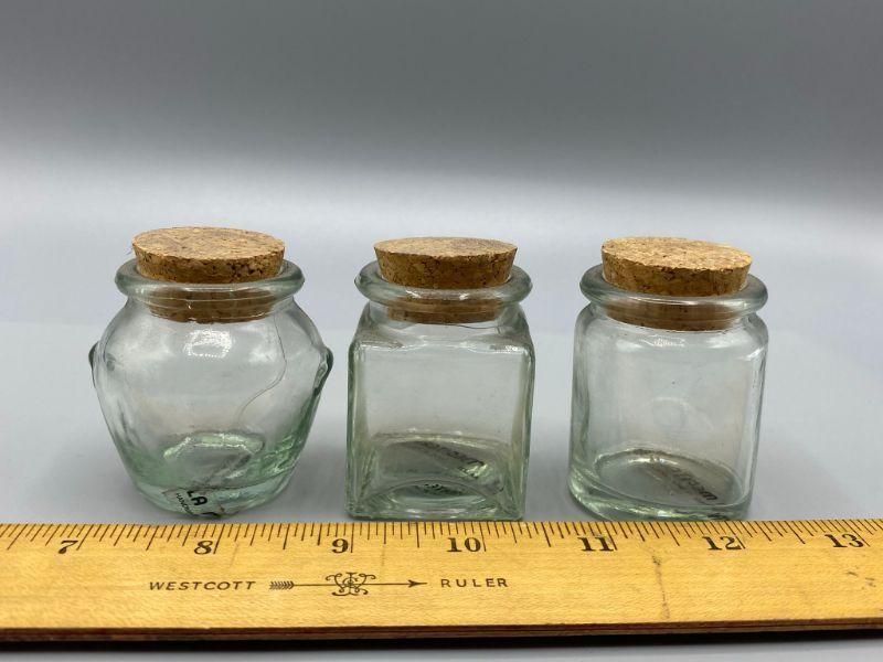 Set of 3 miniature corked top bottles. Different shapes. Great for display either empty or filled. Corks fit tightly. Hand made in Spain with recycled glass. About 2" size.