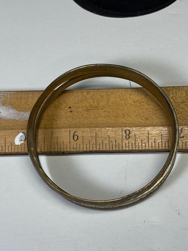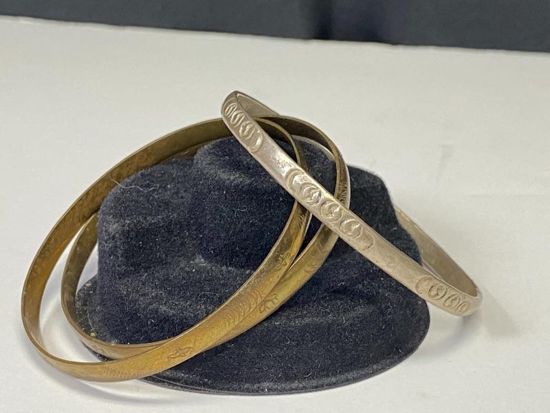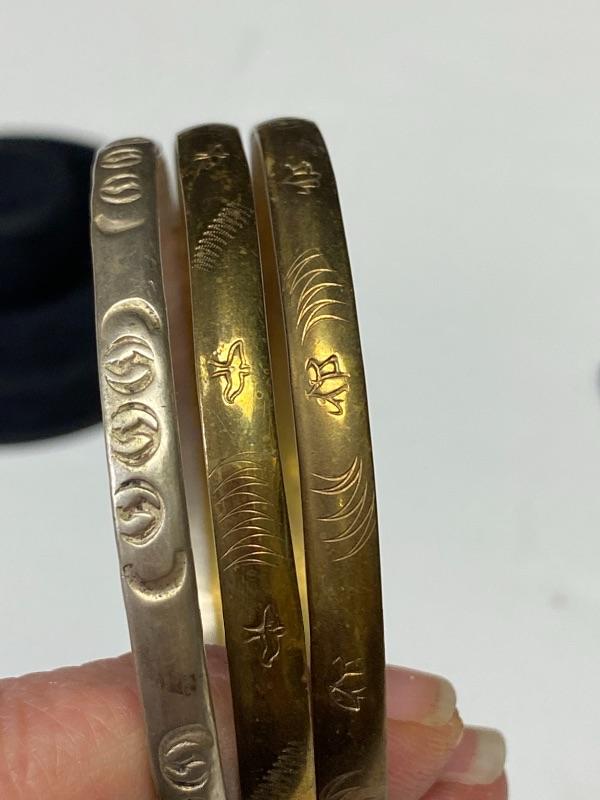 Set of 3 mixed metals bangle bracelets. Stamped designs on all 3. The gold tone ones look similar to brass, they say 14k, but jeweler inspected and they are not. The silver one is partially stamped Mexico, believe to be a low grade silver or plated.