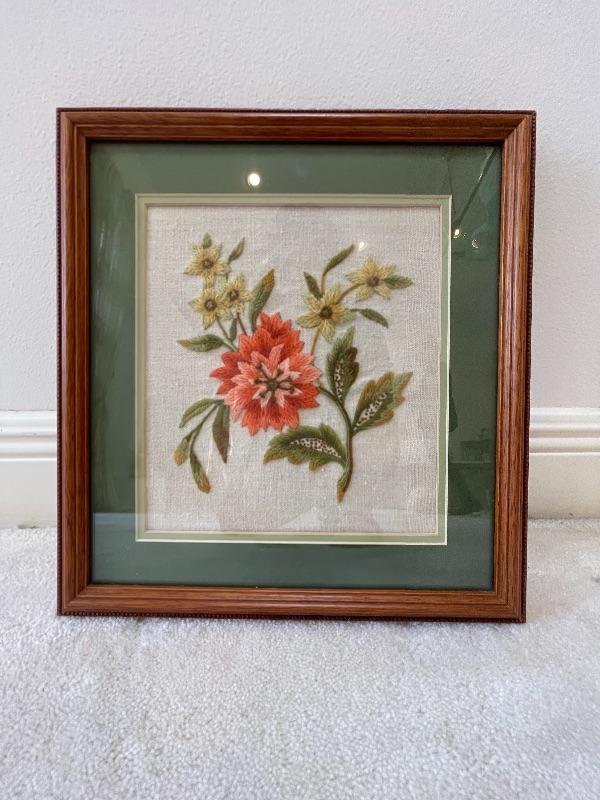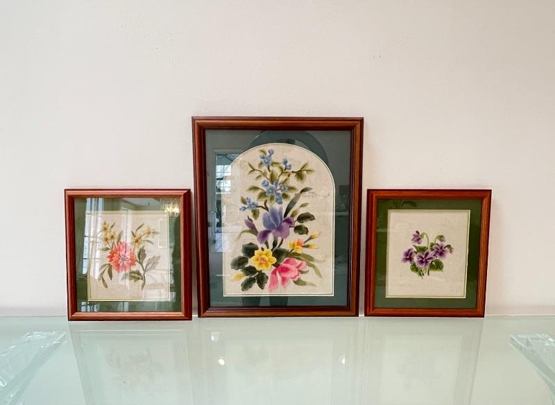 Set of 3 Hand Sewn Needlepoint/Embroidered Framed Floral Pieces