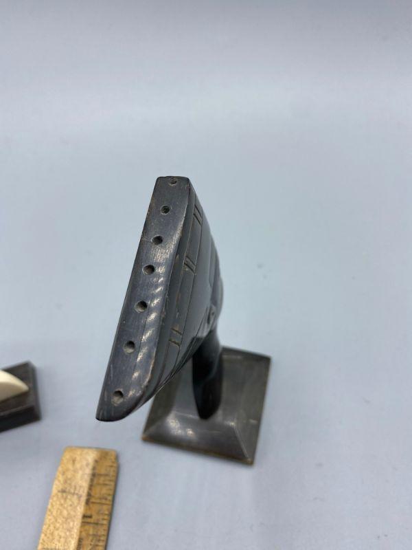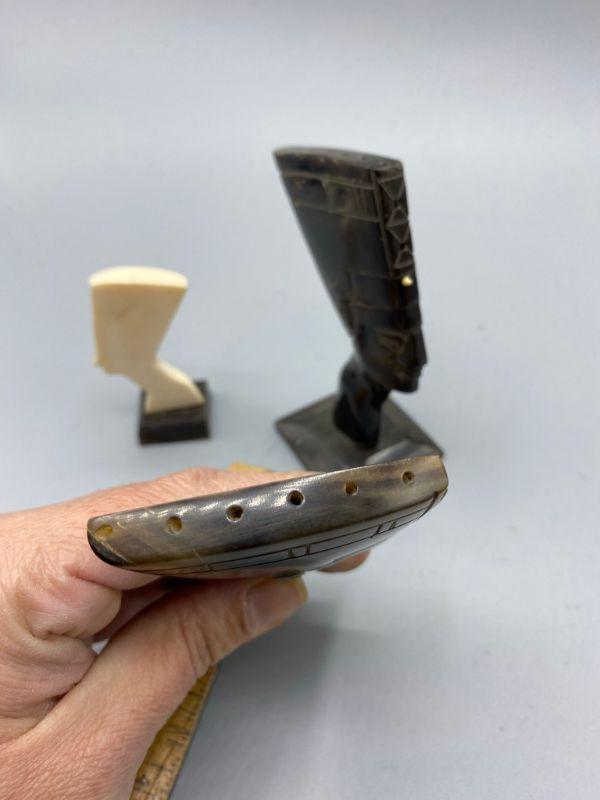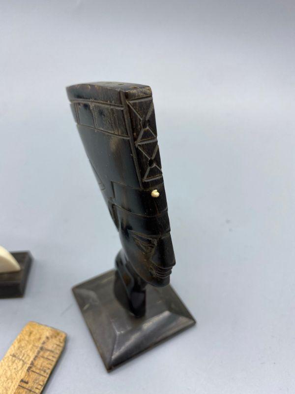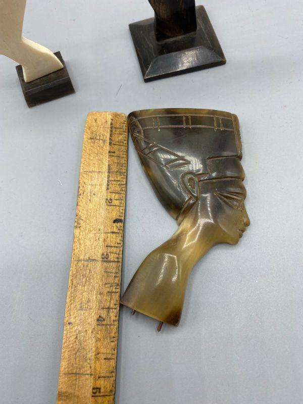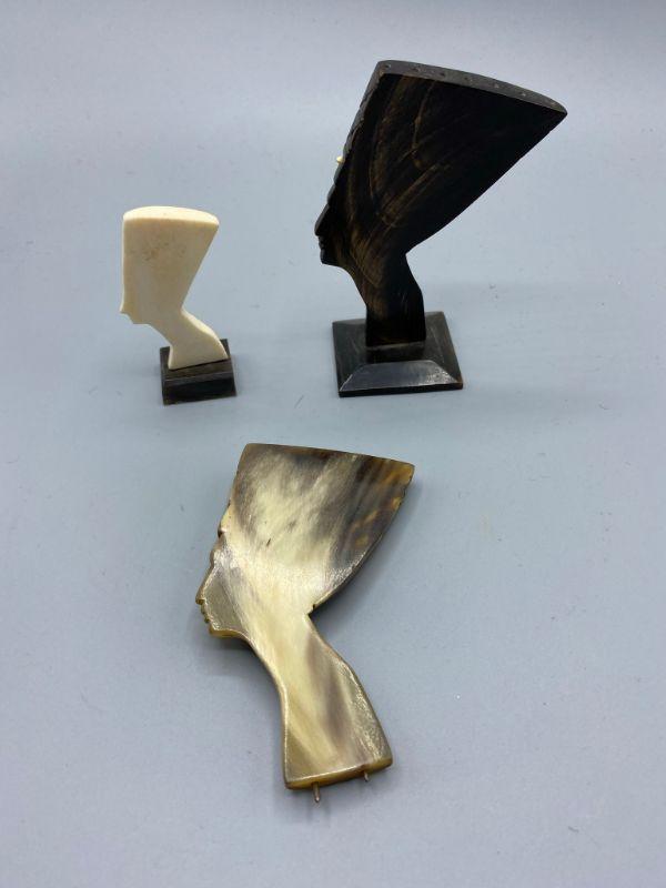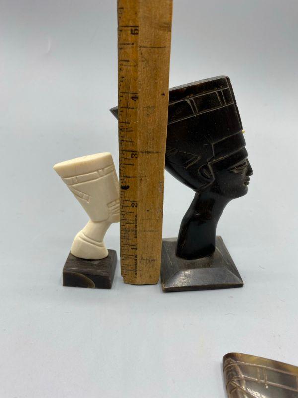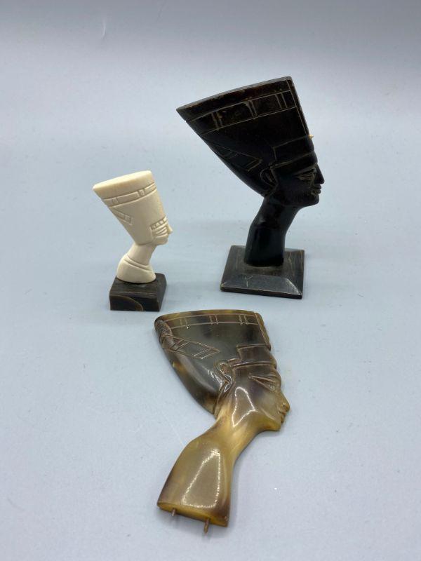 Set of 3 Egyptian Queen Nefertiti busts. One is missing the base. They feel like a plastic or resin not stone. Age and origin unknown. Display nicely. 3" to 4" size.